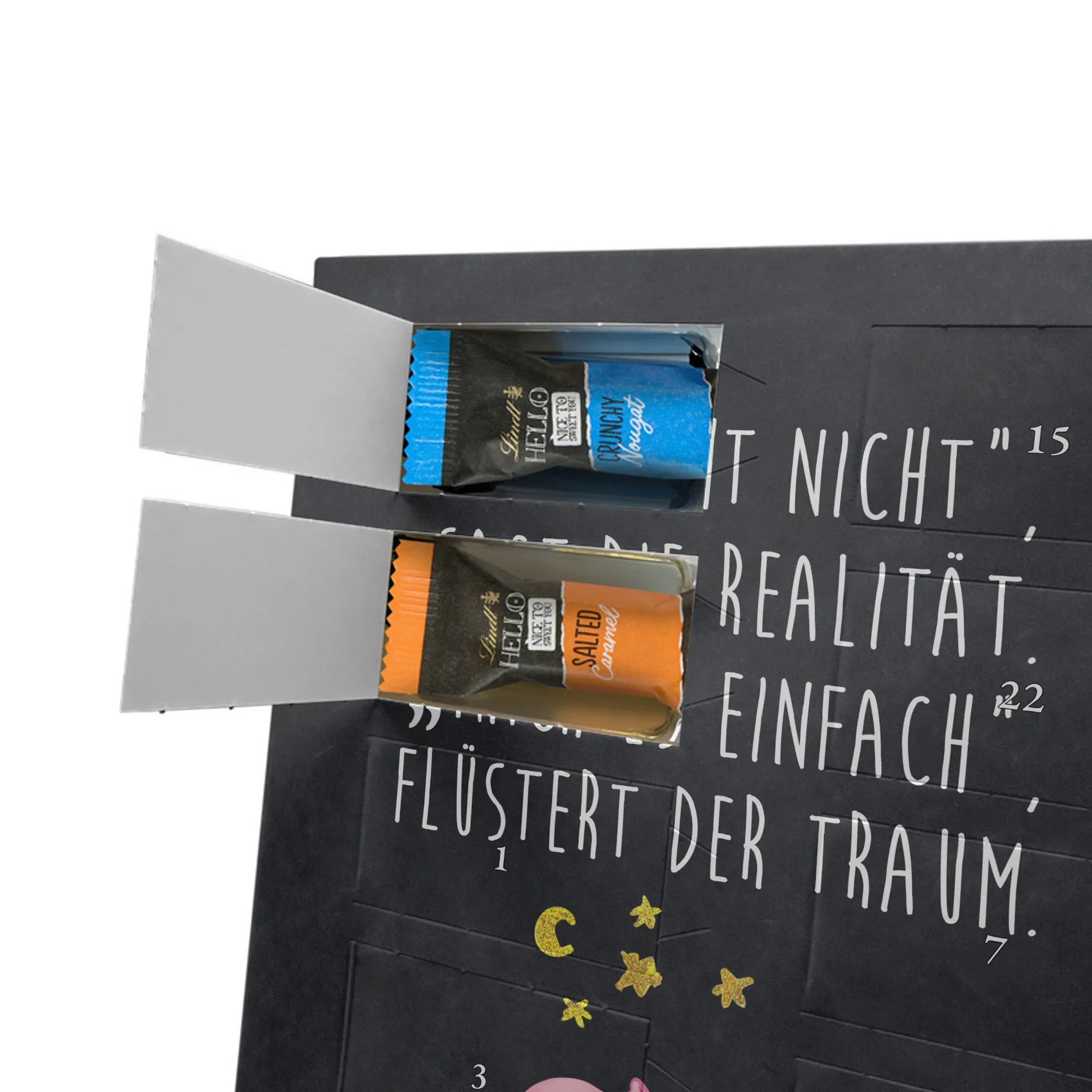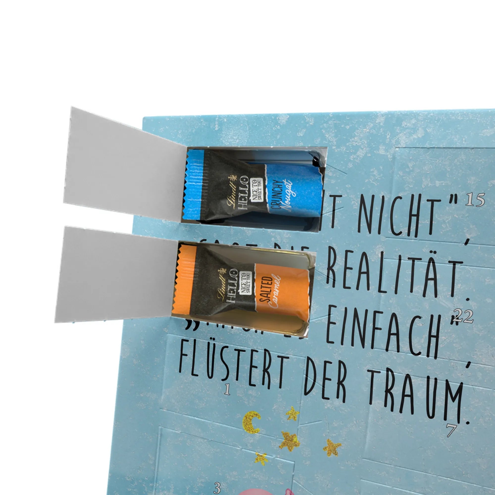 Verschenke Vorfreude: Unser individueller Foto-Adventskalender mit Schokolade von Mr. & Mrs. Panda macht jeden Dezembertag zum kleinen Fest. Der Kalender kombiniert bezaubernde Illustrationen und Sprüche von Mr. & Mrs. Panda mit deinem eigenen Foto – so entsteht ein ganz persönliches Geschenk. Achte auf Bildqualität und Bildausschnitt, damit das Foto optimal zur Geltung kommt, und nutze nur Bilder, für die du die Rechte besitzt. Die hochwertige seidenmatte Oberfläche mit bedruckten Seitenflächen veredelt das Design. Maße: 325 mm x 225 mm x 27 mm. Gefüllt mit Lindt Hello Schokolade: 24 einzeln verpackte Mini Sticks in den Sorten Karamell-Schokoladenkuchen, Kekse, Knuspriger Nougat und Erdbeer-Cheesecake. Zutaten und Allergene findest du auf der Verpackung; enthalten sind z. B. Milcheiweiß, Milchzucker, Soja, Weizen und Haselnüsse. Besonderheit: Du kannst den Kalender aufstellen oder an der Wand aufhängen. Bitte beachten: Die Fotos werden weder aufbereitet noch zugeschnitten – personalisierte Foto-Artikel sind vom Rückgaberecht ausgeschlossen. Hol dir ein Stück Adventszauber mit deinem persönlichen Foto-Adventskalender!