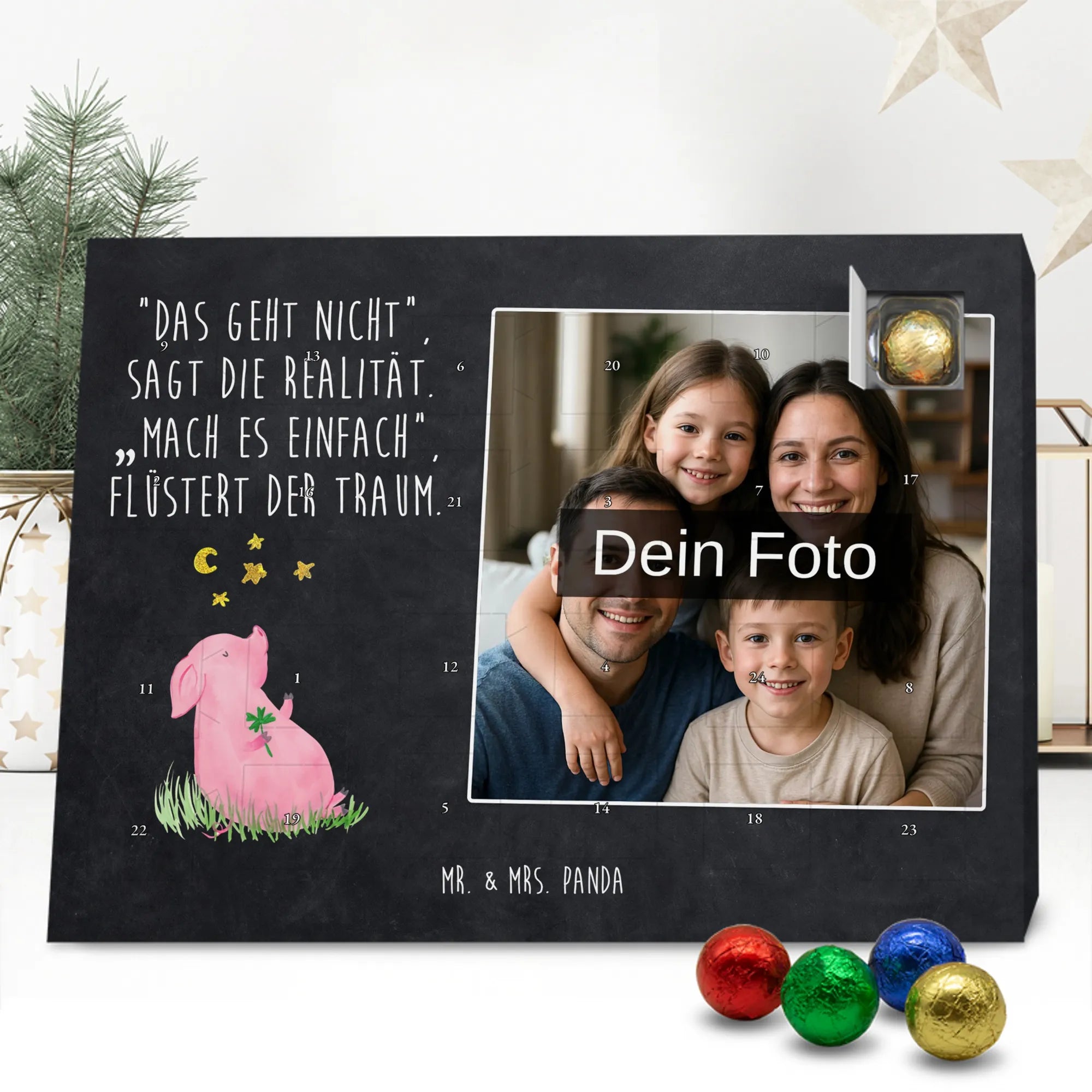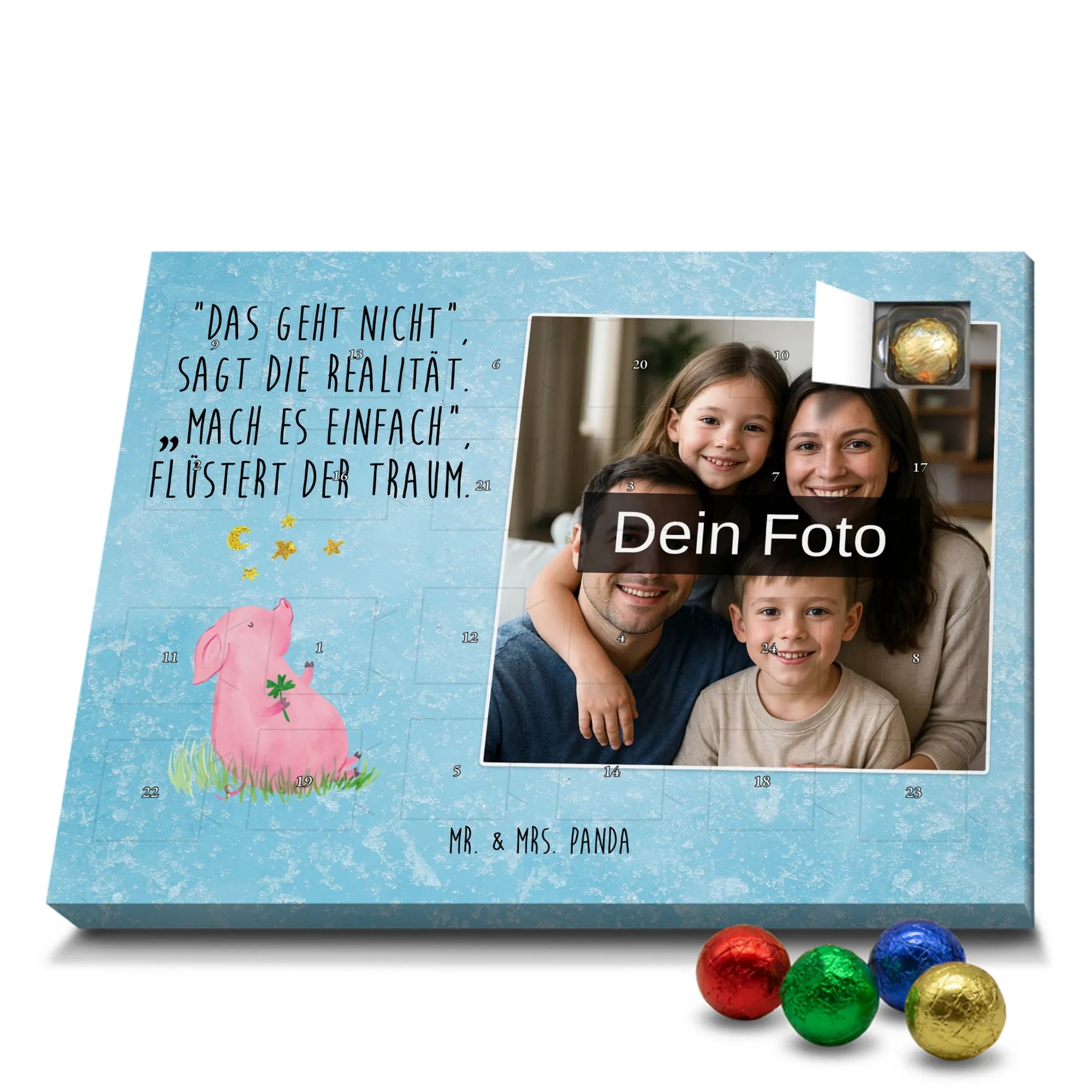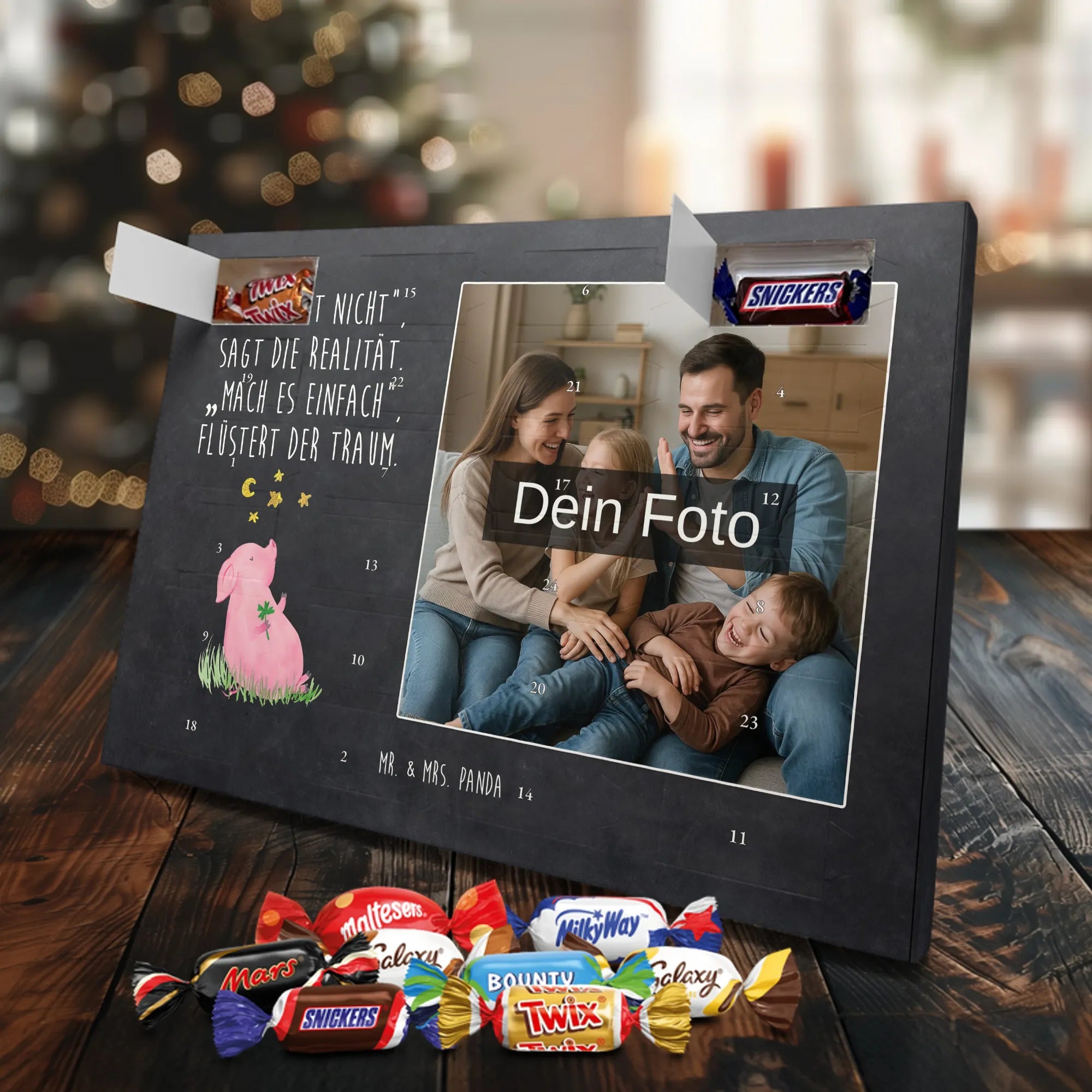 Liebevoller Foto Adventskalender personalisiert von Mr. & Mrs. Panda – der perfekte Begleiter durch die Adventszeit. Bedruckt mit unseren beliebten Motiven & Sprüchen, kannst du den Kalender mit einem persönlichen Foto versehen. Achte auf hohe Auflösung und einen passenden Bildausschnitt, damit das Motiv optimal zur Geltung kommt. Verwende nur Bilder, für die du die Rechte besitzt, um rechtliche Probleme zu vermeiden. Der Kalender bietet brillante Druckqualität, eine seidenmatte Oberflächenveredelung und bedruckte Seitenflächen. Maße: 233 mm x 178 mm x 24 mm. Besonderheit: Er lässt sich sowohl aufstellen als auch aufhängen. Bitte beachte: Die Fotos werden weder aufbereitet noch zugeschnitten, daher ist eine Rücknahme bei personalisierten Foto-Artikeln ausgeschlossen. Gefüllt mit MARKENNAMEN Schokolade und leckeren Schokoladenkugeln. Hinweis: Kann Spuren von Haselnüssen, Mandeln, Gluten und Soja enthalten. Kühl und trocken lagern. Schenke persönliche Vorfreude – jeden Tag ein kleines Highlight mit Schokolade und Erinnerungen.