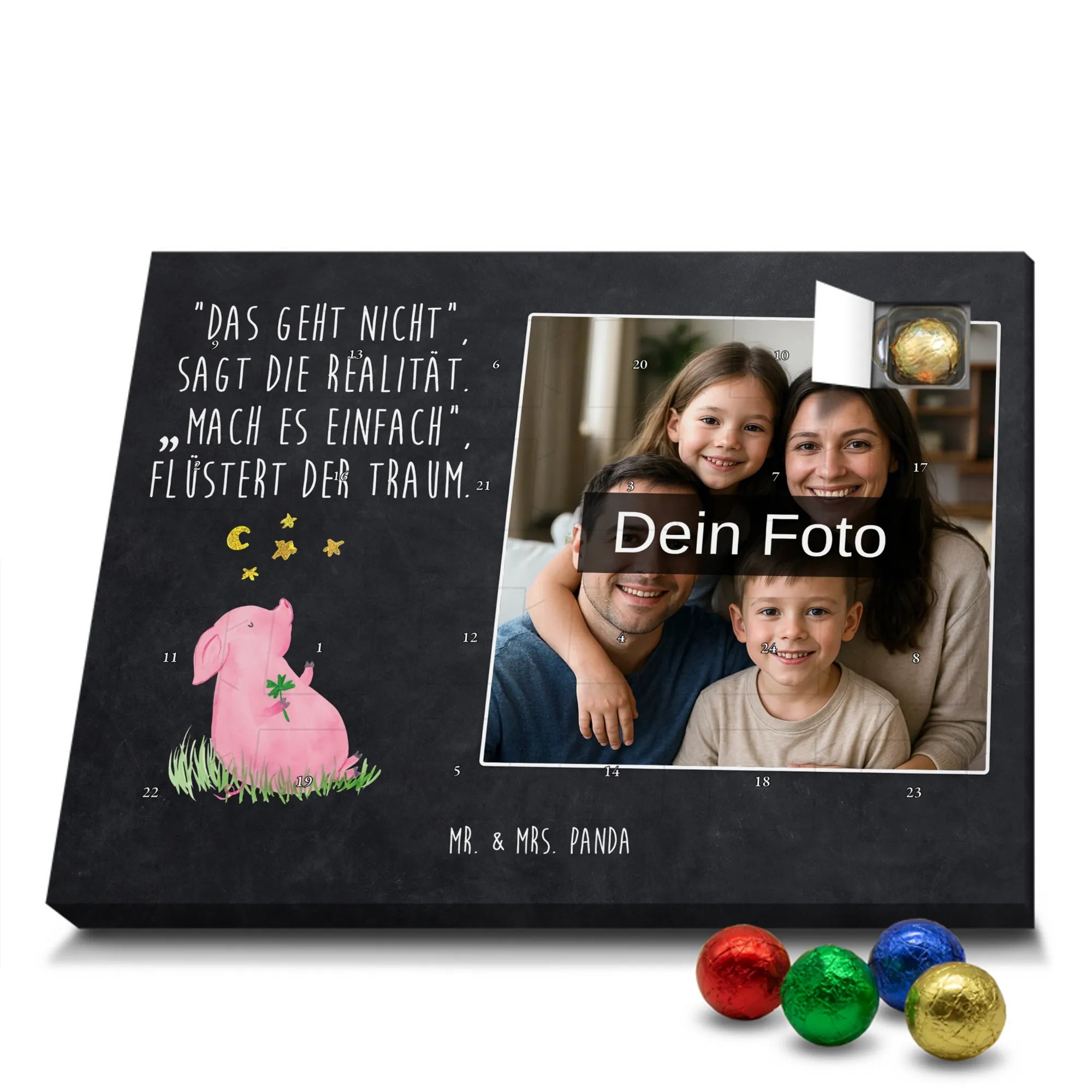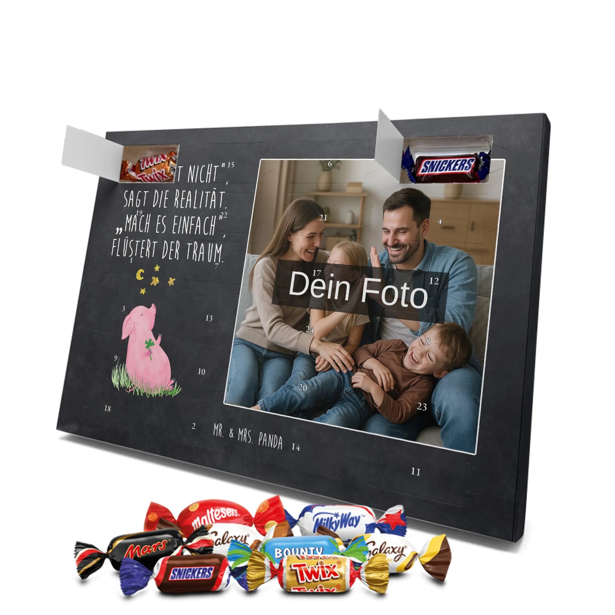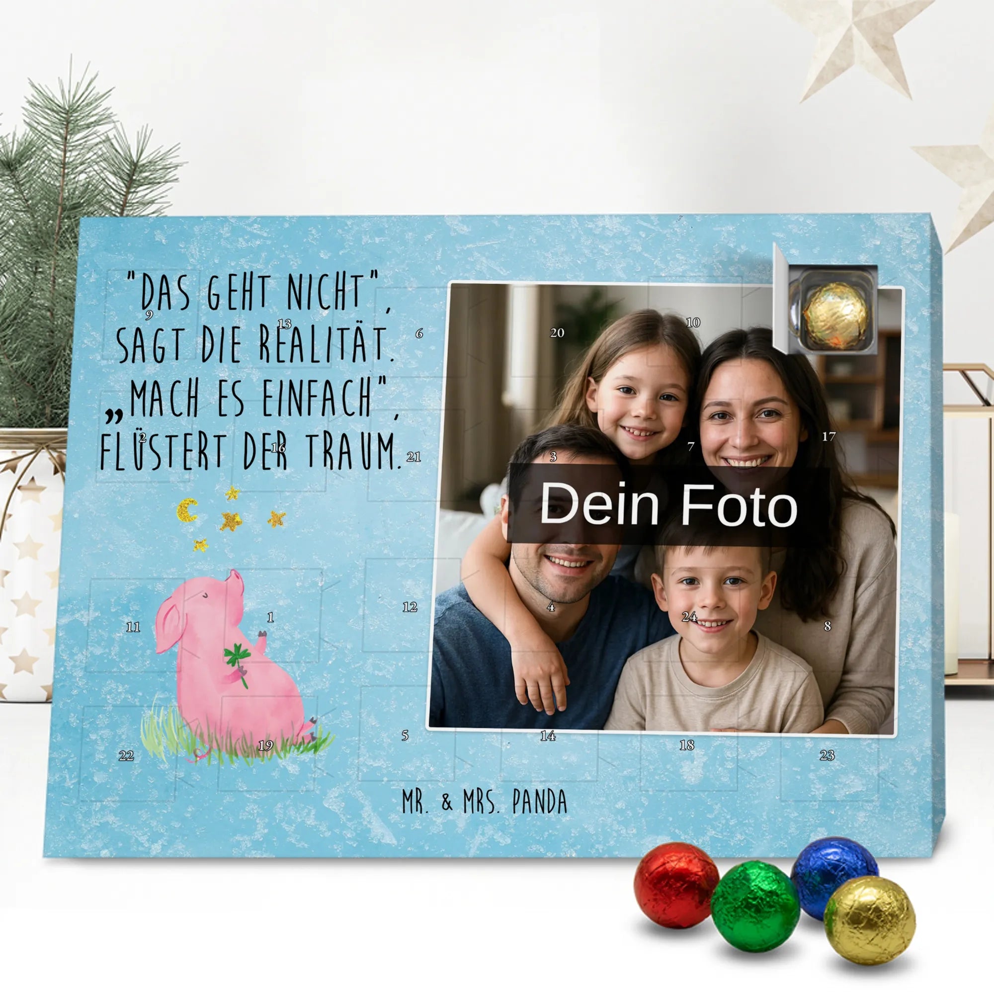 Liebevoller Foto Adventskalender personalisiert von Mr. & Mrs. Panda – der perfekte Begleiter durch die Adventszeit. Bedruckt mit unseren beliebten Motiven & Sprüchen, kannst du den Kalender mit einem persönlichen Foto versehen. Achte auf hohe Auflösung und einen passenden Bildausschnitt, damit das Motiv optimal zur Geltung kommt. Verwende nur Bilder, für die du die Rechte besitzt, um rechtliche Probleme zu vermeiden. Der Kalender bietet brillante Druckqualität, eine seidenmatte Oberflächenveredelung und bedruckte Seitenflächen. Maße: 233 mm x 178 mm x 24 mm. Besonderheit: Er lässt sich sowohl aufstellen als auch aufhängen. Bitte beachte: Die Fotos werden weder aufbereitet noch zugeschnitten, daher ist eine Rücknahme bei personalisierten Foto-Artikeln ausgeschlossen. Gefüllt mit MARKENNAMEN Schokolade und leckeren Schokoladenkugeln. Hinweis: Kann Spuren von Haselnüssen, Mandeln, Gluten und Soja enthalten. Kühl und trocken lagern. Schenke persönliche Vorfreude – jeden Tag ein kleines Highlight mit Schokolade und Erinnerungen.