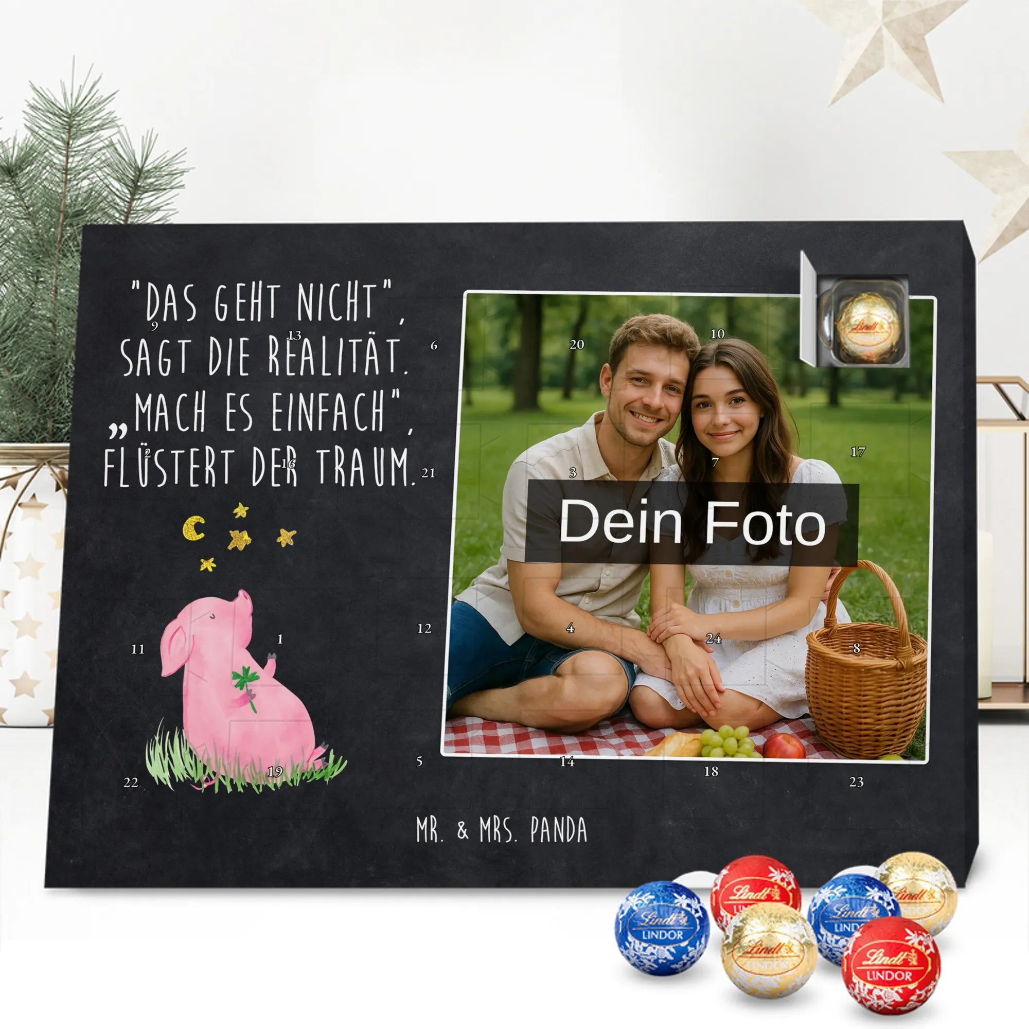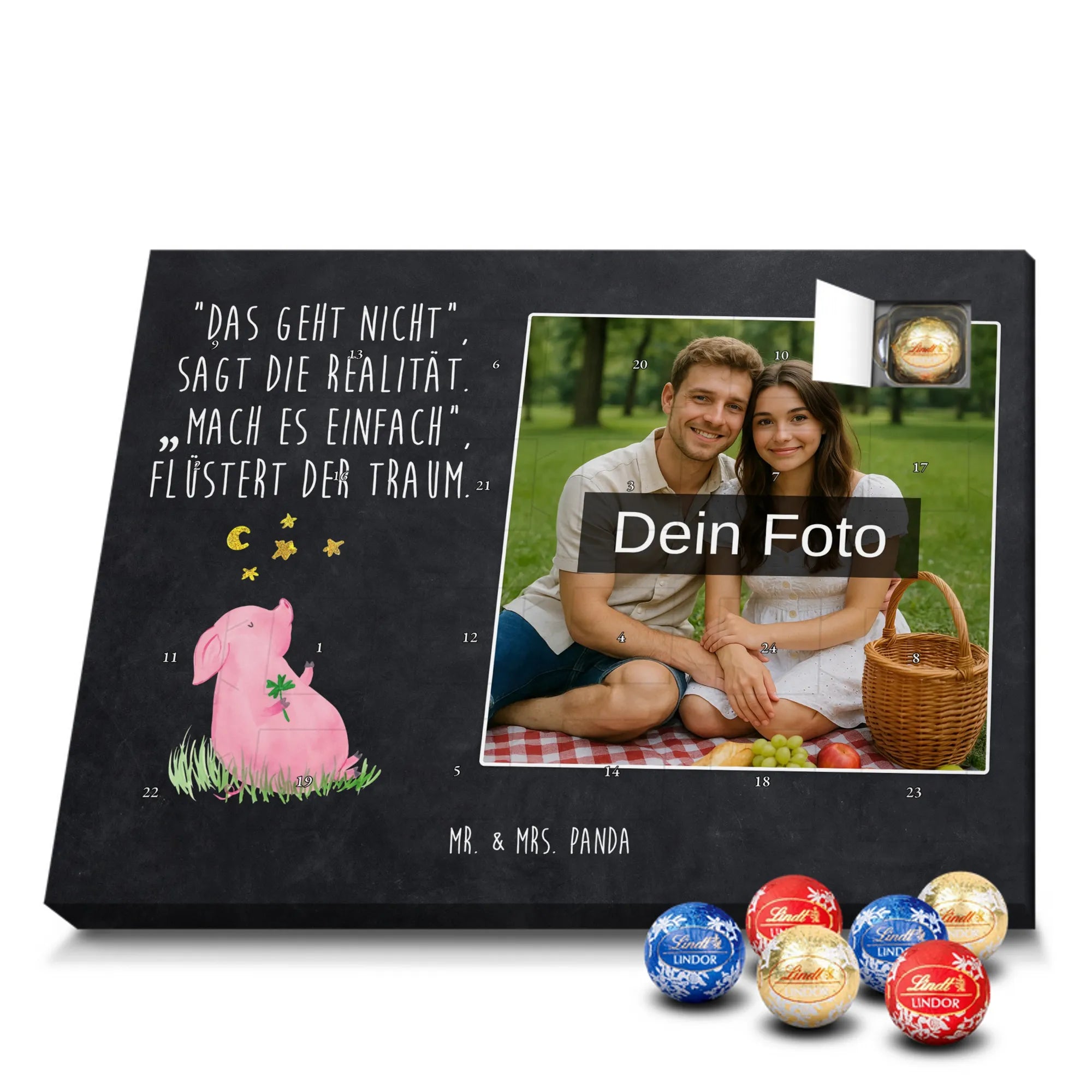 Unser bezaubernder Personalisierter Schokoladen Foto Adventskalender von Mr. & Mrs. Panda bringt persönliche Freude in die Vorweihnachtszeit. Du lädst ein Foto hoch, wir drucken es zusammen mit unseren liebevollen Illustrationen und Sprüchen – so entsteht ein ganz persönliches Geschenk. Achte auf hohe Bildqualität und darauf, dass der Bildausschnitt passt, denn wir nehmen keine Anpassungen am Foto vor. Die Verarbeitung ist hochwertig: seidenmatte Oberflächenveredelung, bedruckte Seitenflächen und eine stabile Konstruktion. Der Kalender kann sowohl aufgehängt als auch aufgestellt werden – flexibel und hübsch. Maße: 233 mm x 178 mm x 24 mm. Gefüllt mit Lindt Lindor Markenschokolade: 24 einzeln verpackte Markenschokoladen Kugeln, Sorten: Vollmilch, Feinherb und Weiße Schokolade. Zutatenhinweis: Zucker, pflanzliches Fett, Kakaobutter u.v.m.; kann Spuren von Haselnüssen und Mandeln enthalten. Wichtig: Lade nur Fotos hoch, für die du Nutzungsrechte hast; personalisierte Foto-Artikel sind vom Umtausch ausgeschlossen. Verschenke einen Advent mit Herz von Mr. & Mrs. Panda.