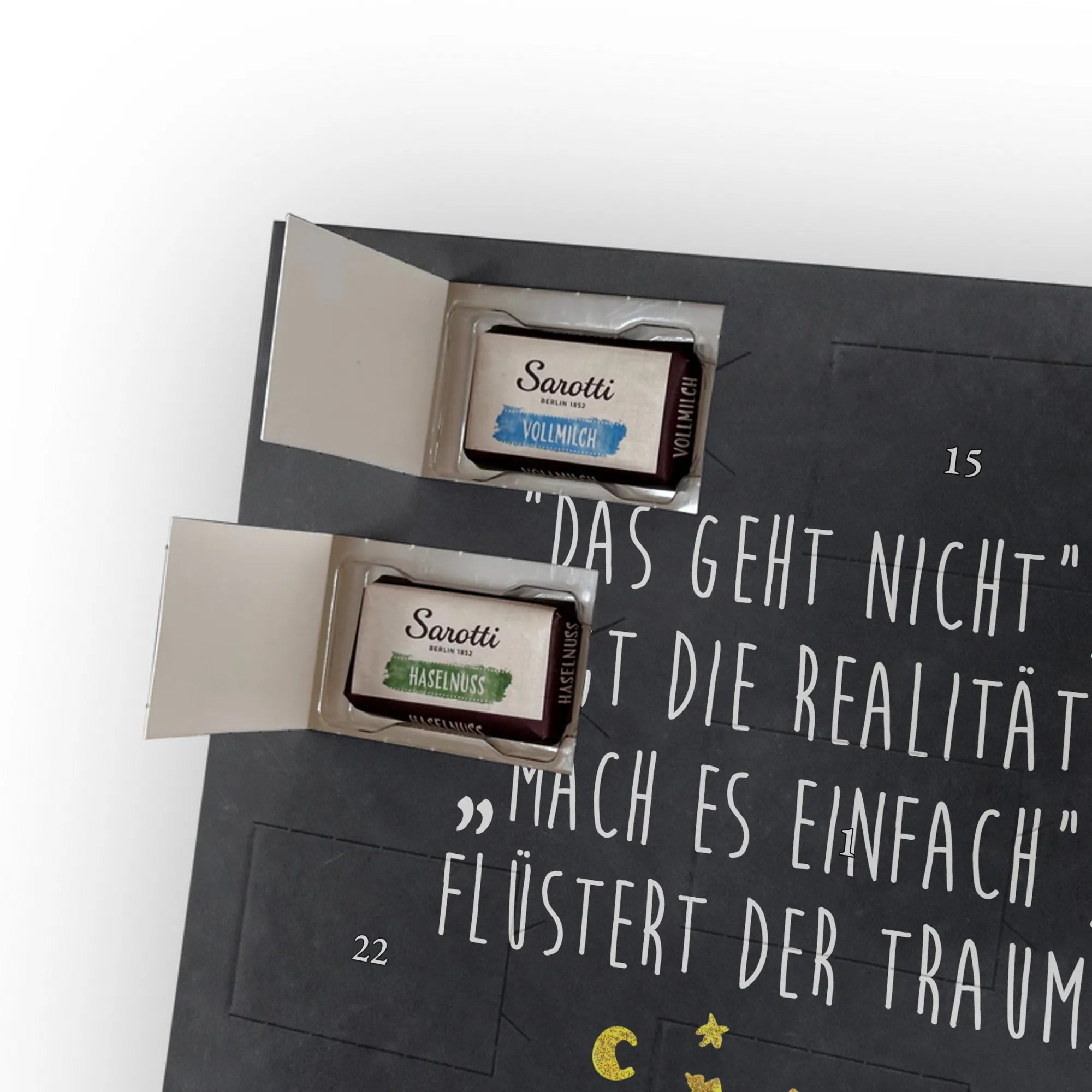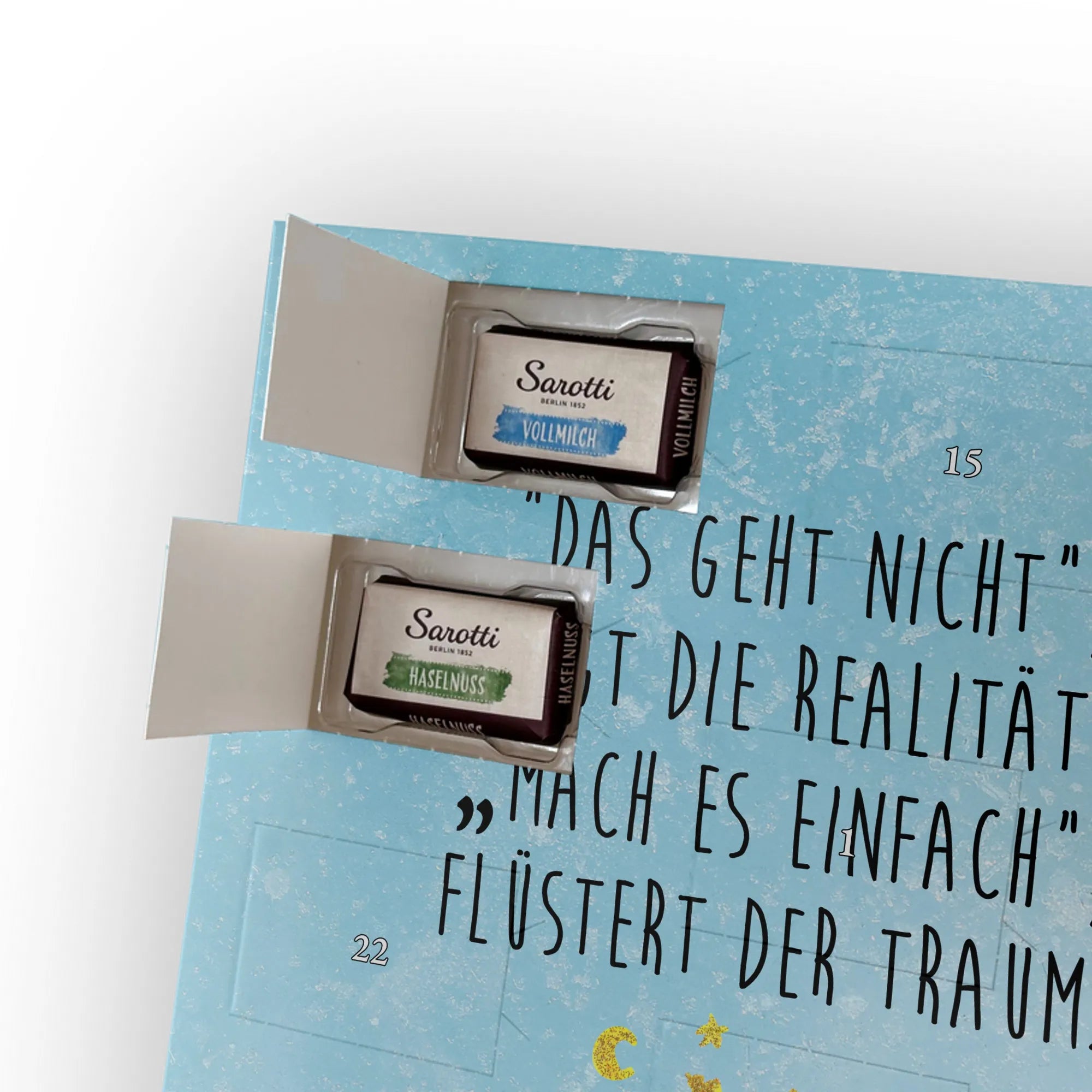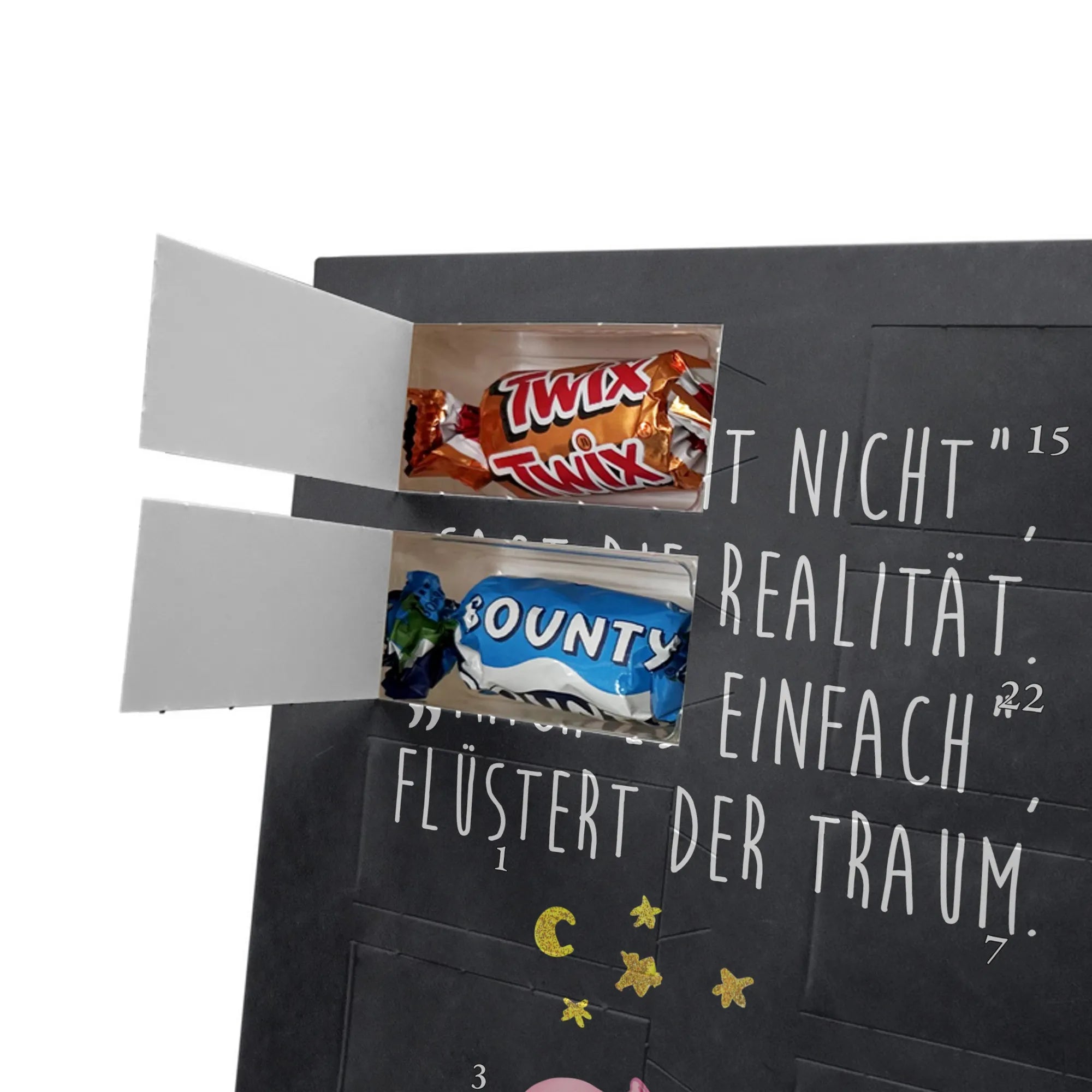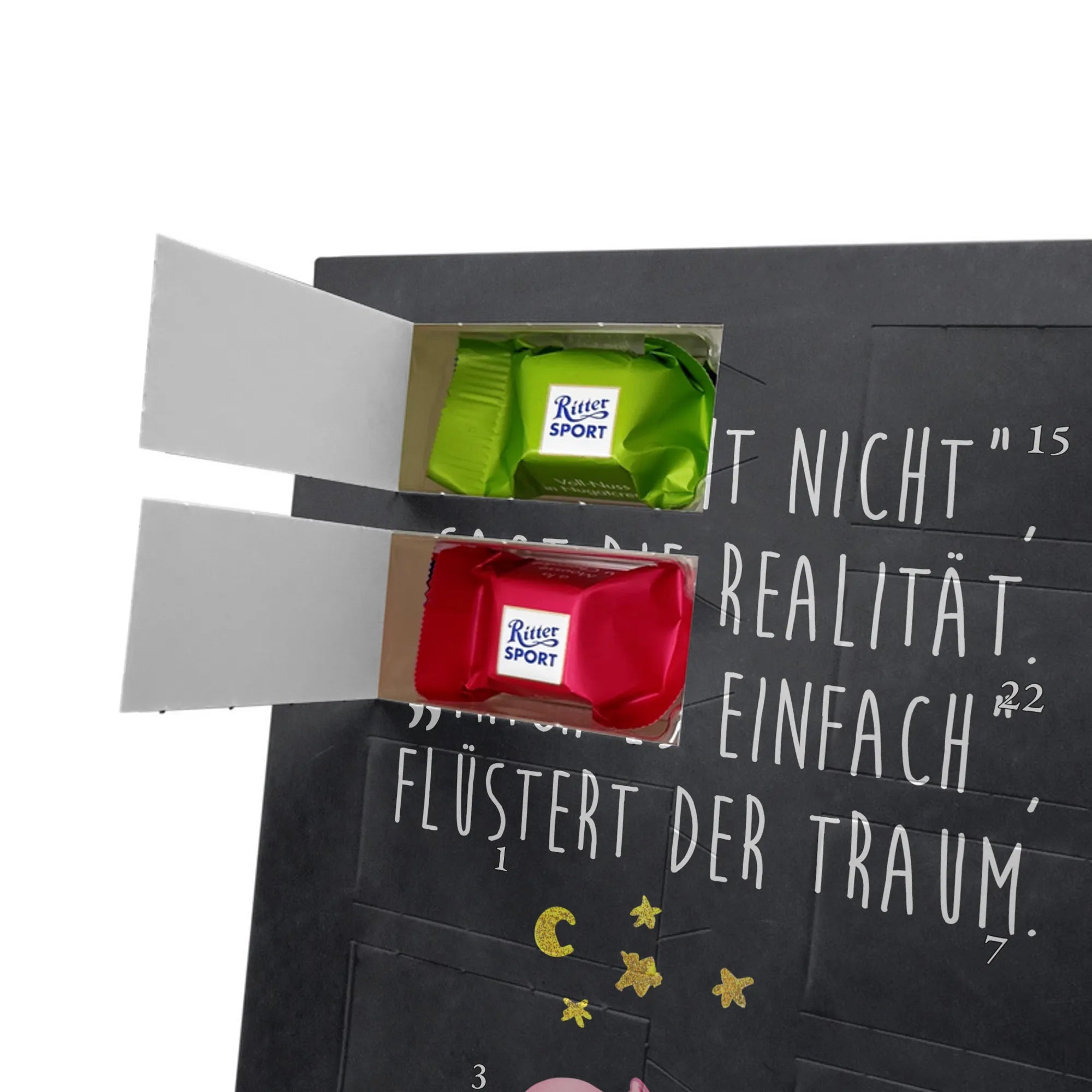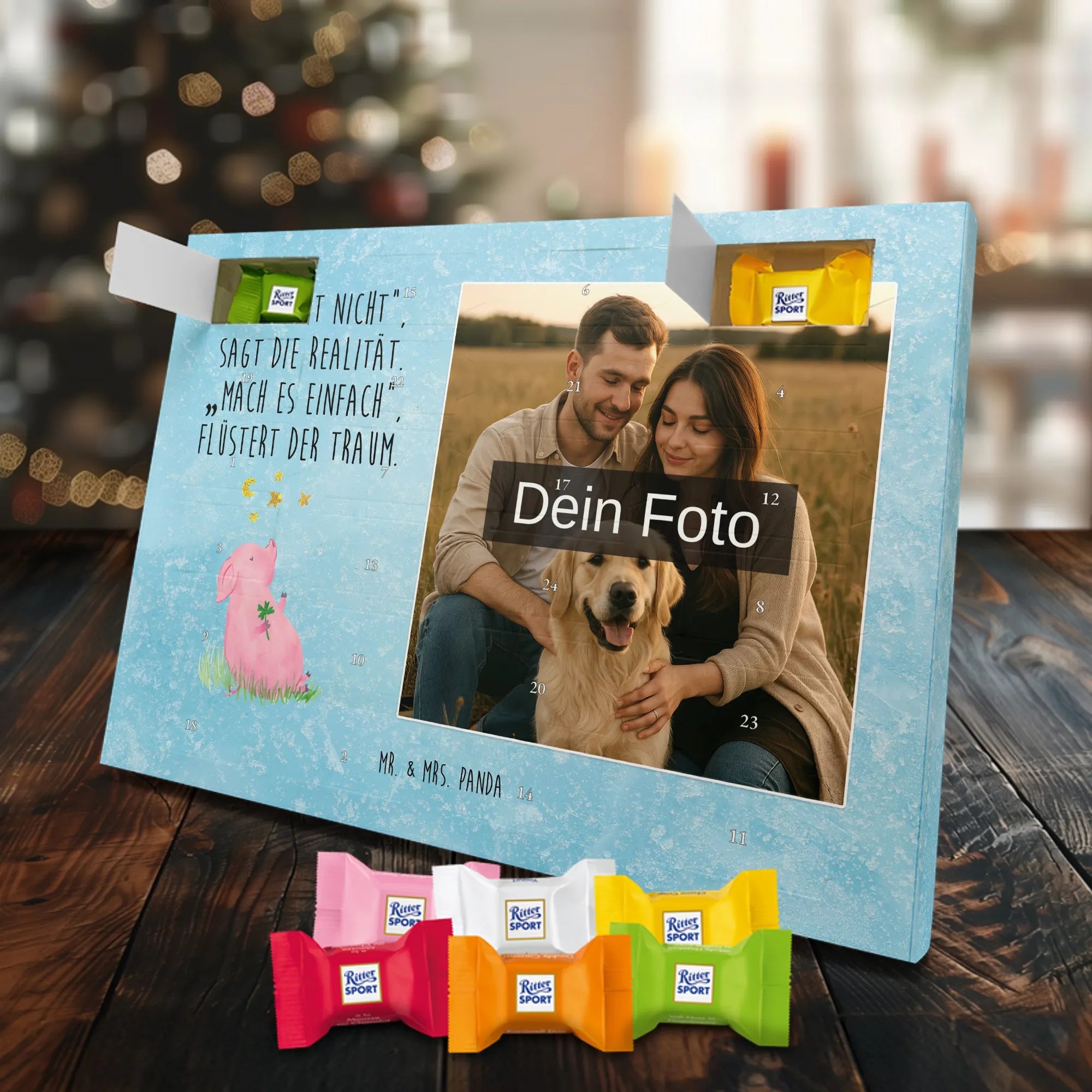 Schoko Foto Adventskalender personalisiert – ein fröhlicher Hingucker von Mr. & Mrs. Panda, der Adventszeit und Erinnerungen verbindet. Der Kalender ist bedruckt mit zauberhaften Motiven & Sprüchen von Mr. & Mrs. Panda und lässt sich ganz leicht mit einem Foto deiner Wahl personalisieren. Achtung Bildqualität: Für ein scharfes Druckbild solltest du ein Foto in hoher Auflösung verwenden. Kontrolliere den Bildausschnitt, damit wichtige Gesichter oder Details nicht verloren gehen. Verwende nur Fotos, für die du die Rechte besitzt oder die frei nutzbar sind. Bitte beachte: Die Fotos werden weder nachbearbeitet noch zugeschnitten und personalisierte Foto Artikel sind vom Umtausch ausgeschlossen. Die Verarbeitung überzeugt mit seidenmatter Oberflächenveredelung und bedruckten Seitenflächen für ein edles Finish. Maße: 325 mm x 225 mm x 27 mm. Besonderheit: Du kannst den Kalender aufhängen oder aufstellen – ganz flexibel. Gefüllt ist der Kalender mit Ritter Sport Schokowürfeln in leckeren Geschmacksrichtungen wie Mousse au Chocolat, Schoko Crisp, Voll-Nuss in Nougatcreme, Karamell Duo, Joghurt und Erdbeer-Joghurt. Ein liebevolles Geschenk, das jeden Tag im Advent versüßt.
