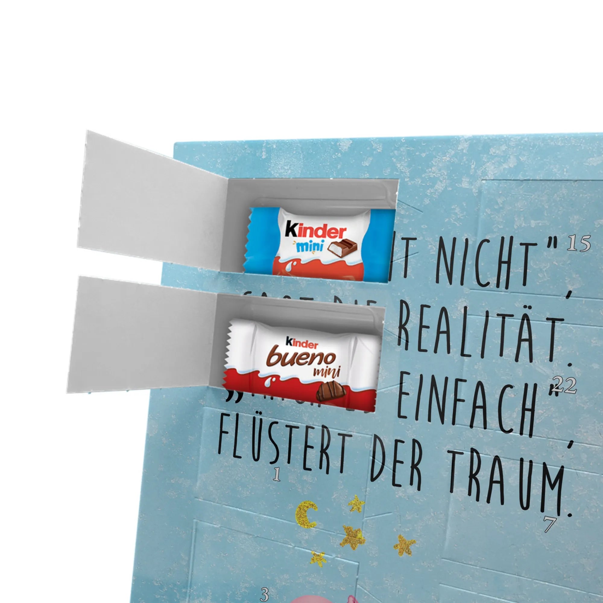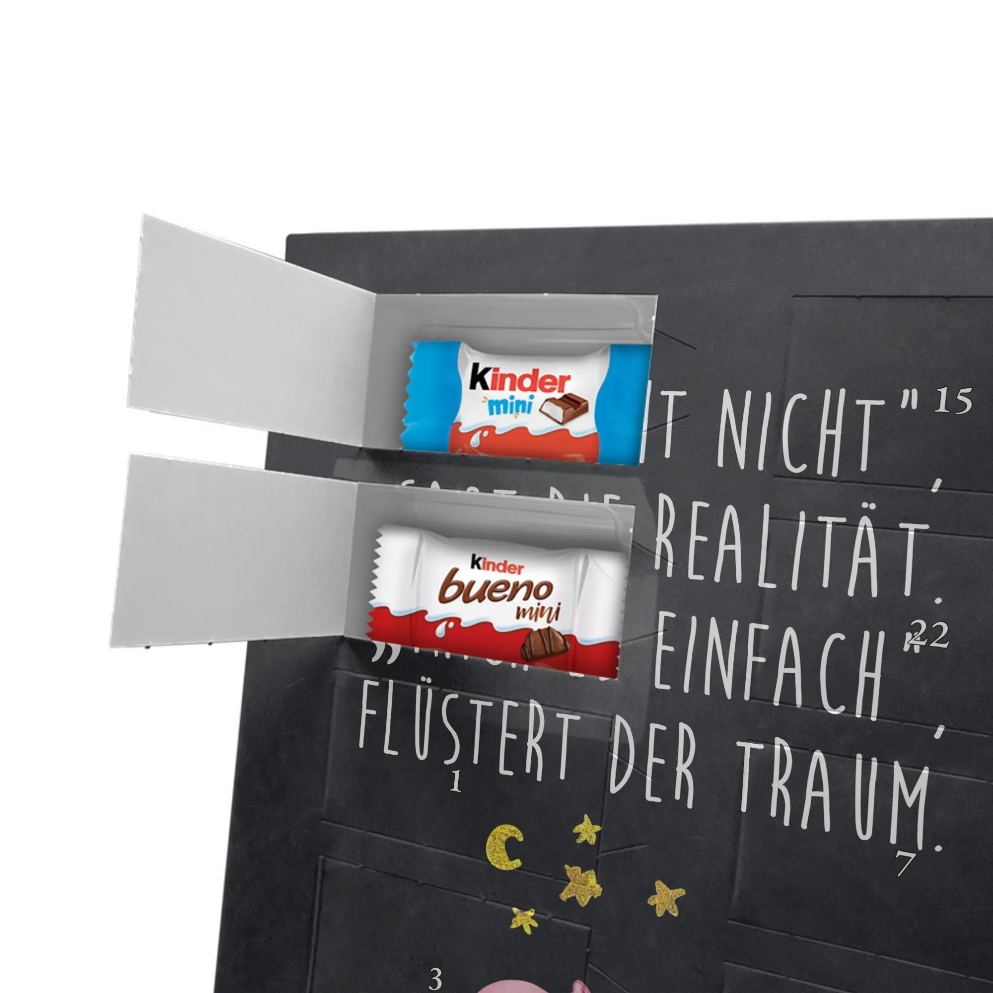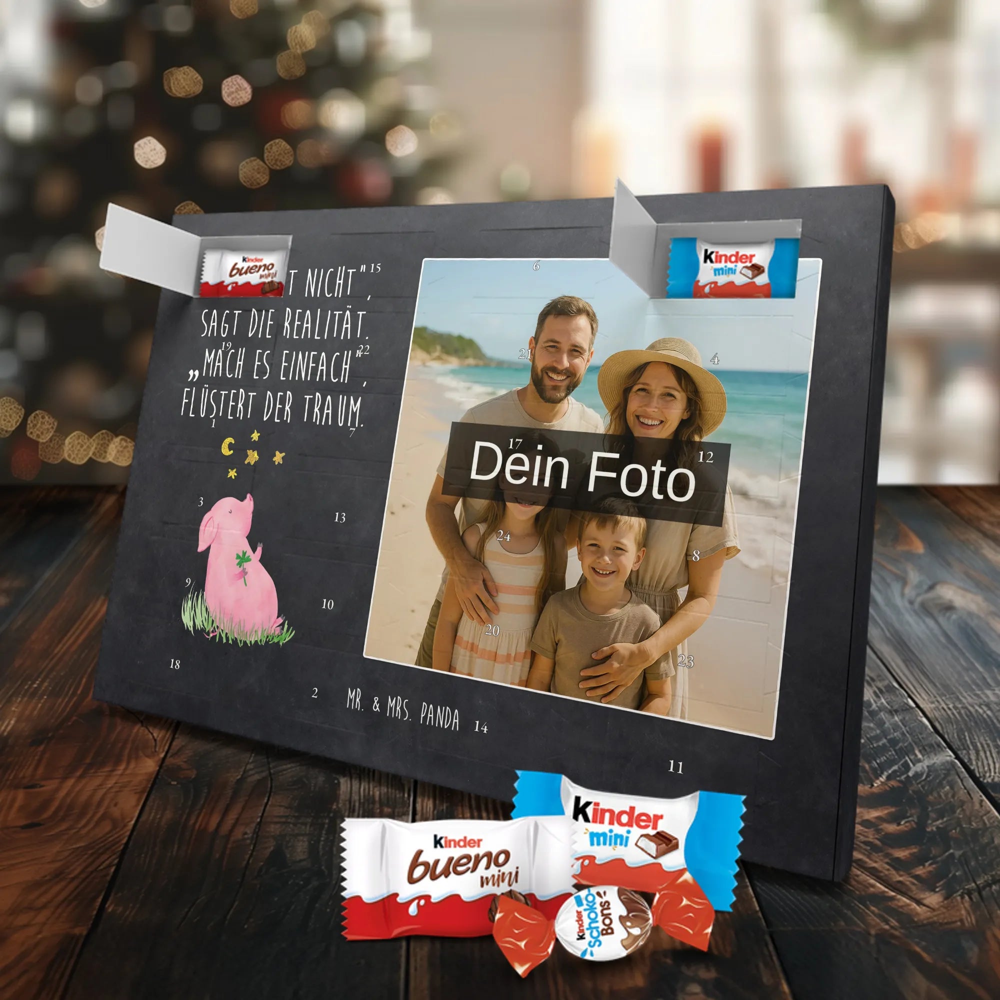 Personalisierter Schoko-Foto-Adventskalender von Mr. & Mrs. Panda – perfekt, wenn du ein einzigartiges, herzhaft-süßes Geschenk suchst. Du lädst ein Foto hoch, das wir auf der Vorderseite platzieren; der Rest des Kalenders ist mit unseren liebevollen Illustrationen und frechen Sprüchen gestaltet. Achte bitte darauf, dass das Bild eine hohe Auflösung hat und der Bildausschnitt passt, damit das Druckbild schön und scharf wird. Lade nur Fotos hoch, an denen du die Rechte besitzt oder für die du die Erlaubnis hast. Wichtig: Wir bearbeiten oder kürzen die Fotos nicht und personalisierte Artikel sind vom Rückgaberecht ausgeschlossen. Die hochwertige, seidenmatte Oberflächenveredelung sorgt für edle Optik, die bedruckten Seitenflächen geben dem Kalender eine liebevolle Note. Maße: 355 mm x 245 mm x 11 mm. Du kannst den Kalender aufstellen oder aufhängen – ganz wie du möchtest. Gefüllt ist er mit kinder® Schokolade: enthalten sind kinder® Schoko-Bons, kinder® Bueno mini und kinder® Schokolade mini. Wir empfehlen, vor dem Hochladen den Bildausschnitt am Bildschirm zu prüfen, damit Gesichter und wichtige Details nicht abgeschnitten werden. Dieser Adventskalender ist ideal für Paare, Familien und als persönliches Mitbringsel – mit ganz viel Mr. & Mrs. Panda Herz.