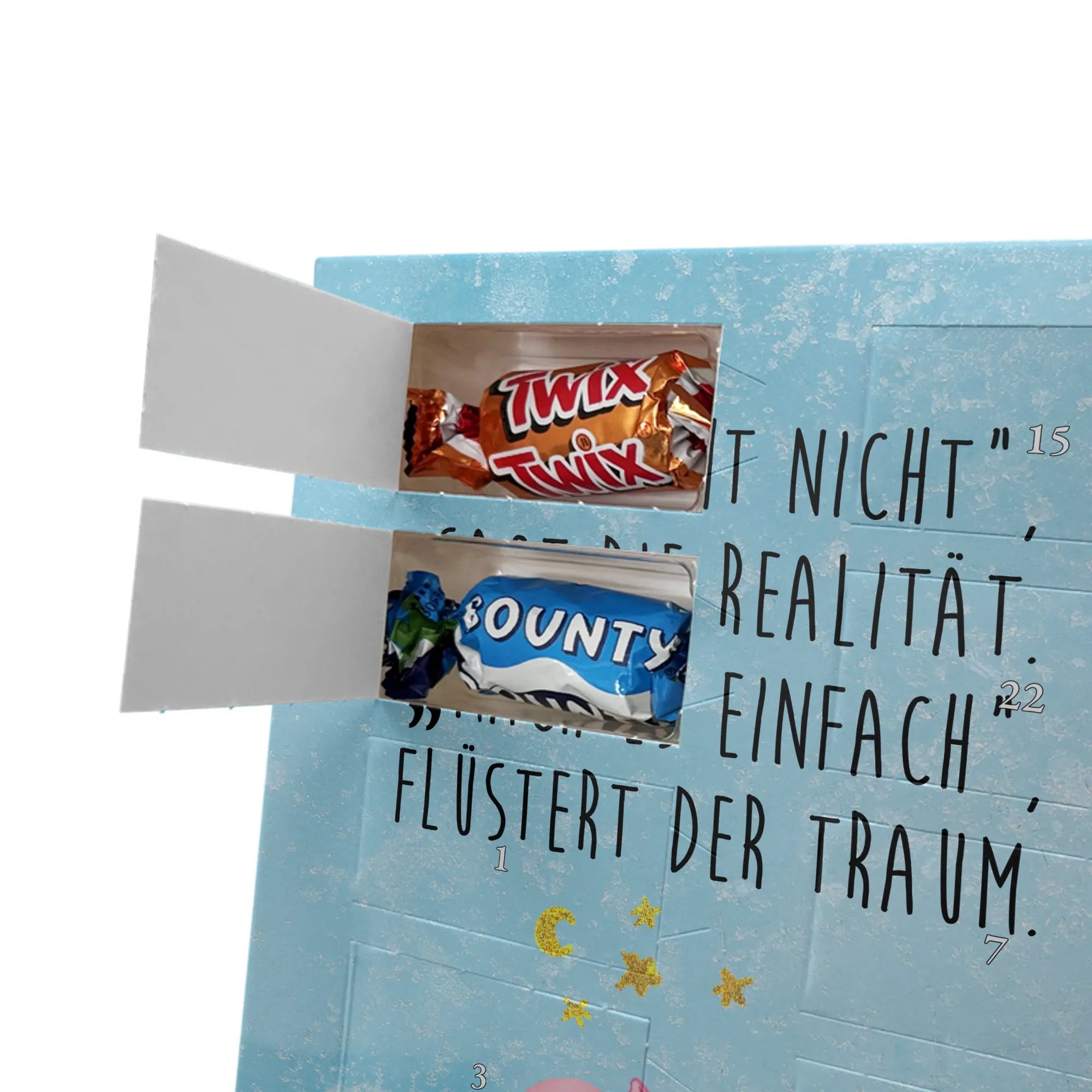 Charmanter Personalisierter Adventskalender mit Schoko-Foto von Mr. & Mrs. Panda – eine liebevolle Art, die Adventszeit zu personalisieren. Der Kalender ist mit den typischen Mr. & Mrs. Panda Motiven und herzlichen Sprüchen bedruckt; du kannst die Vorderseite mit deinem Lieblingsfoto gestalten. Achte auf eine hohe Auflösung deines Fotos, damit das Druckbild schön scharf wird, und kontrolliere den Bildausschnitt, damit keine wichtigen Details verloren gehen. Bitte lade nur Bilder hoch, für die du die Bildrechte besitzt oder eine Erlaubnis zur Nutzung vorliegt. Die Verarbeitung ist hochwertig: brillante Druckqualität, seidenmatte Oberflächenveredelung und bedruckte Seitenflächen für ein rundes Design. Maße: 325 mm x 225 mm x 27 mm. Der Kalender kann aufgehängt oder aufgestellt werden – ganz nach Belieben. Wichtig: Die Fotos werden nicht nachbearbeitet oder zugeschnitten; personalisierte Foto-Artikel sind vom Widerruf ausgenommen. Gefüllt ist der Adventskalender mit Celebrations Schokolade – 24 feine Füllungen in 8 verschiedenen Sorten (Maltesers, Mars, Snickers, Twix, Milky Way, Bounty, Galaxy, Galaxy Caramel). Ein persönliches Geschenk, das Erinnerungen und Genuss wunderbar verbindet.