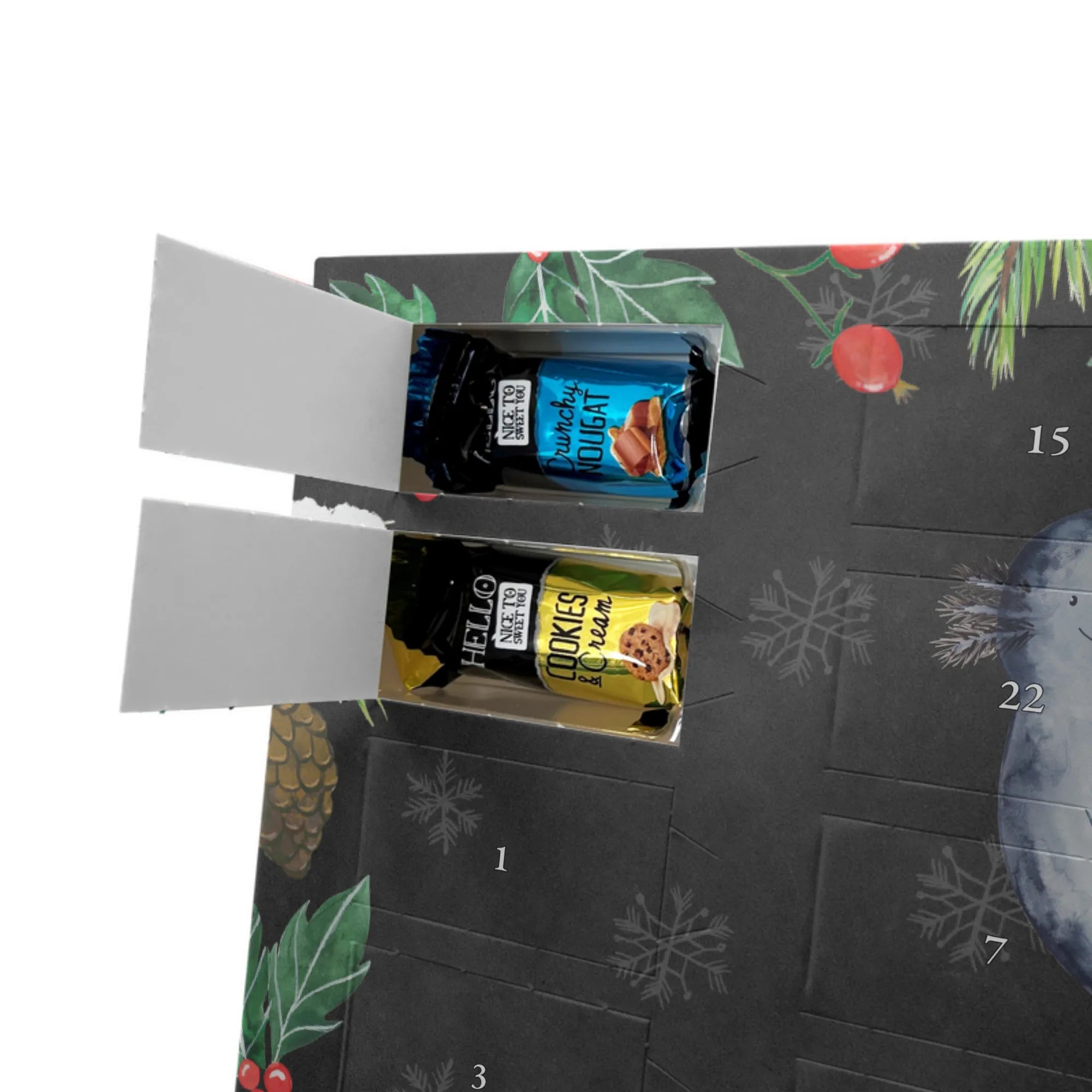 Wunderschöner Schokoladen-Adventskalender von Mr. & Mrs. Panda – süßes Design trifft hochwertige Verarbeitung. Unser Schokoladen-Adventskalender ist bedruckt mit wunderschönen Motiven & Sprüchen von Mr. & Mrs. Panda und nicht personalisierbar, dafür aber mit liebevollen Details gestaltet. Die brillante Druckqualität mit seidenmatter Oberflächenveredelung verleiht dem Kalender ein edles Finish, und auch die Seitenflächen sind bedruckt für einen rundum stimmigen Look. Maße: 233 mm x 178 mm x 24 mm. Die Konstruktion erlaubt sowohl das Aufstellen als auch das Aufhängen – Besonderheit: kann aufgehängt oder aufgestellt werden. Gefüllt mit MARKENNAMEN Schokolade und mit leckeren Schokoladenkugeln bestückt, ist jeder Dezembertag eine kleine Belohnung. Bitte lies die besonderen Hinweise: (Kann Spuren von Haselnüssen, Mandeln, Gluten und Soja enthalten!), kühl und trocken lagern. Ideal als Geschenk, Adventsdekoration oder süße Überraschung für Freunde und Familie. Mr. & Mrs. Panda wünscht dir eine gemütliche und genussvolle Adventszeit!