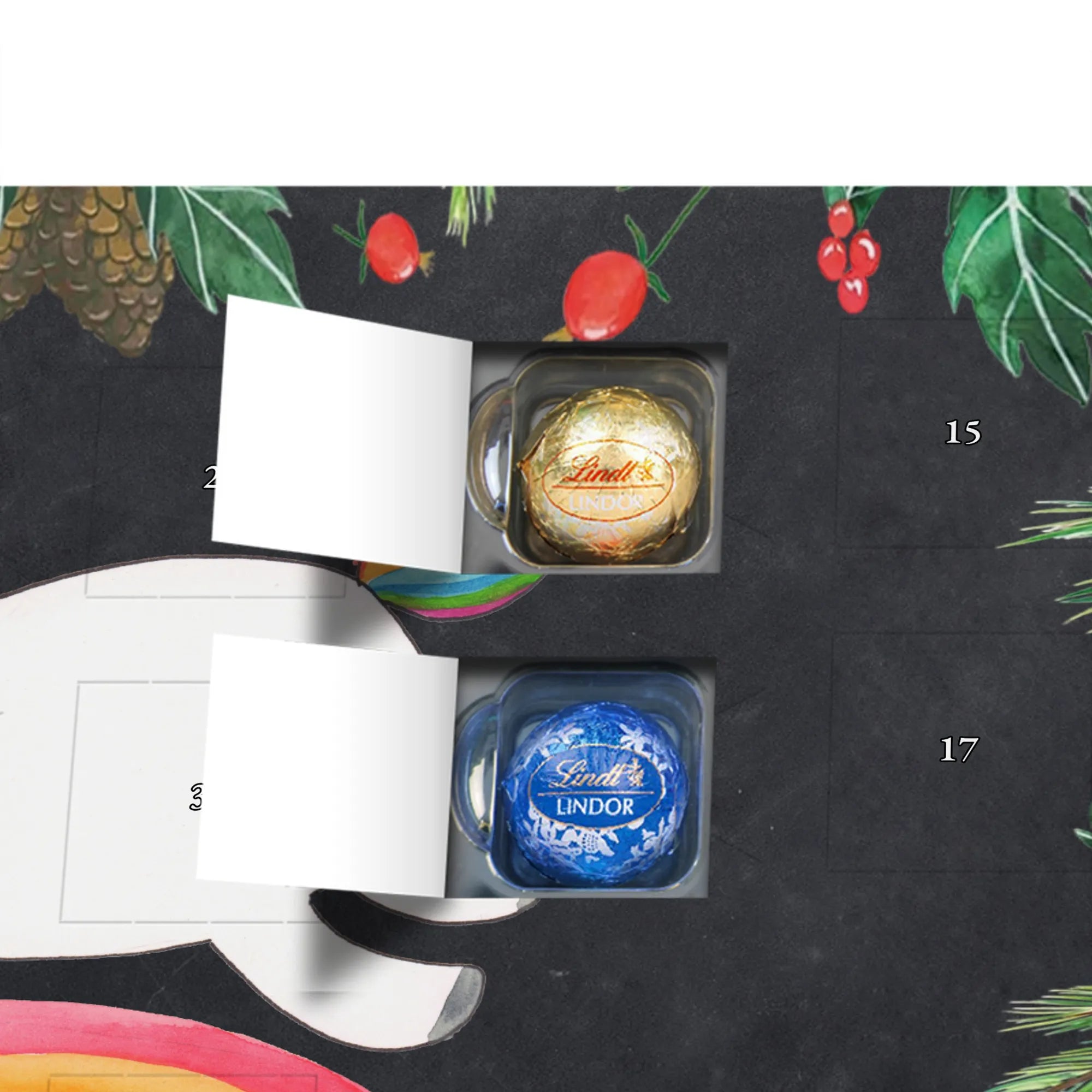 Unser liebevoller Schokoladen Adventskalender von Mr. & Mrs. Panda ist perfekt für alle, die sich eine fröhliche und süße Adventszeit wünschen. Aufwendig bedruckt mit unseren typischen Motiven & Sprüchen, nicht personalisierbar – dafür aber unglaublich hübsch anzusehen. Die brillante Druckqualität mit seidenmatter Oberflächenveredelung verleiht dem Kalender ein edles Aussehen, und die bedruckten Seitenflächen runden das Design ab. Maße: 233 mm x 178 mm x 24 mm. Besonderheit: kann aufgehängt oder aufgestellt werden, so bleibt er flexibel für deinen Deko-Stil. Gefüllt mit Lindt Lindor: 24 einzeln verpackte Markenschokoladen Kugeln in drei leckeren Sorten – Vollmilch, Feinherb und Weiße Schokolade – sorgen für tägliche Genussmomente. Zutaten: Zucker, pflanzliches Fett (Kokosnuss, Palmkern), Kakaobutter, Vollmilchpulver, Kakaomasse, Milchzucker, Magermilchpulver, Butterreinfett, Emulgator (Sojalecithin), Gerstenmalzextrakt, Aromen. Besondere Hinweise: Kann Haselnüsse und Mandeln enthalten. Ein tolles Geschenk oder eine hübsche Dekoration – unser Schokoladen Adventskalender macht die Wartezeit bis Weihnachten noch schöner!