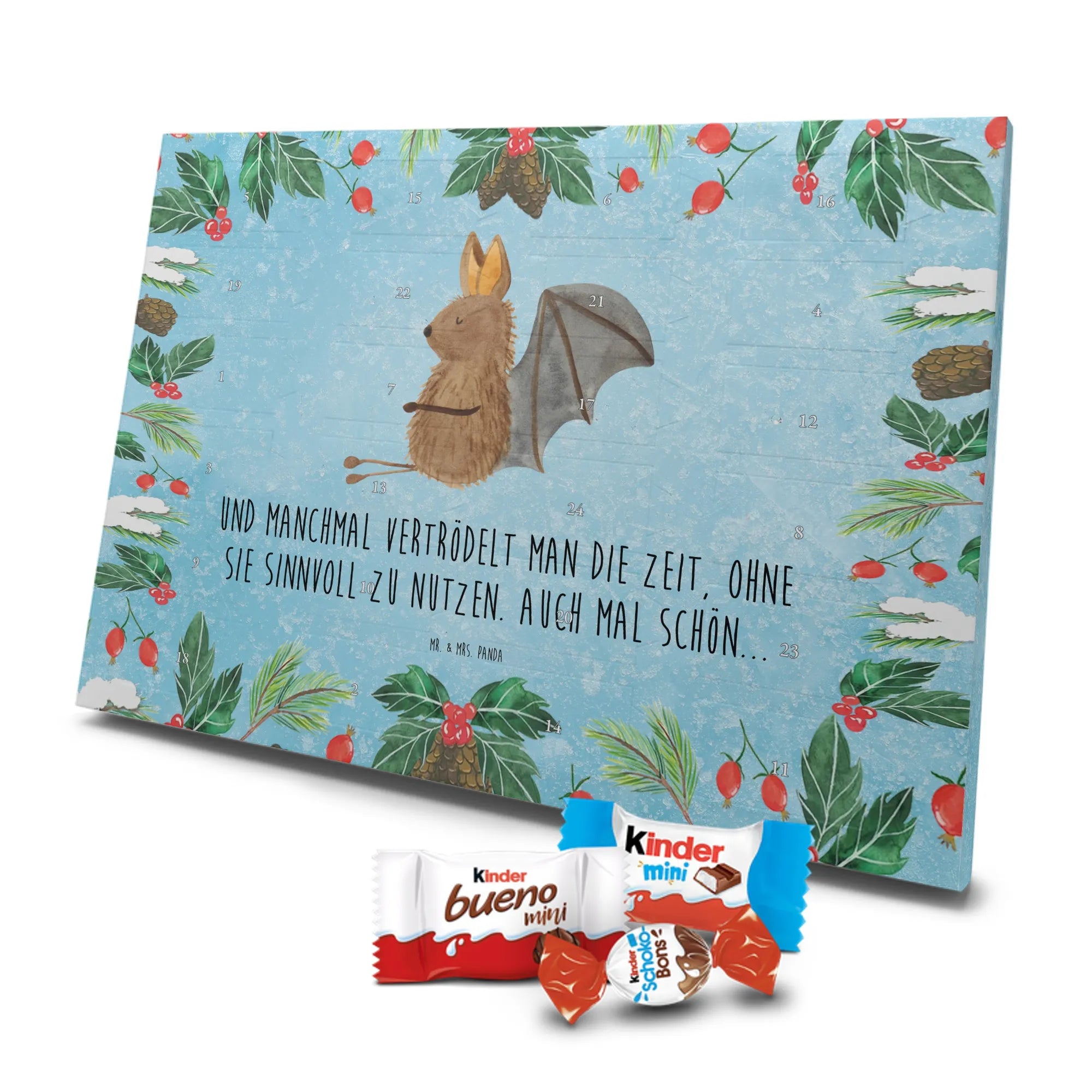 Unser Schokoladen Adventskalender von Mr. & Mrs. Panda bringt Charme und süße Überraschungen in deine Adventszeit. Liebevoll bedruckt mit wunderschönen Motiven & Sprüchen von Mr. & Mrs. Panda, ist dieser Kalender nicht personalisierbar, dafür aber mit hochwertiger Verarbeitung und stimmigem Design. Die brillante Druckqualität mit seidenmatter Oberflächenveredelung verleiht jedem Motiv eine edle Optik, und die bedruckten Seitenflächen runden das Gesamtbild ab. Maße: 355 mm x 245 mm x 11 mm. Eine praktische Besonderheit: kann aufgehängt oder aufgestellt werden – so passt er perfekt in jede Deko. Gefüllt mit Markenname Schokolade: Adventskalender gefüllt mit kinder® Schokolade. Inhalt: kinder® Schoko-Bons, kinder® Bueno mini und kinder® Schokolade mini. Mit 24 kleinen Leckereien hinter den Türchen ist dieser Kalender ideal für Kinder und alle Naschkatzen. Er eignet sich wunderbar als Adventsgeschenk oder als liebevolle Aufmerksamkeit für Kollegen und Freunde. Gönn dir oder anderen eine süße Adventszeit mit diesem bezaubernden Schokoladen Adventskalender!