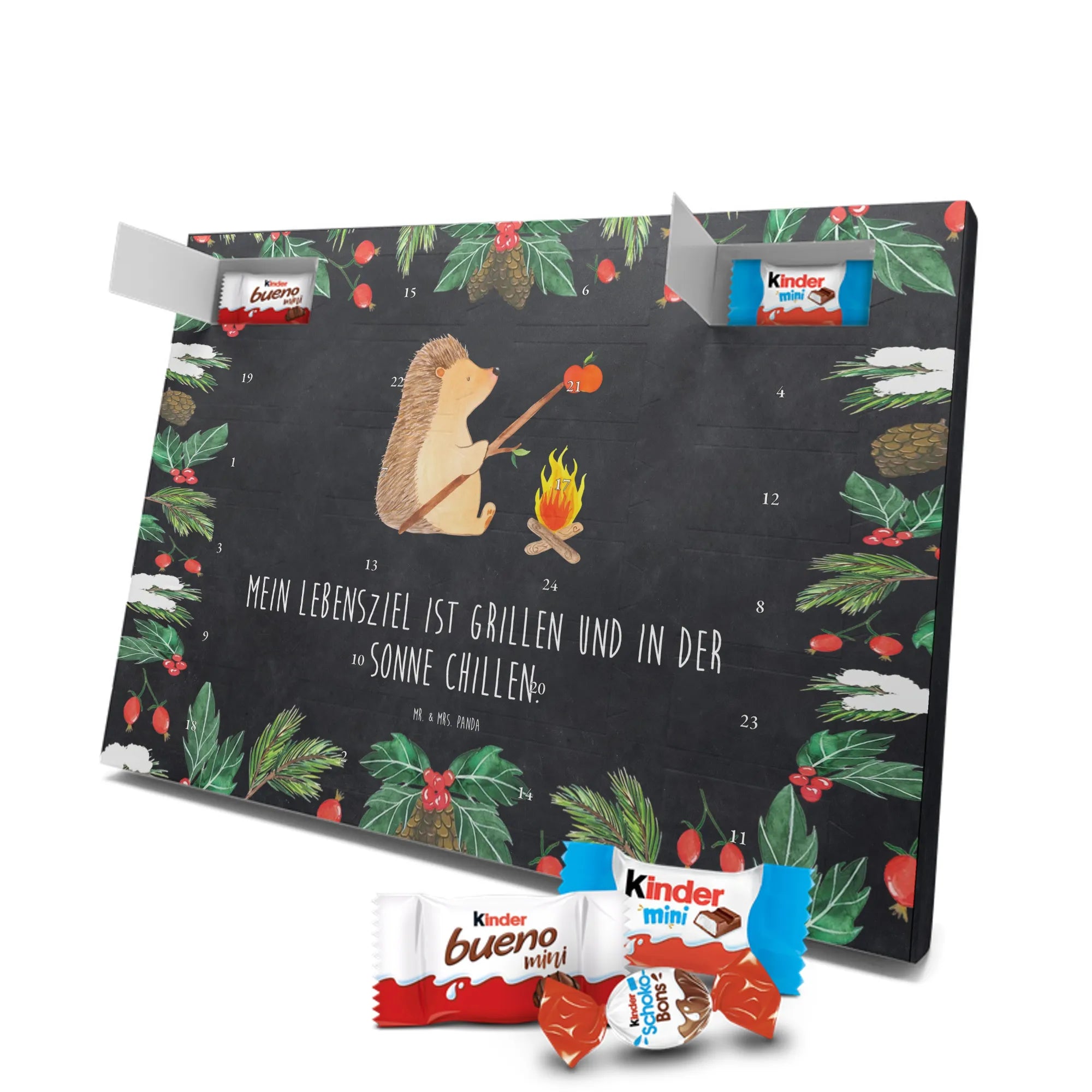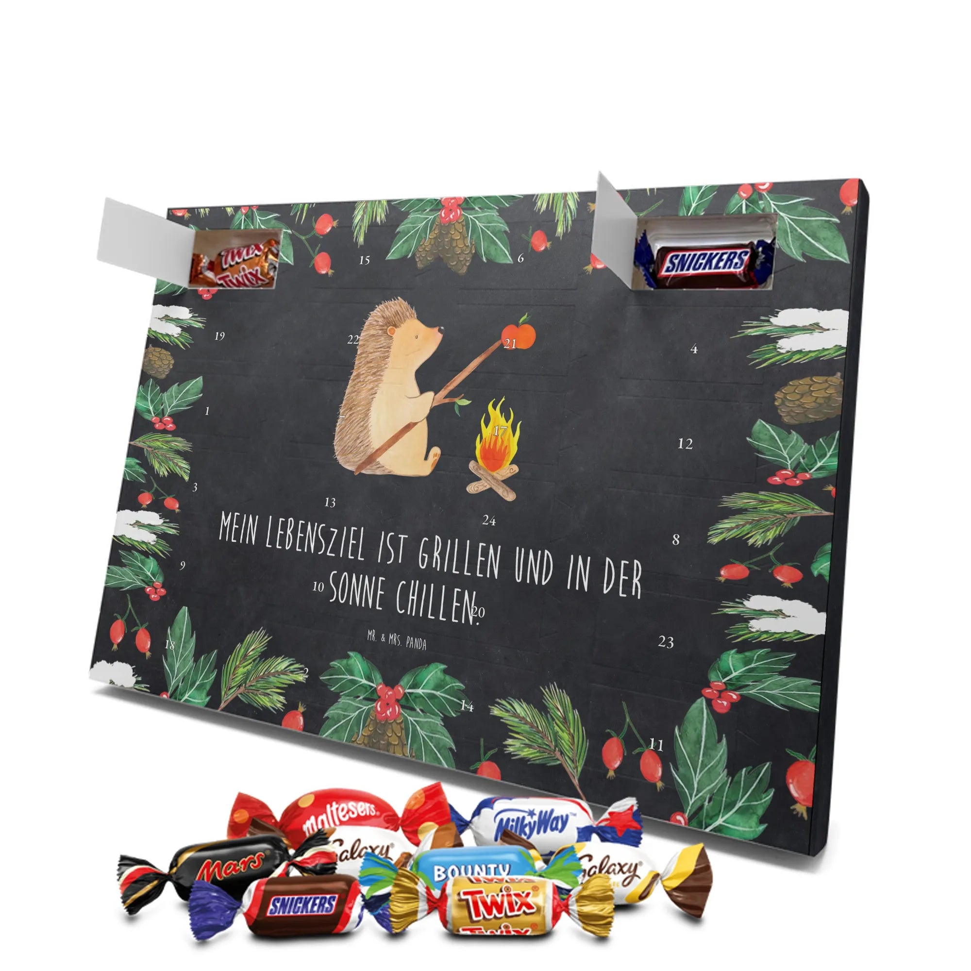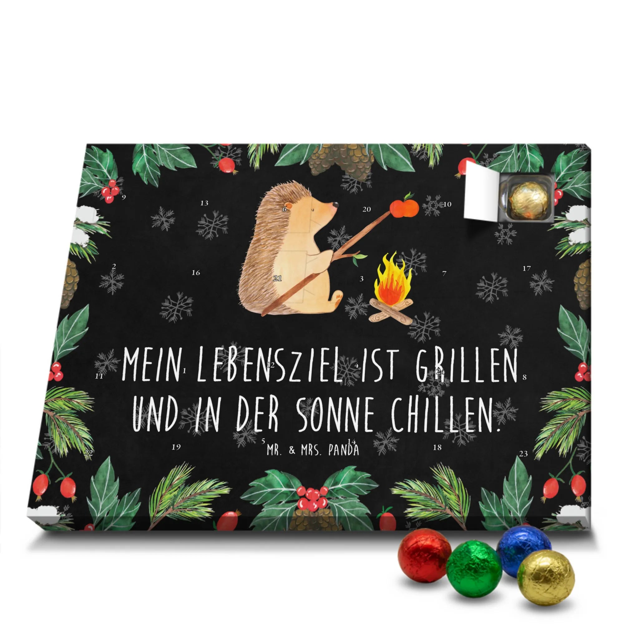 Jeden Adventstag ein kleines Stückchen Glück: Der Schoko Adventskalender „Igel grillt“ aus der Mr. & Mrs. Panda Small World Kollektion vereint süße Schokolade mit einem liebevollen Motiv und einem frechen Spruch. Der niedliche Igel sitzt zufrieden am Lagerfeuer und grillt einen Apfel – begleitet von dem Spruch „Mein Lebensziel ist grillen und in der Sonne chillen.“ Dieser Schokoladen Adventskalender zaubert gute Laune und ist ein perfektes Geschenk für alle, die Tiere und lustige Sprüche mögen.