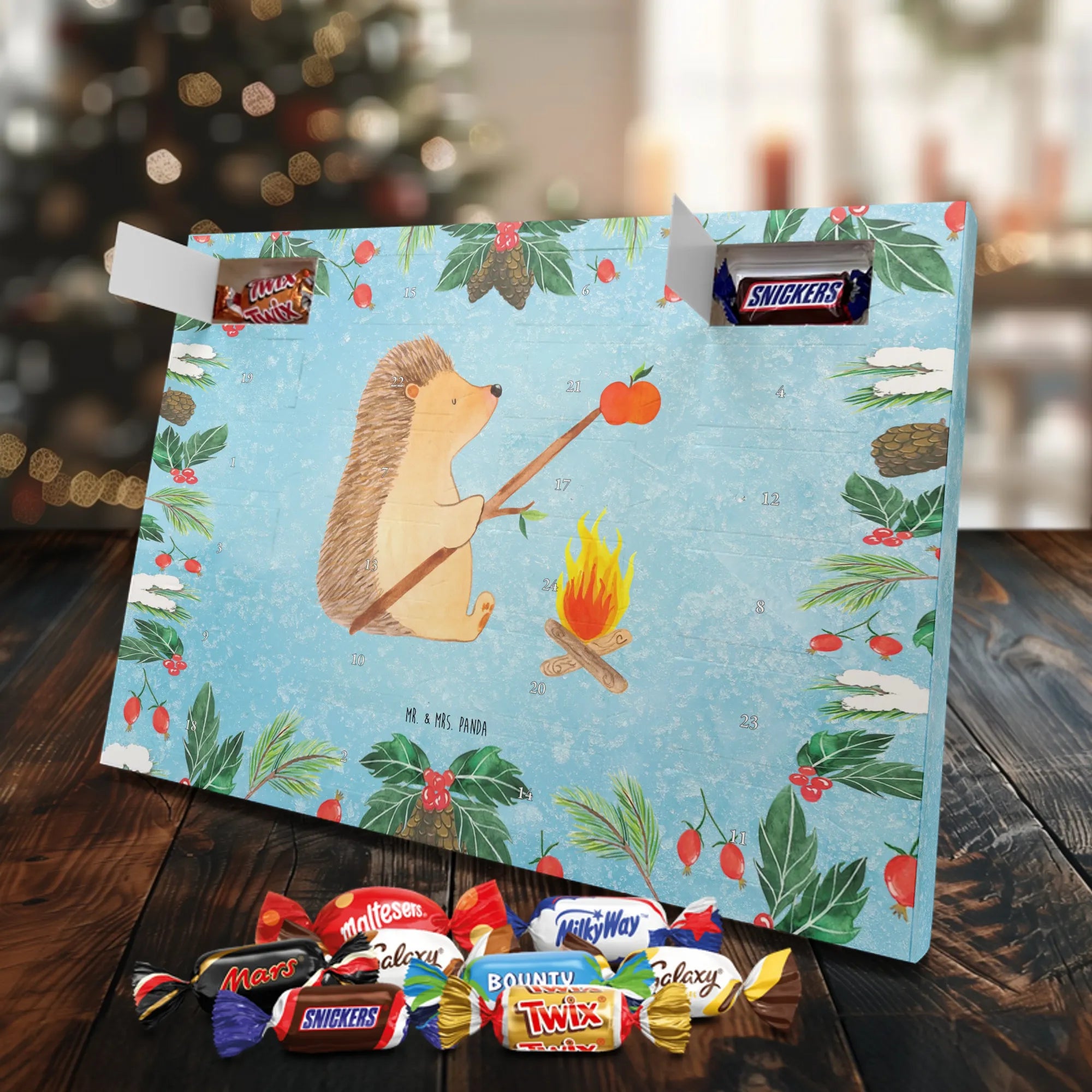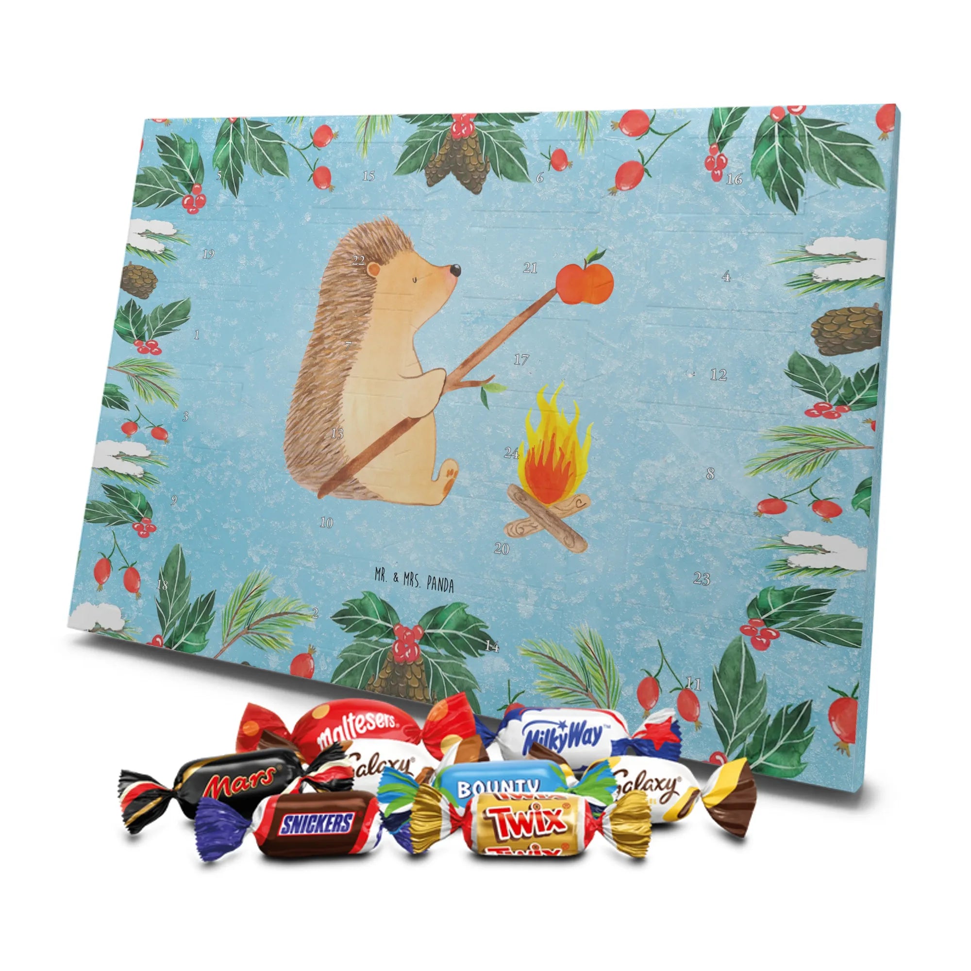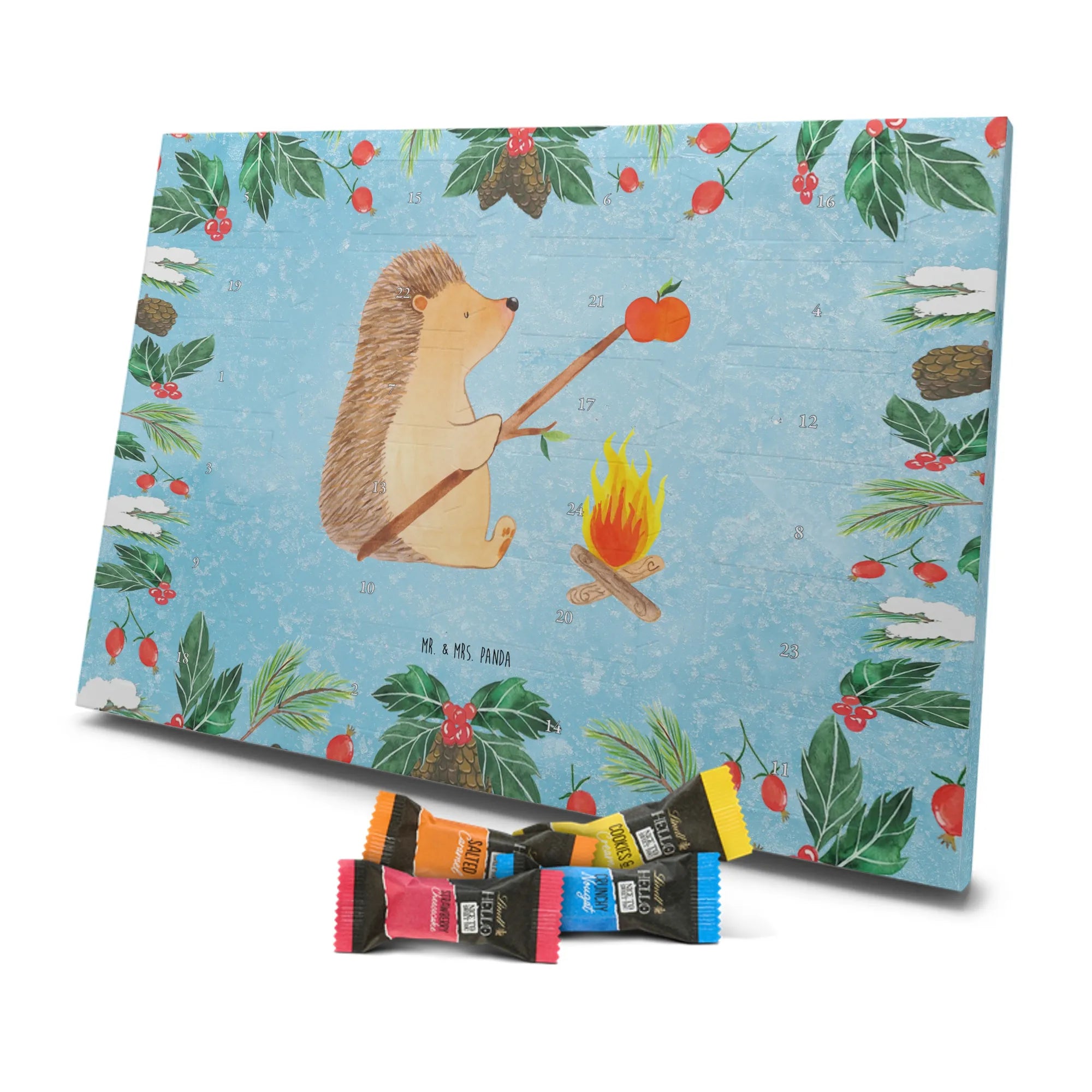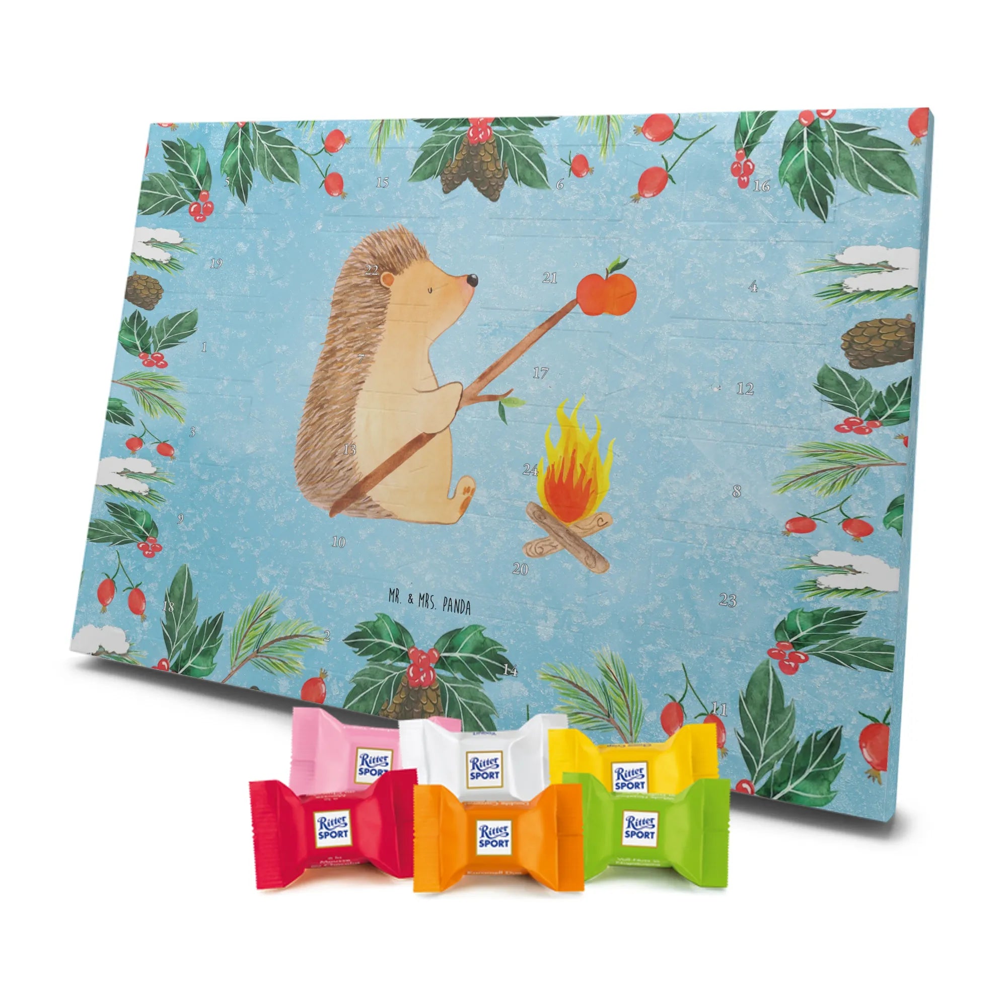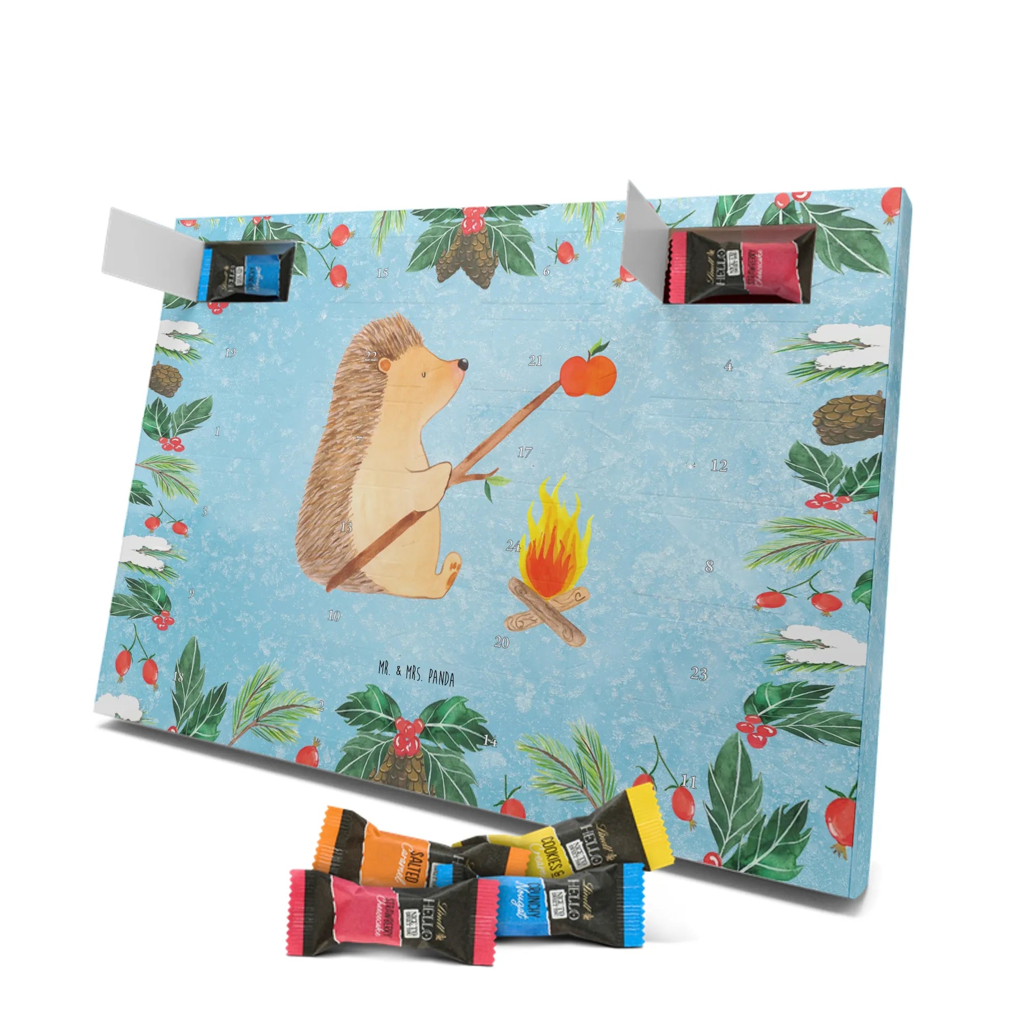 Mr. & Mrs. Panda Schoko Adventskalender „Igel grillt“ – Ein zauberhafter Adventskalender Schokolade aus der fröhlichen Small World Kollektion. Das eisblaue Motiv zeigt unseren gemütlichen Igel am Lagerfeuer, wie er einen Apfel über dem Feuer grillt. Diese liebevolle Szene bringt sommerliche Erinnerungen in den Dezember und schenkt jedem Tag ein kleines Lächeln.