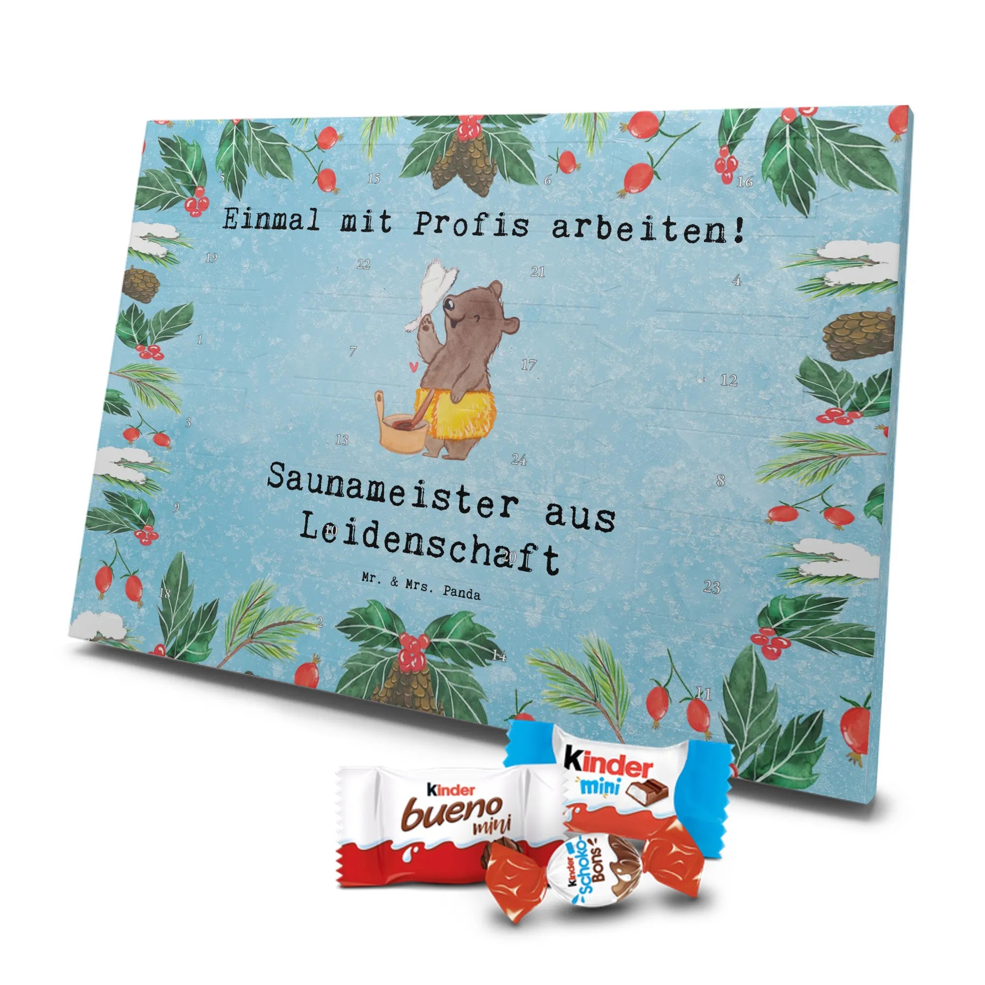 Adventskalender mit Schokolade – liebevoll gestaltet von Mr. & Mrs. Panda. Dieser niedliche Kalender ist bedruckt mit wunderschönen Motiven & Sprüchen von Mr. & Mrs. Panda und trotzdem nicht personalisierbar. Du bekommst brillante Druckqualität mit seidenmatter Oberflächenveredelung sowie bedruckte Seitenflächen, die dem Kalender ein hochwertiges Finish verleihen. Maße: 355 mm x 245 mm x 11 mm. Ein tolles Extra: kann aufgehängt oder aufgestellt werden, sodass du ihn flexibel platzieren kannst. Gefüllt mit Markenname Schokolade: Adventskalender gefüllt mit kinder® Schokolade. Inhalt: kinder® Schoko-Bons, kinder® Bueno mini und kinder® Schokolade mini. Die 24 Türchen sind liebevoll befüllt und sorgen jeden Tag für ein Lächeln – ideal für Kinder, Paare oder als kleines Geschenk für Freunde. Robust und dekorativ zugleich, bringt dieser Adventskalender süße Vorfreude in dein Zuhause. Verschenke oder genieße eine adventliche Zeit voller kleiner, schokoladiger Überraschungen!