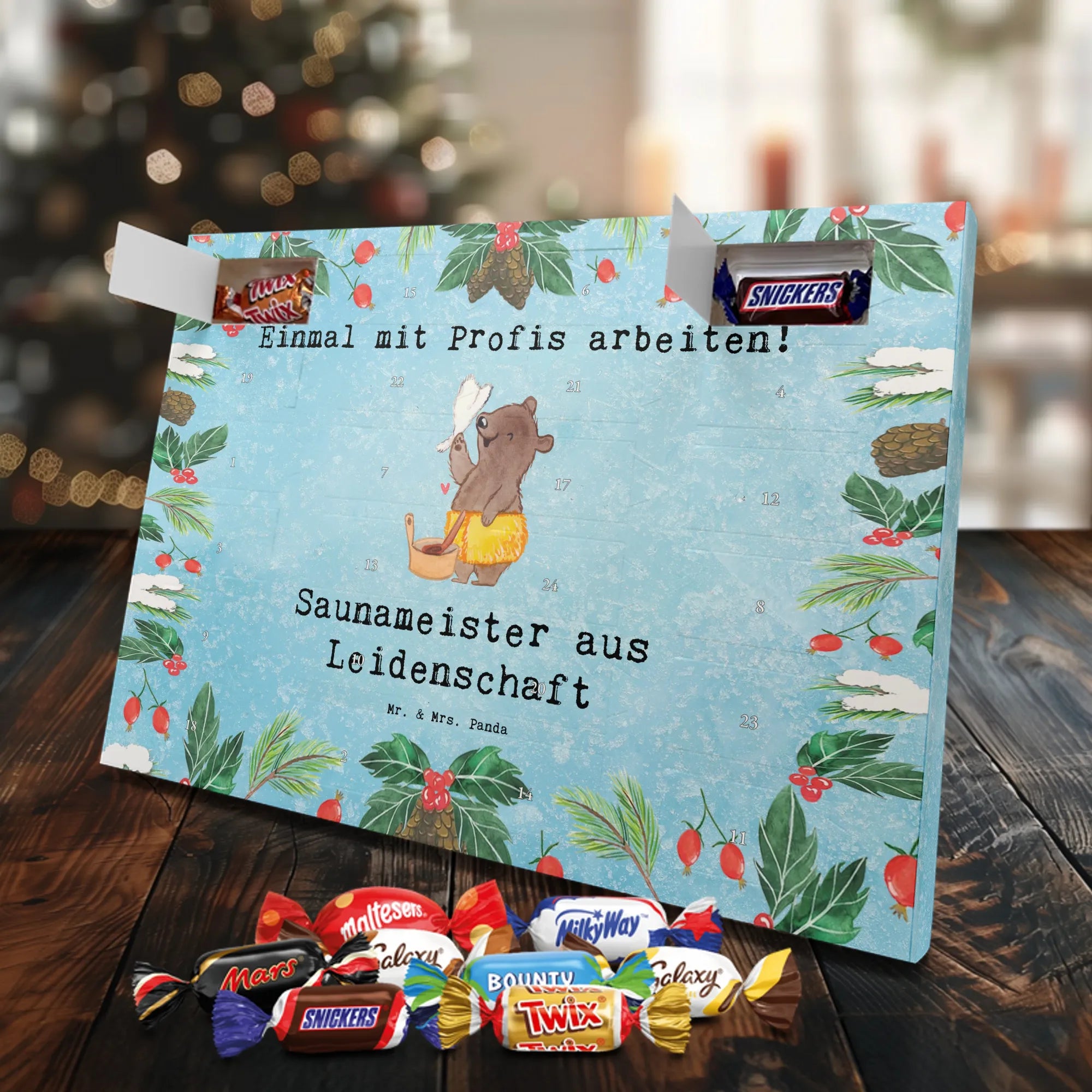 Unser Schoko Adventskalender von Mr. & Mrs. Panda bringt dir und deinen Lieben jede Menge Vorfreude und zauberhafte Momente in die Adventszeit. Der Kalender ist liebevoll bedruckt mit wunderschönen Motiven und frechen Sprüchen im typischen Mr. & Mrs. Panda Stil – ein echter Blickfang auf dem Tisch oder an der Wand. Die brillante Druckqualität kombiniert mit einer seidenmatten Oberflächenveredelung sorgt für edle Farben und ein angenehmes Gefühl beim Anfassen. Auch die Seitenflächen sind bedruckt, sodass der Kalender von allen Seiten hübsch aussieht. Er ist nicht personalisierbar, dafür aber in seiner Gestaltung rundum stimmig. Gefüllt ist der Adventskalender mit 24 hochwertigen Celebrations-Füllungen in acht verschiedenen Sorten: Maltesers, Mars, Snickers, Twix, Milky Way, Bounty, Galaxy und Galaxy Caramel — so ist für jede Naschkatze etwas dabei. Die Besonderheit: Du kannst den Kalender entweder aufstellen oder dank rückseitiger Aufhängung an die Wand hängen. Maße: 325 mm x 225 mm x 27 mm. Ein liebevolles Geschenk für Familie, Freunde oder einfach für dich selbst, das kleine tägliche Glücksmomente schenkt und die Adventszeit versüßt.