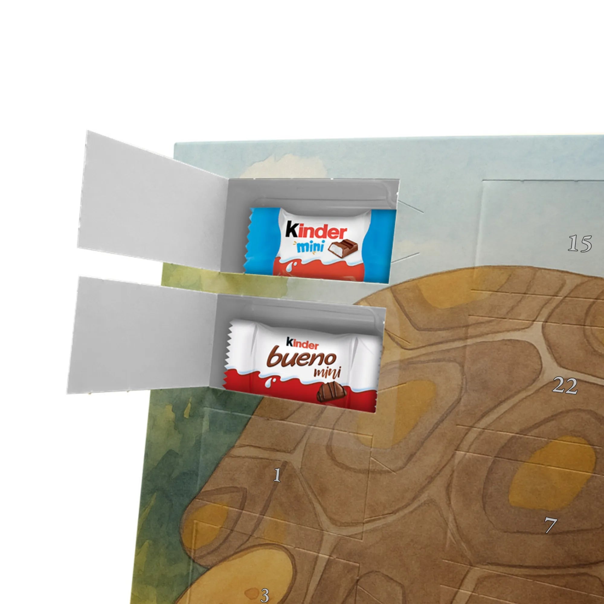 Schoko Adventskalender von Mr. & Mrs. Panda – die charmante Art, sich oder anderen die Adventszeit zu versüßen. Der Kalender ist bedruckt mit wunderschönen Motiven & Sprüchen von Mr. & Mrs. Panda und nicht personalisierbar. Wir legen Wert auf brillante Druckqualität mit seidenmatter Oberflächenveredelung sowie auf bedruckte Seitenflächen für ein stimmiges Gesamtbild. Maße: 355 mm x 245 mm x 11 mm. Besonders praktisch: kann aufgehängt oder aufgestellt werden und passt so in jede Wohnung. Gefüllt mit Markenname Schokolade: Adventskalender gefüllt mit kinder® Schokolade. Inhalt: kinder® Schoko-Bons, kinder® Bueno mini und kinder® Schokolade mini. Die 24 Türchen sind mit kleinen Schoko-Überraschungen bestückt und schaffen jeden Tag Vorfreude. Ob als Geschenk für Kinder, Partner oder als nette Aufmerksamkeit für Kolleginnen und Kollegen – dieser Kalender macht Freude. Robust, schön gestaltet und sofort einsatzbereit für die süßeste Zeit des Jahres!
