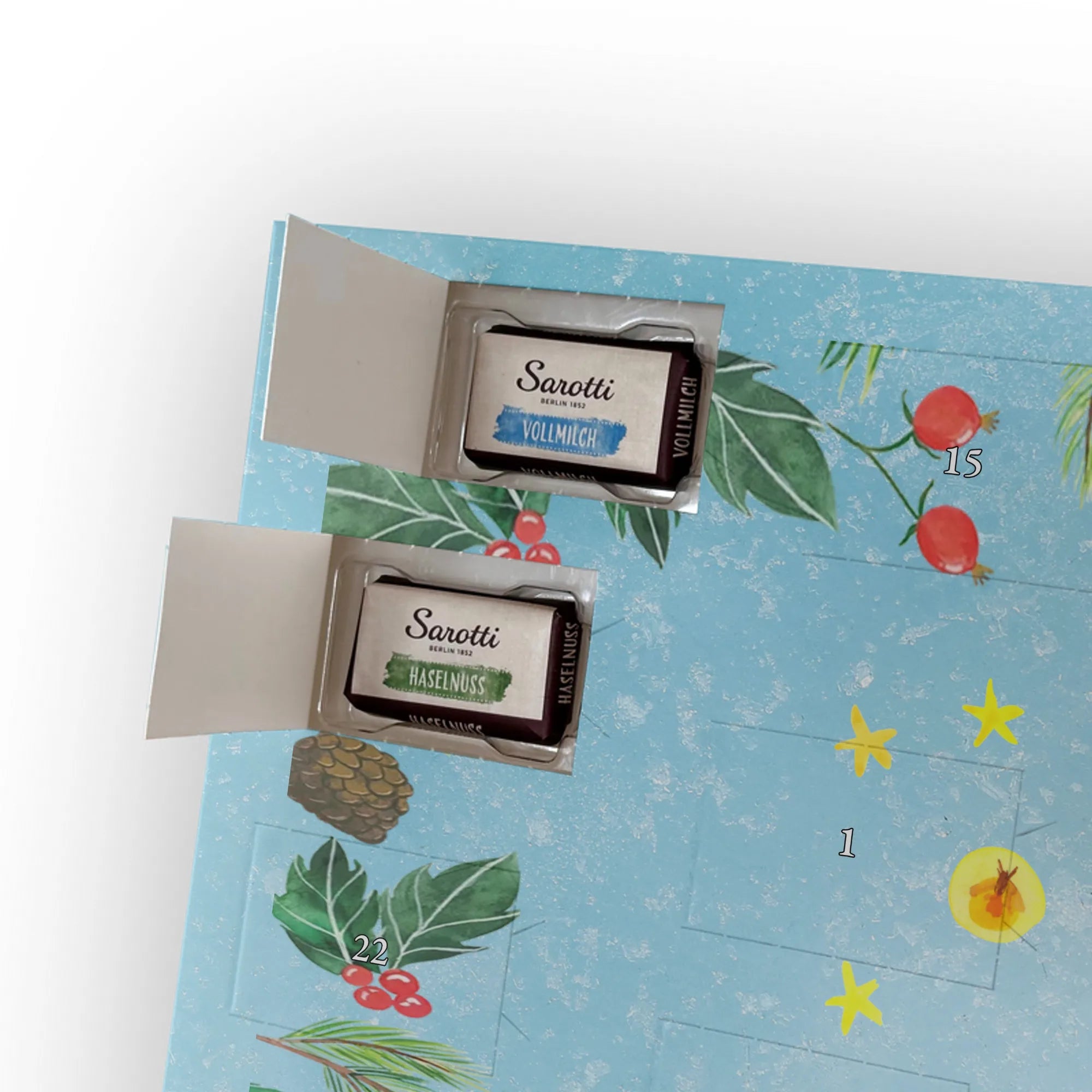 🐼 Schoko-Adventskalender: Liebevolles Design, seidenmatt, brillanter Druck – ein Hingucker.