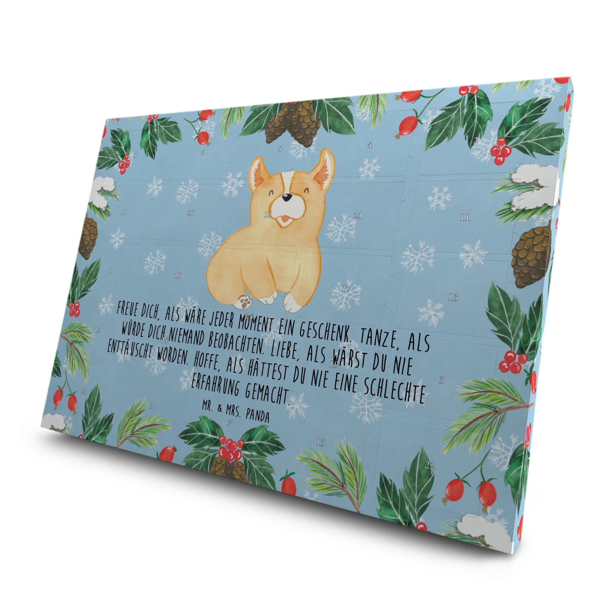 Du suchst das perfekte Adventsgeschenk? Unser Tee Adventskalender Corgie aus der Hunde Kollektion von Mr. & Mrs. Panda verbindet niedliches Design mit köstlichem Tee-Genuss. Der zauberhafte Welsh Corgi Pembroke in Aquarell und das eisblaue Farbschema zaubern sofort ein Lächeln auf jedes Gesicht. 💙