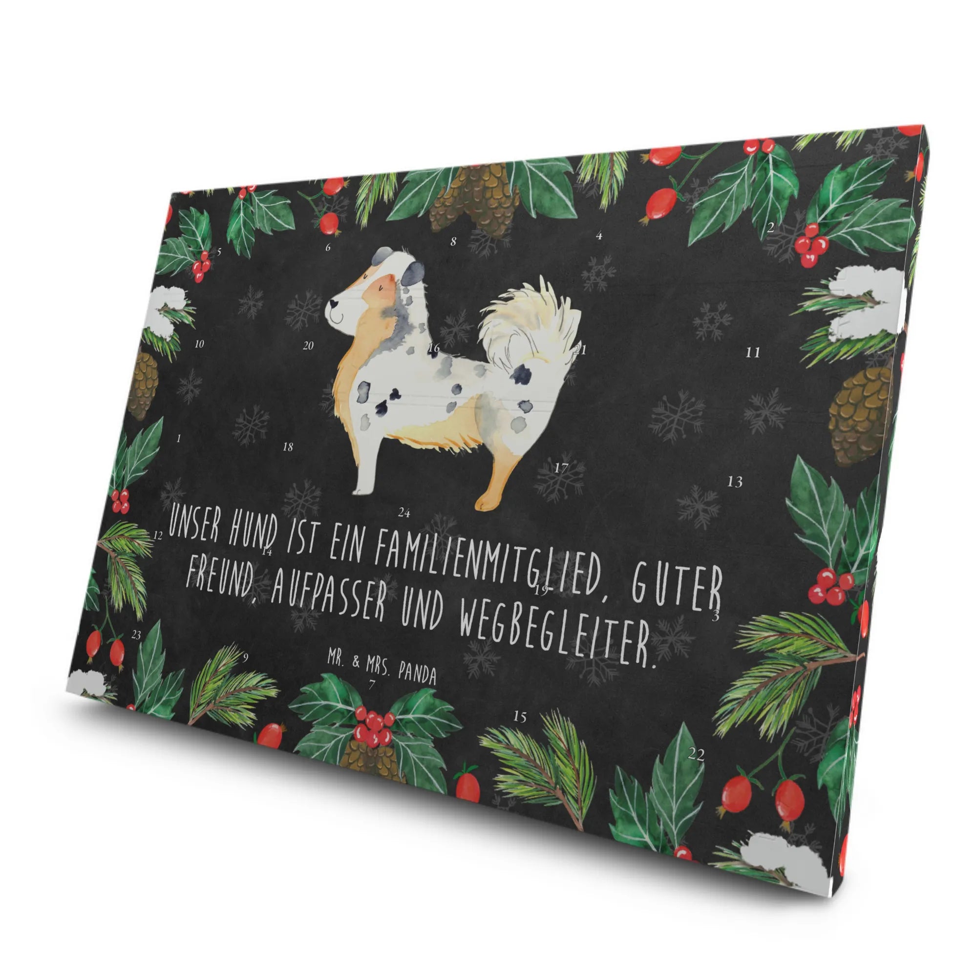 Der Tee Adventskalender mit dem süßen Motiv eines Australian Shepherds von Mr. & Mrs. Panda ist das perfekte Geschenk für alle Hundeliebhaber und Hundebesitzer. Er bringt Freude und Wärme in die kalte Adventszeit und lässt das Herz eines jeden Tierfreundes höher schlagen.