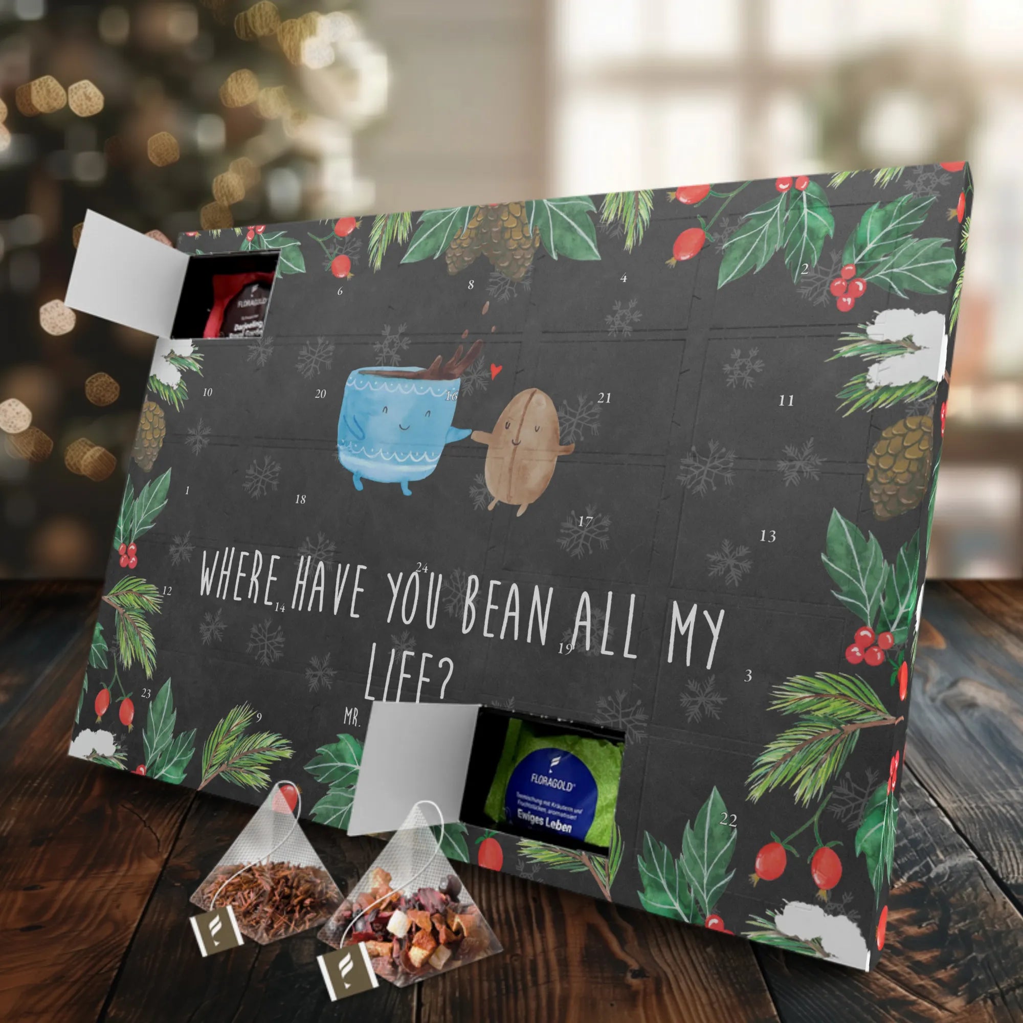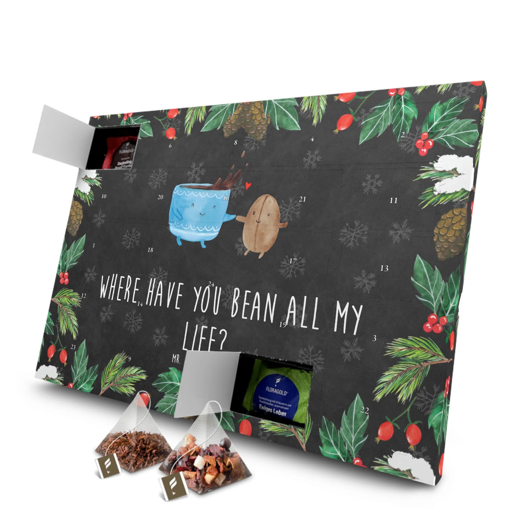 Entdecke den wunderbaren Tee Adventskalender mit dem zauberhaften Motiv einer Kaffeebohne aus der Small World Kollektion von Mr. & Mrs. Panda. Dieser Adventskalender ist nicht nur ein hübsches Deko-Element, sondern auch ein ganz besonderes Geschenk für alle Teeliebhaber und Kaffeefans. Mit dem freudigen Slogan 'Where have you bean all my life?' zaubert er garantiert ein Lächeln auf dein Gesicht und bringt gute Laune in die kalte Jahreszeit.