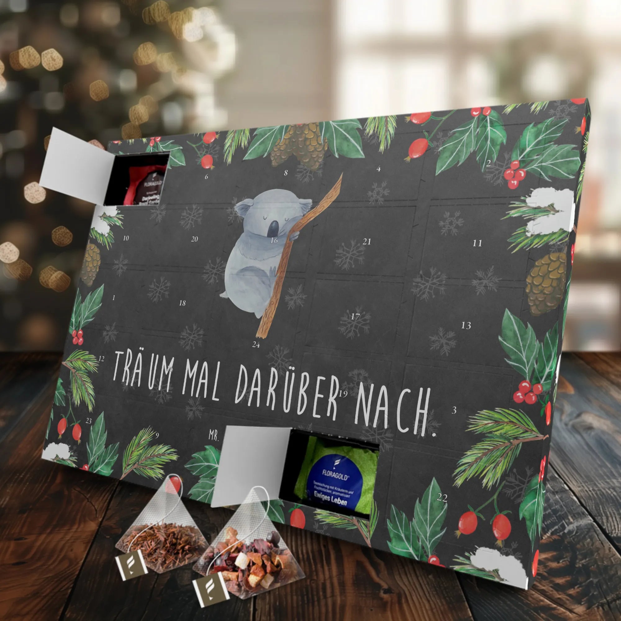 Der Tee Adventskalender mit dem süßen Koalabär-Motiv von Mr. & Mrs. Panda ist das perfekte Geschenk für Teeliebhaber in der Adventszeit! Stell dir vor, wie du jeden Tag im Dezember eine neue, köstliche Teesorte entdecken kannst und dabei in eine entspannende Atmosphäre eintauchst. Der niedliche Koala auf dem Kalender, der sich sanft an einen Ast klammert und von Eukalyptusträumen träumt, bringt dir die nötige gute Laune. Mit dem Slogan „Träum mal darüber nach“ lädt er dich ein, das stressevolle Jahr hinter dir zu lassen und dich auf die besinnliche Zeit zu freuen.