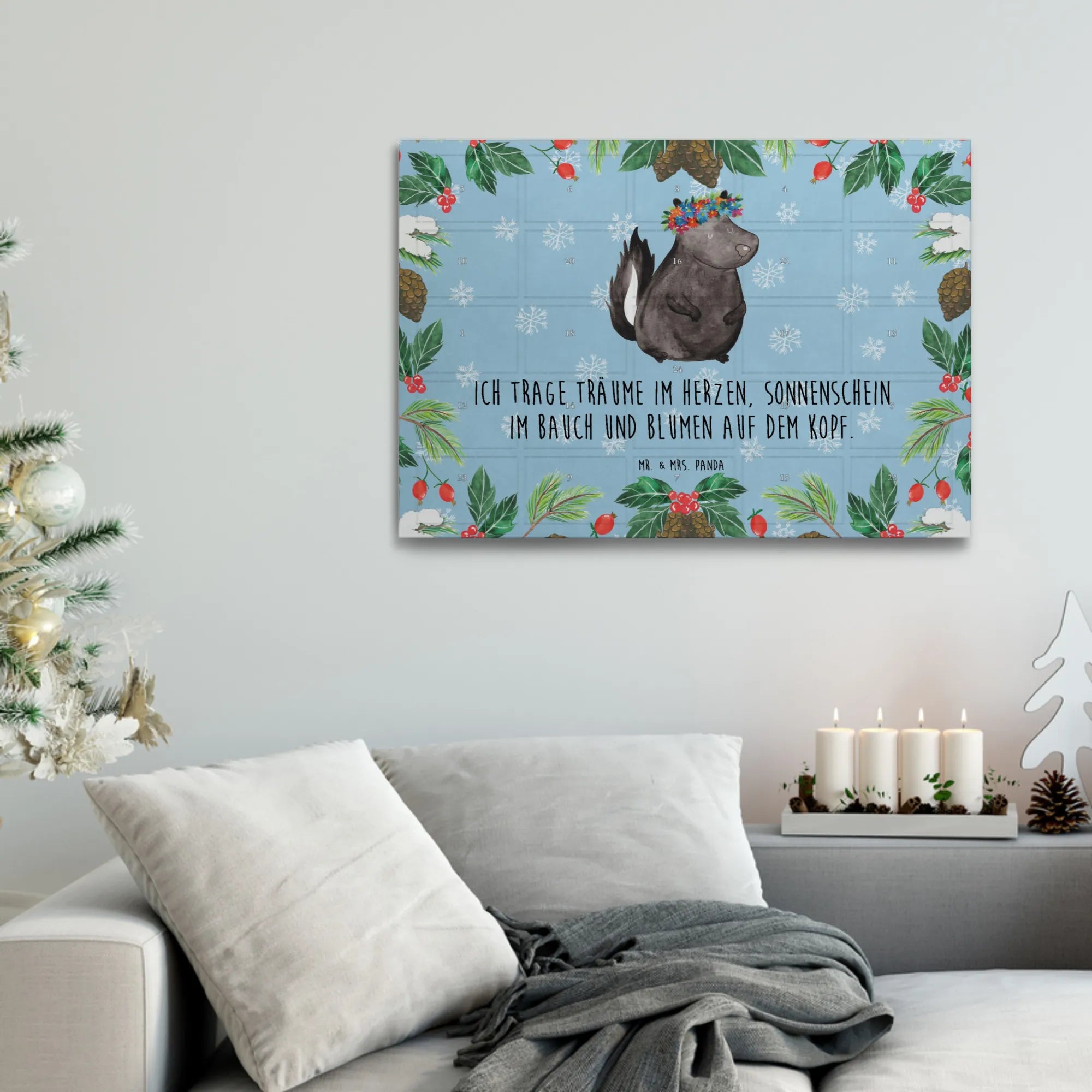 Der Tee Adventskalender Stinktier Blumenmädchen von Mr. & Mrs. Panda ist nicht nur ein Genuss für die Sinne, sondern auch ein ganz besonderes Geschenk für die kalte Jahreszeit. Mit liebevollen Aquarellmotiven, die ein süßes Stinktier zeigen, das mit einem bunten Blumenkranz geschmückt ist, zaubert dieser Kalender ein Lächeln auf jedes Gesicht.
