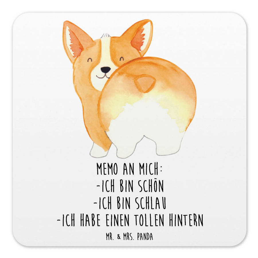 Unser quadratisches Untersetzer Set aus der Hunde Kollektion bringt Hundeliebe auf deinen Tisch. Das Motiv zeigt einen entzückenden Corgi, der stolz seinen Po in die Kamera hält, mit dem frechen Spruch: Memo an mich: - ich bin schön - ich bin schlau - ich habe einen tollen Hintern. Dieses Design vereint Humor und liebevolle Illustration – perfekt für alle, die Glasuntersetzer, Tassenuntersetzer oder Becheruntersetzer mit Persönlichkeit suchen. 🐶