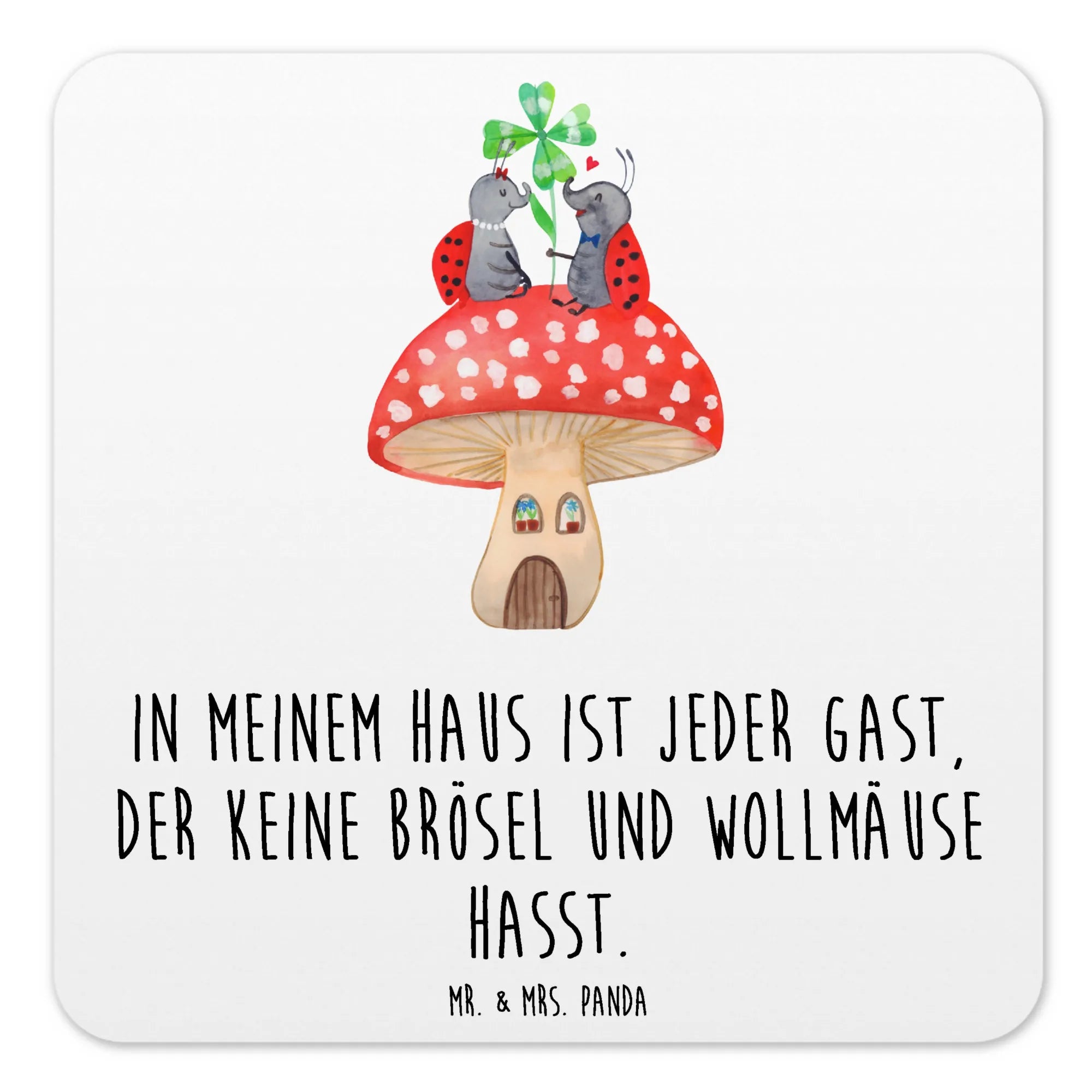 Stell dir vor: Ein behagliches Zuhause, nicht aus Stein und Mörtel, sondern aus Liebe und Wärme. Wo Marienkäfer sich wie Könige fühlen, auf einem kuscheligen Fliegenpilz sitzend. Genau das fängt unser Motiv 'Marienkäfer Paar Fliegenpilz' ein. Hier sehen wir zwei entzückende Marienkäfer, ein Symbol für Glück und Harmonie, die auf einem Fliegenpilz miteinander flüstern. Wie bei Mr. & Mrs. Panda üblich, wird jedes Detail mit Liebe und Sorgfalt gezeichnet, sodass das Bild nicht nur ein Augenschmaus, sondern auch eine Herzensangelegenheit wird. Unser Spruch „In meinem Haus ist jeder Gast, der keine Brösel und Wollmäuse hasst“ lädt dich ein, über die Bedeutung von 'zu Hause' nachzudenken. Es geht nicht um Perfektion, sondern darum, einen Ort zu haben, an dem man sich geliebt und willkommen fühlt. Ein zauberhaftes Motiv, das nicht nur dein Zuhause verschönert, sondern auch eine Philosophie des Herzens offenbart.
