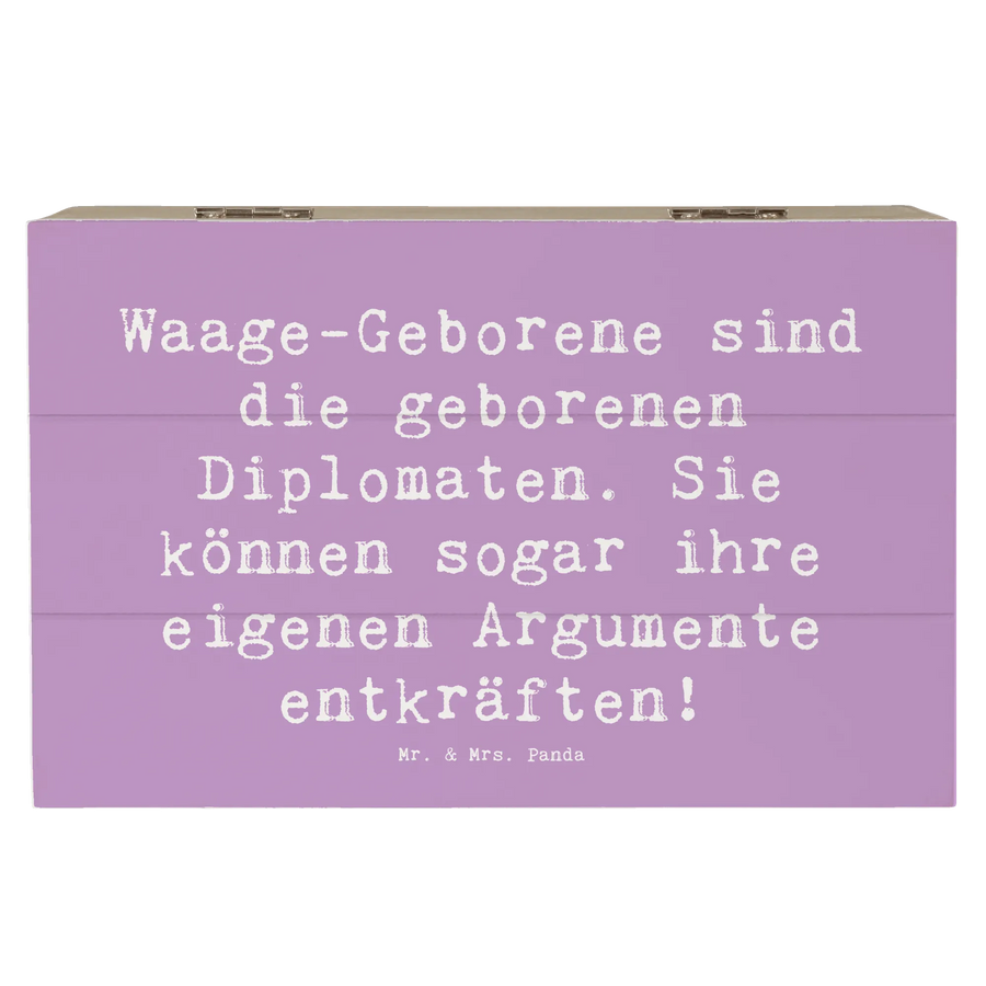 Die wunderschöne Holzkiste von Mr. & Mrs. Panda ist das perfekte Geschenk für alle Waage-Geborenen! Mit einem liebevoll handgezeichneten Motiv und dem Spruch 'Waage-Geborene sind die geborenen Diplomaten. Sie können sogar ihre eigenen Argumente entkräften!' bietet diese Holzkiste einen einzigartigen Charme.