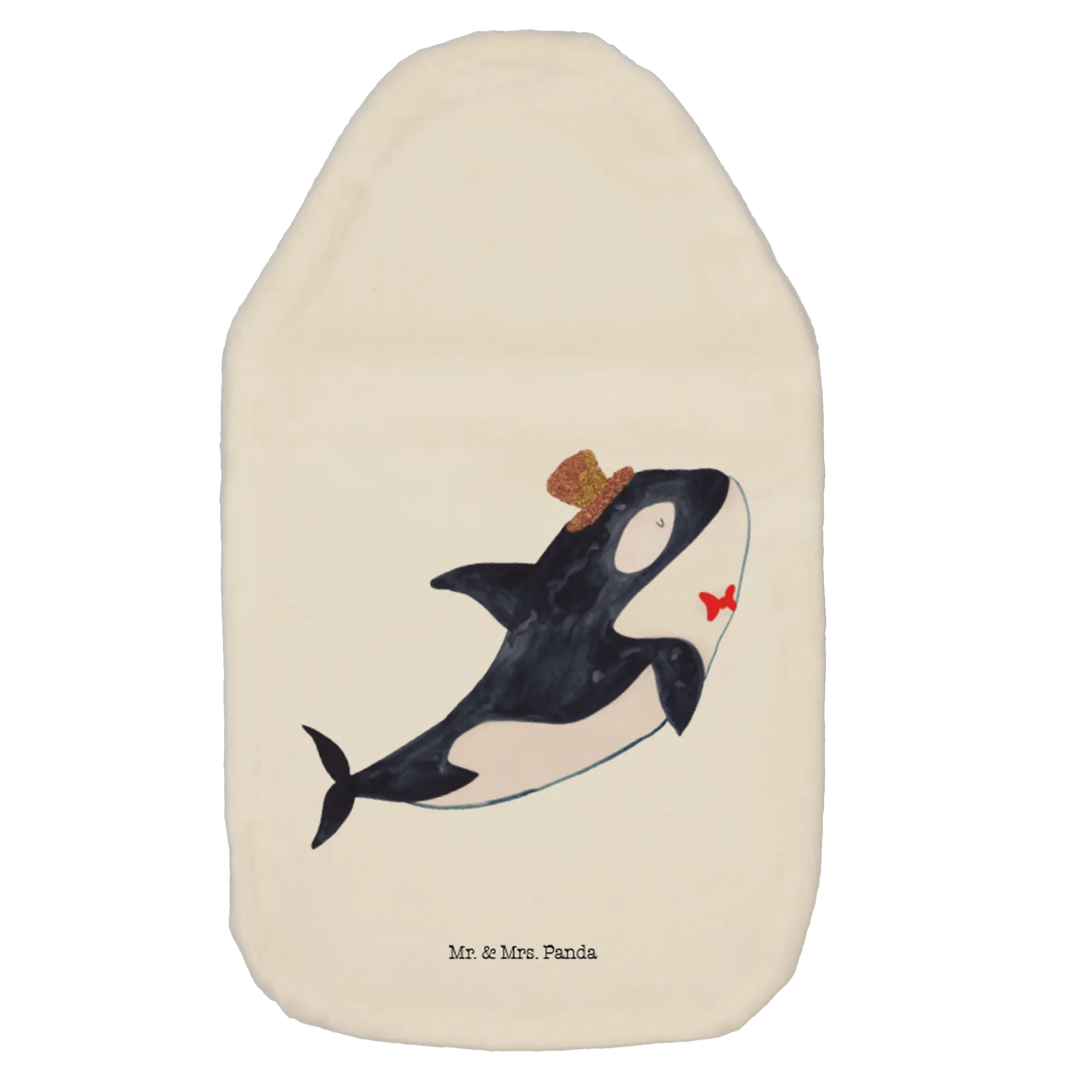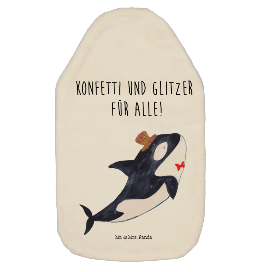 Der freundlich lächelnde Orca im skizzierten Aquarell-Stil trägt einen charmanten Zylinder und hat einen kleinen roten Fisch an seiner Wange, was dem gesamten Design einen extra liebevollen Touch verleiht. Die abnehmbare, superflauschige Hülle aus Kunstfaser macht die Wärmflasche nicht nur gemütlich, sondern auch pflegeleicht, da der Bezug bei 30°C waschbar ist.