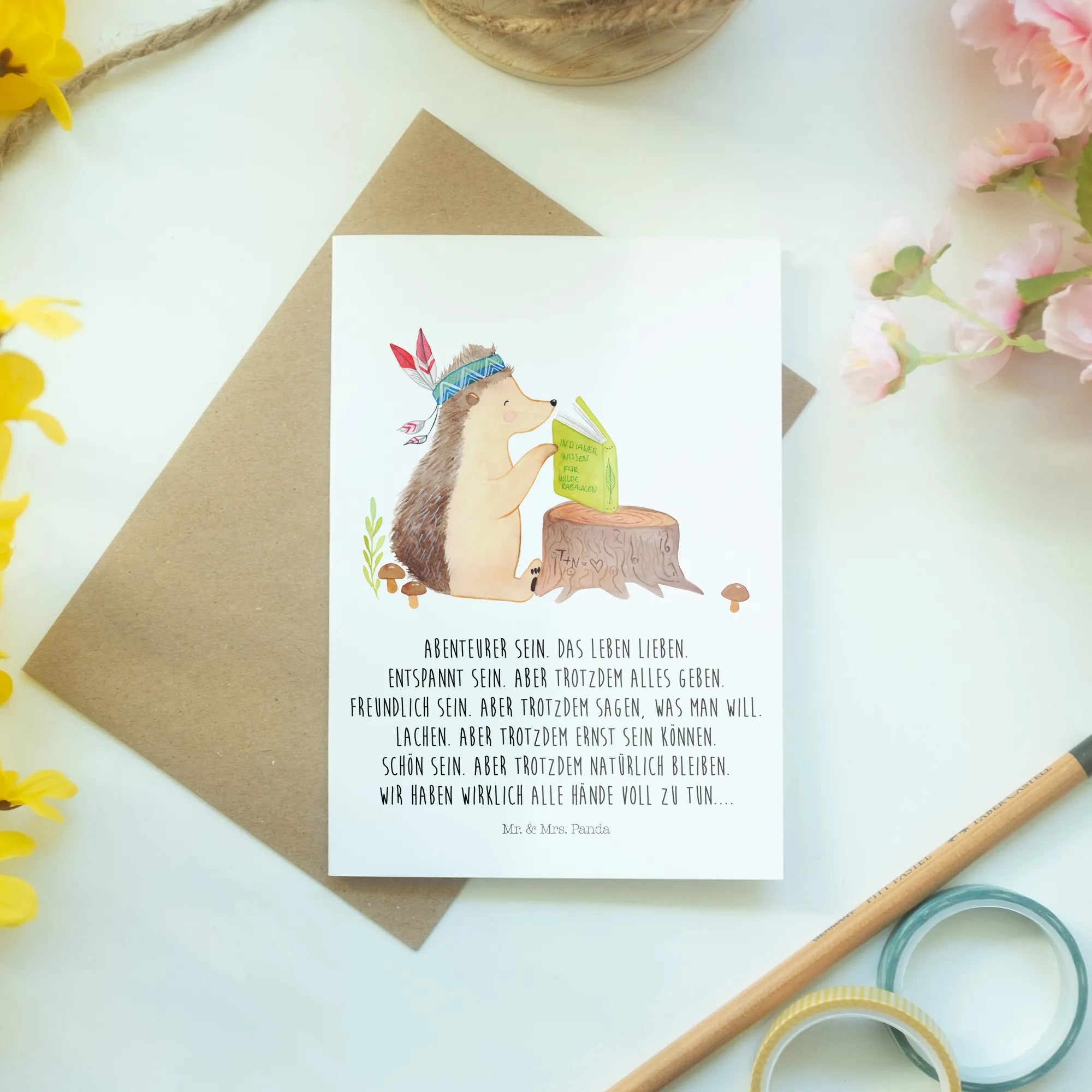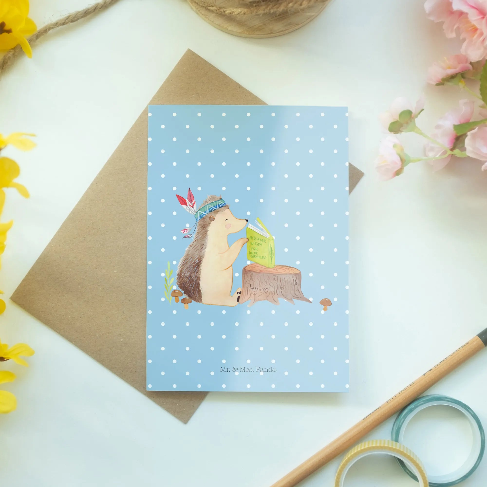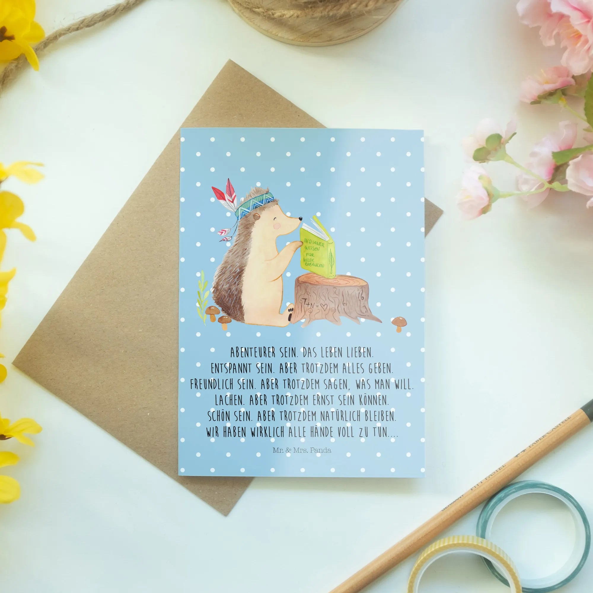 Eine Grußkarte voller Abenteuer & Waldzauber 🌲✨ – Unsere Grußkarte Igel Indianer aus der Waldtiere Kollektion von Mr. & Mrs. Panda vereint liebevolle Illustration und einen tiefsinnigen Spruch. Auf dem pastellblauen Hintergrund liest ein kleiner Igel mit Federschmuck auf einem Baumstumpf ein Buch über Abenteuer, begleitet von dem inspirierenden Text: „Abenteurer sein. Das Leben lieben. Entspannt sein...“