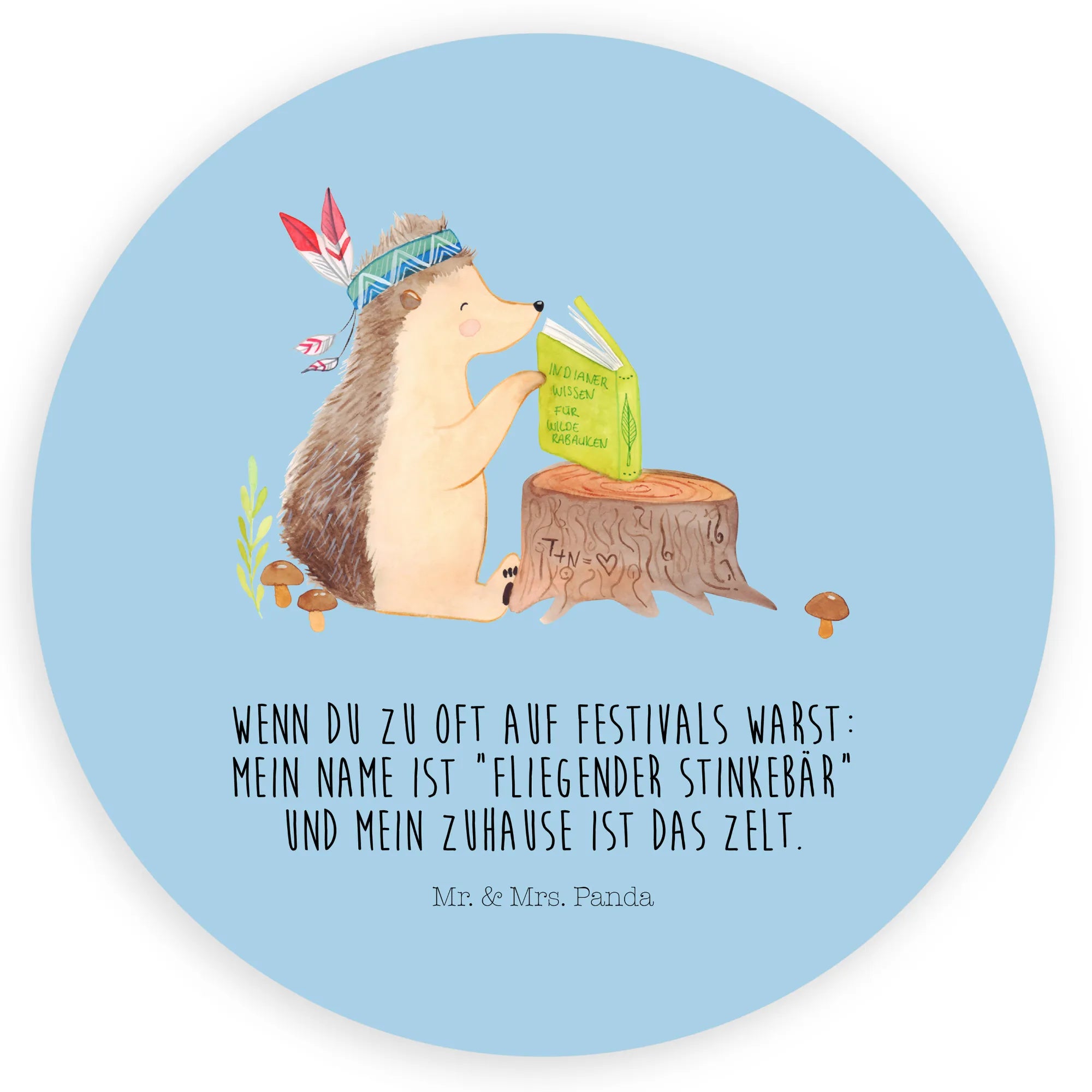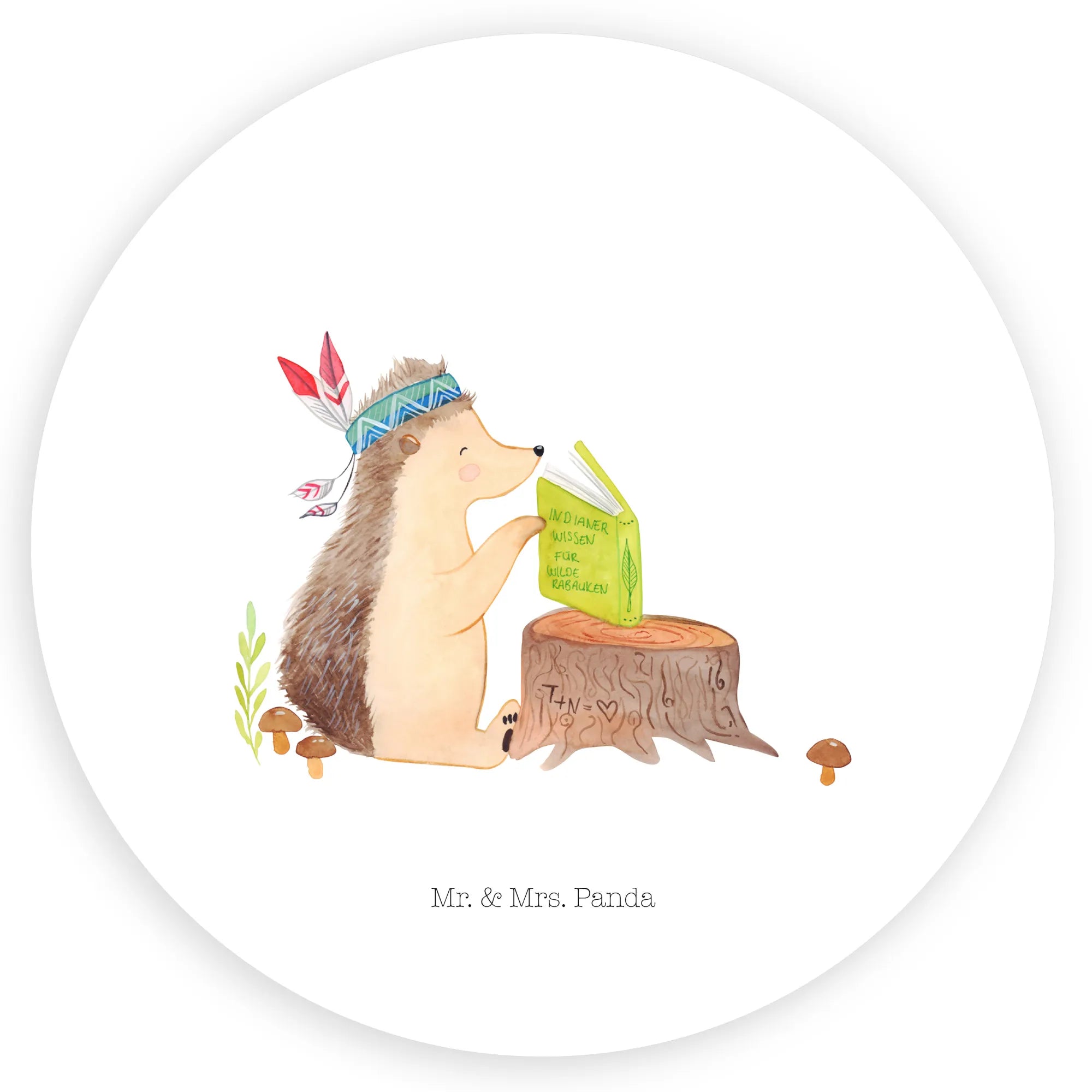 Tauche ein in die zauberhafte Welt von Mr. & Mrs. Panda mit unserem wunderschönen 120mm Rund Aufkleber. Dieses kleine Kunstwerk aus unserer beliebten Waldtiere-Kollektion zeigt den charmanten Igel Indianer, der mit seinem detailreichen Federschmuck auf einem alten Baumstumpf sitzt und ganz versunken in einem Buch über große Abenteuer liest. 🦔✨