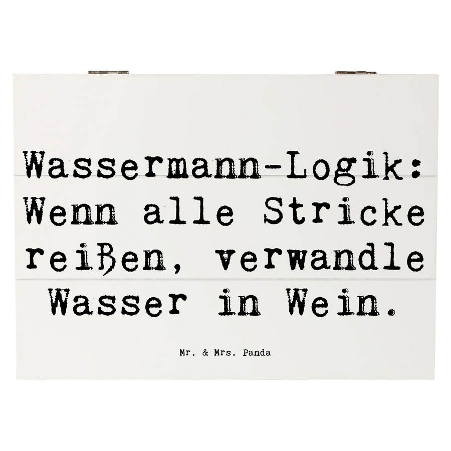 Die Holzkiste Wassermann von Mr. & Mrs. Panda ist ein zauberhaftes Geschenk, das ideal für Astrologie-Enthusiasten und Sternzeichen-Fans ist. Diese wunderschöne Erinnerungskiste ist nicht nur ein perfekter Aufbewahrungsort für eure liebsten Schätze, sondern auch ein stilvolles Deko-Element für jedes Zuhause. Mit dem besonderen Motiv des Wassermanns, der mit dem Spruch 'Wassermann-Logik: Wenn alle Stricke reißen, verwandle Wasser in Wein.' verziert ist, lässt sie Herzen höher schlagen.