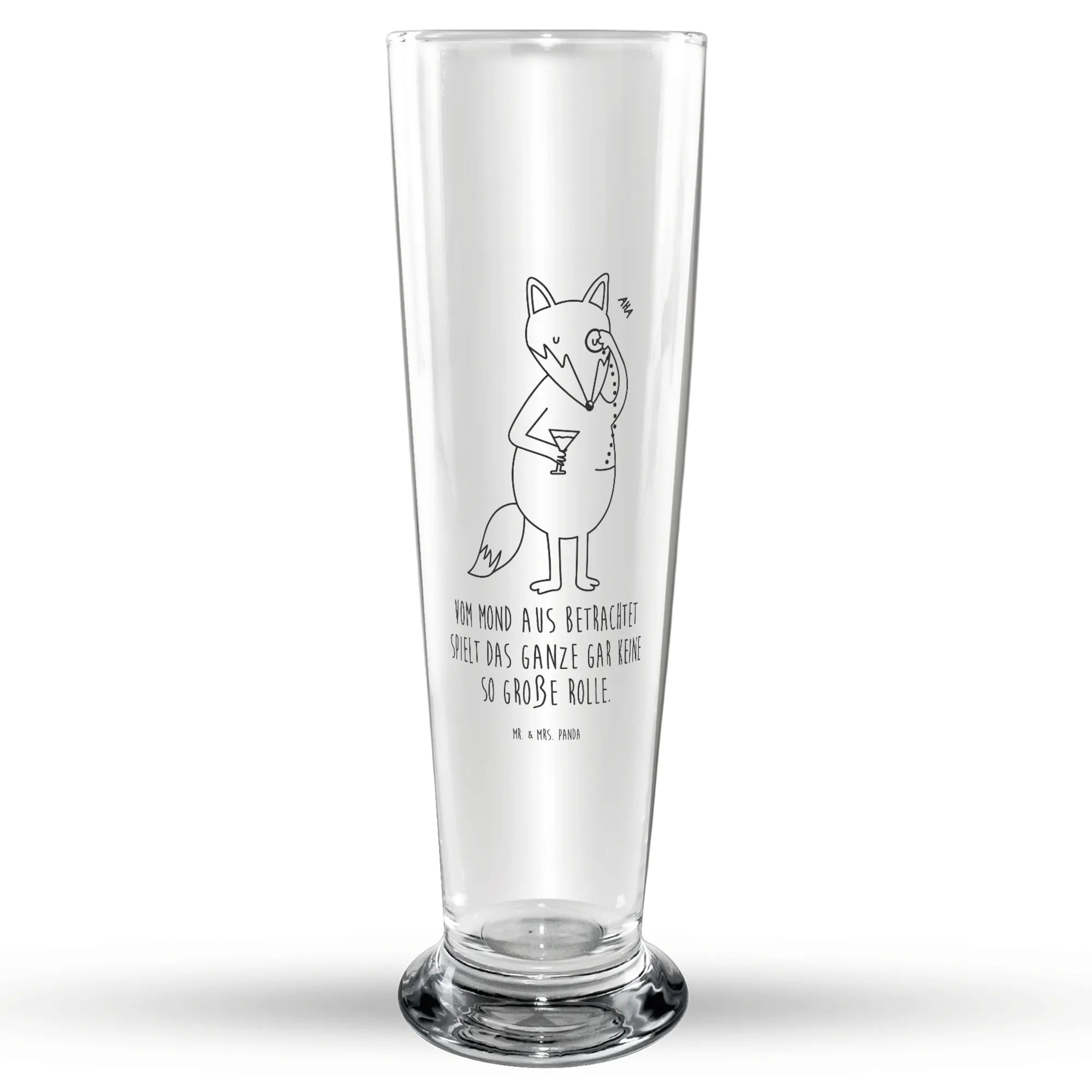 Die exquisite Lasergravur sorgt dafür, dass der Spruch 'Vom Mond aus betrachtet spielt das Ganze gar keine so große Rolle.' klar und deutlich wahrgenommen wird. Jeder Schluck aus diesem robusten Glas wird zu einem besonderen Erlebnis! Lass dich von den liebevollen Details des Fuchs Lord mit Monokel am Auge verzaubern!