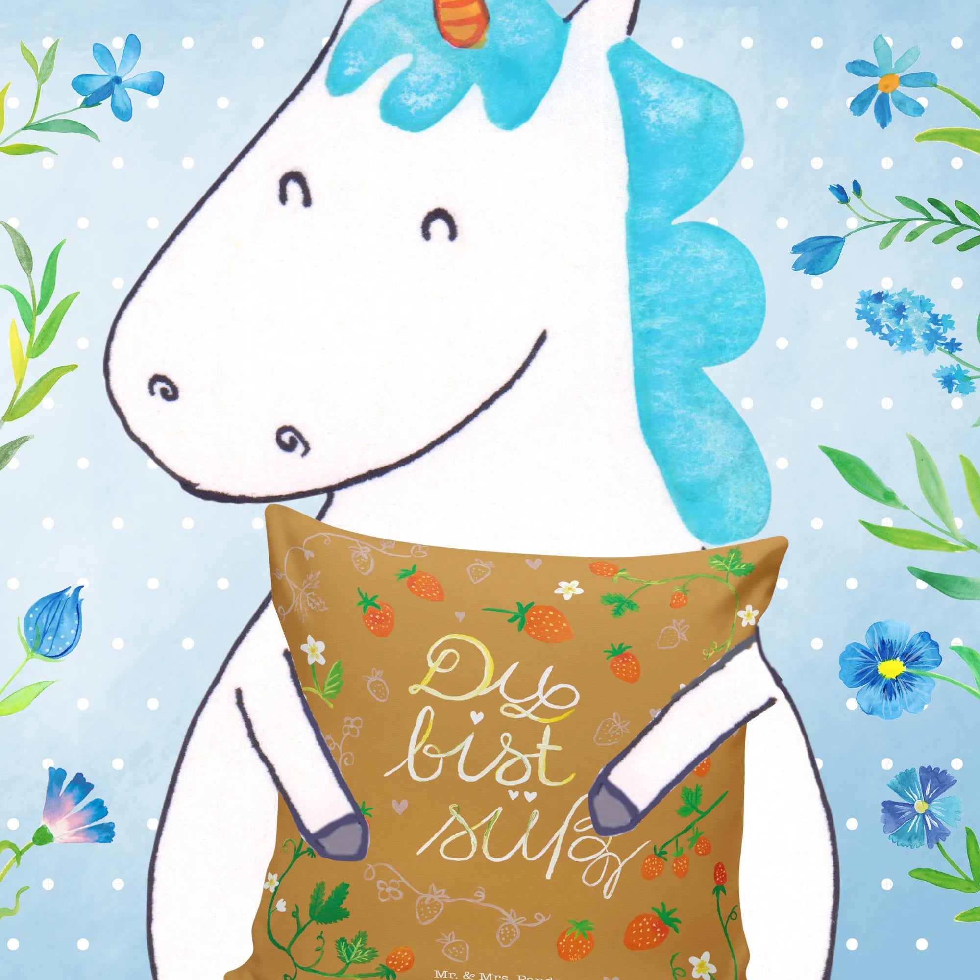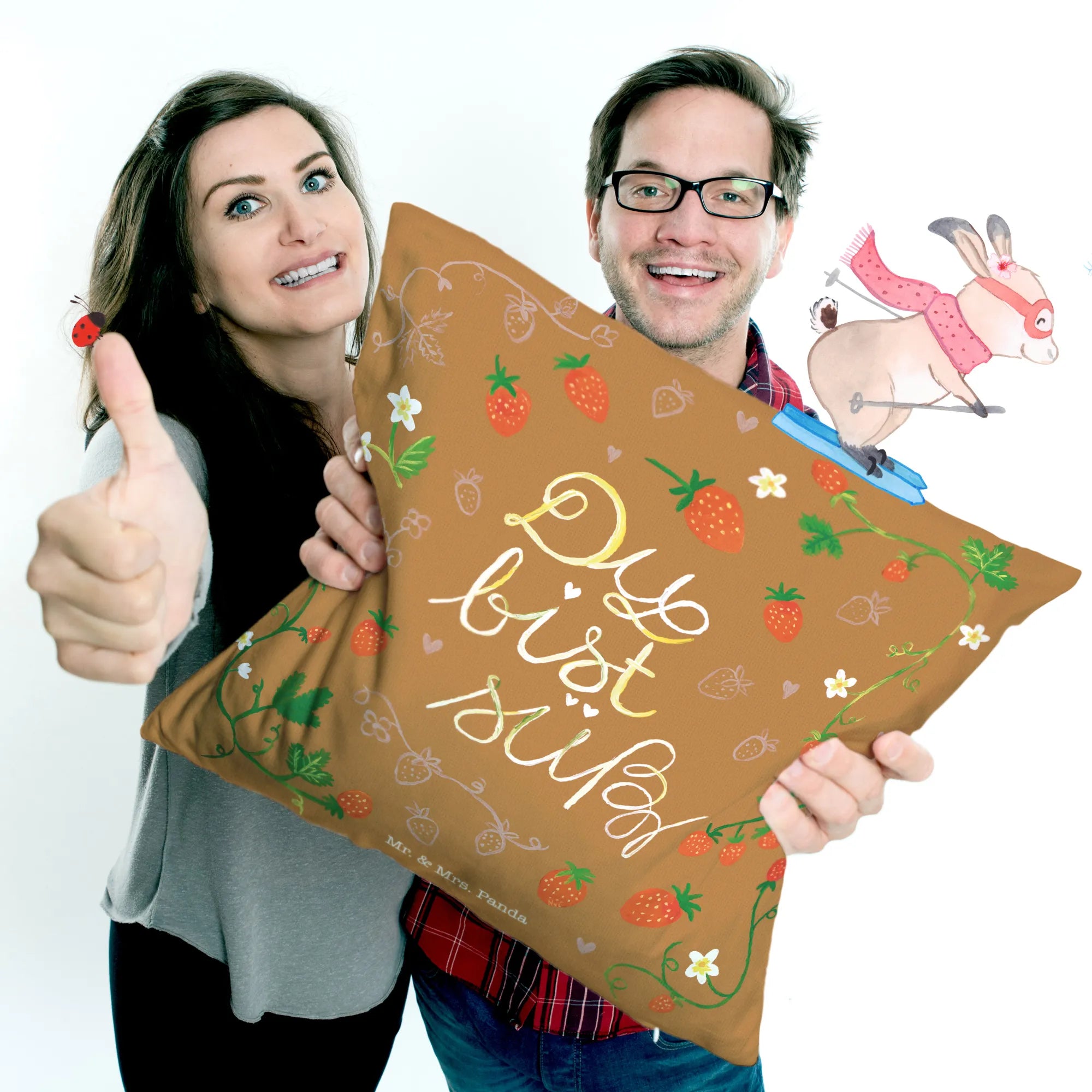 Das 40x40 Kissen mit dem süßen Erdbeeren-Motiv "Du bist süß" aus der Wild & Free-Kollektion von Mr. & Mrs. Panda ist das perfekte Geschenk für jeden, der die Natur und liebevoll gestaltete Deko schätzt. Dieses Kissen bietet nicht nur eine wunderbare stimmungsvolle Atmosphäre, sondern ist auch unglaublich bequem. Mit seiner superweichen Mikrofaser sorgt es für ein kuscheliges Erlebnis und ist damit ideal für dein Sofa, Bett oder als Dekoration im Wohnzimmer.