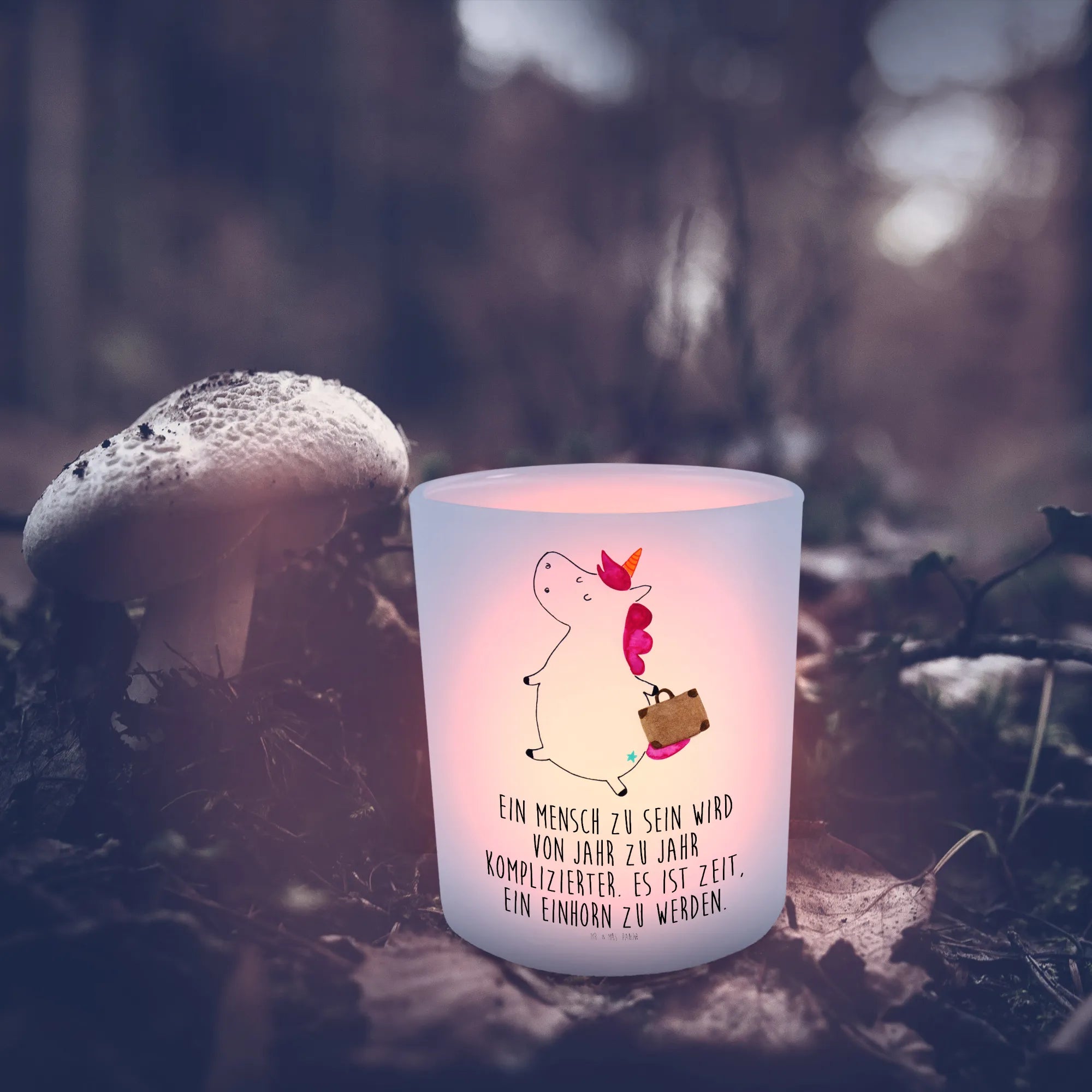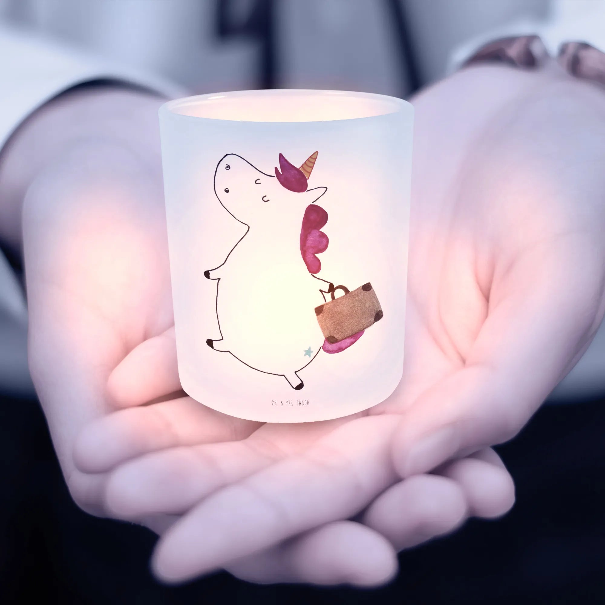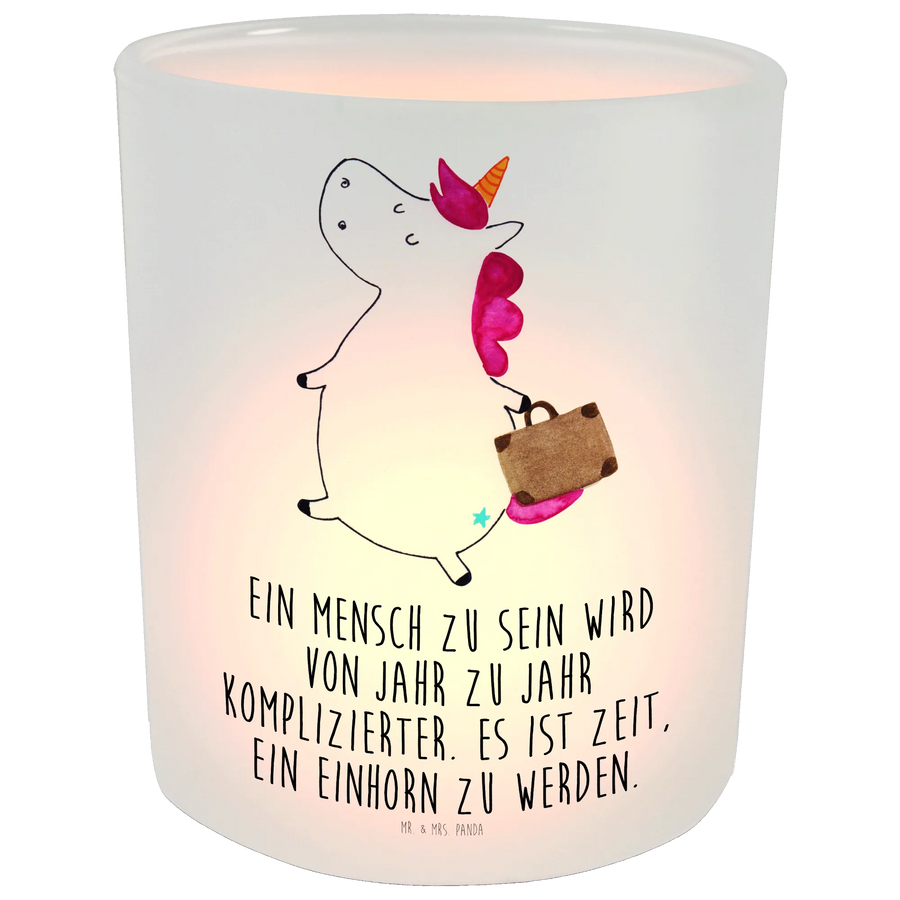Ein wunderschönes edles Windlicht von Mr. & Mrs. Panda, das alle Herzen höherschlagen lässt! Mit seinem zauberhaften Motiv eines reisefreudigen Einhorns, das fröhlich mit einem Koffer in der Hand unterwegs ist, verwandelt es jeden Raum in eine magische Oase.