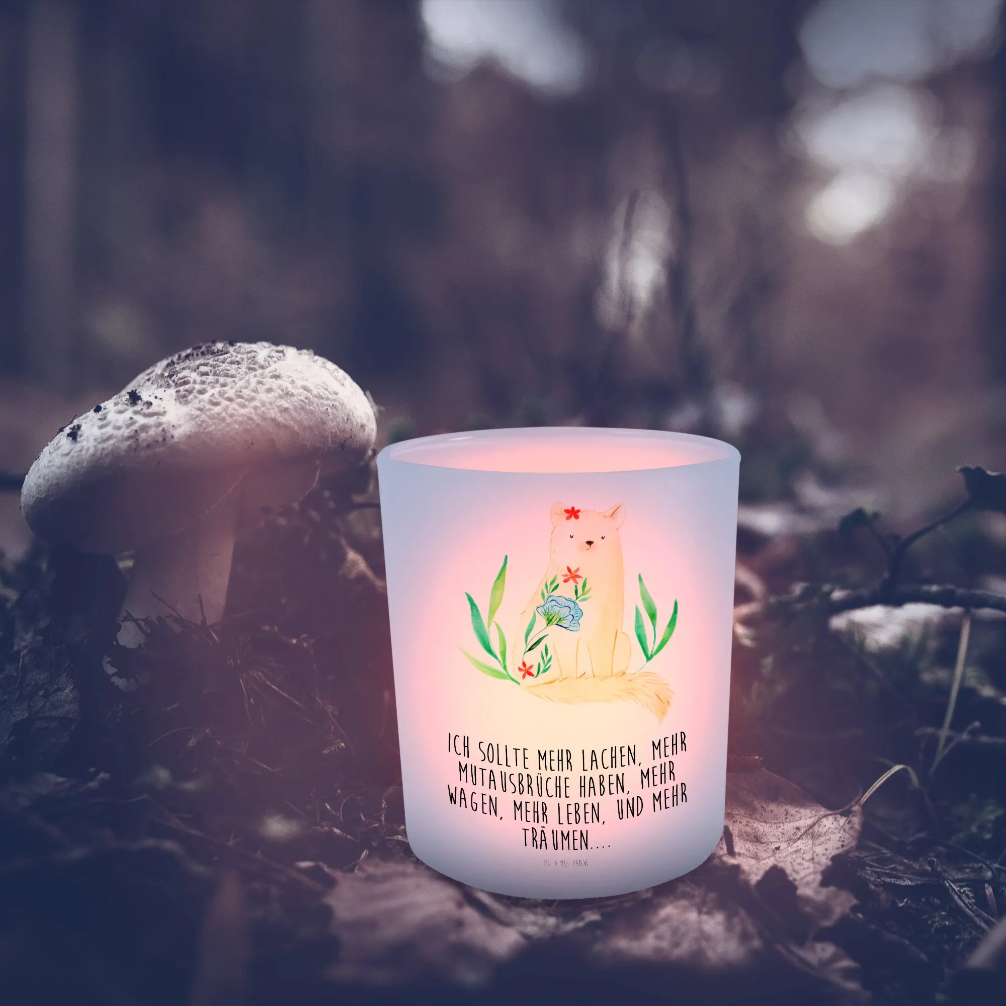 Erlebe die zauberhafte Wirkung des Windlichts von Mr. & Mrs. Panda, das mit seinen kompakten Abmessungen von 70 mm x 80 mm perfekt auf jedes Regal oder jeden Tisch passt. Hergestellt aus edlem, satiniertem Glas, bereichert es deine Einrichtung mit stilvollen Motiven und herzerwärmenden Sprüchen. Ideal zum Schutz deiner Teelichter sorgt es für ein behagliches Licht, das besonders in der Abenddämmerung zur Geltung kommt. Seine hitzebeständige Eigenschaft macht es zu einem tollen Begleiter für romantische Abende. Vergiss nicht, es mit sanfter Handwäsche zu pflegen, um die brillanten Designs lange zu erhalten. Lass dir dieses kleine Stück Eleganz nicht entgehen!