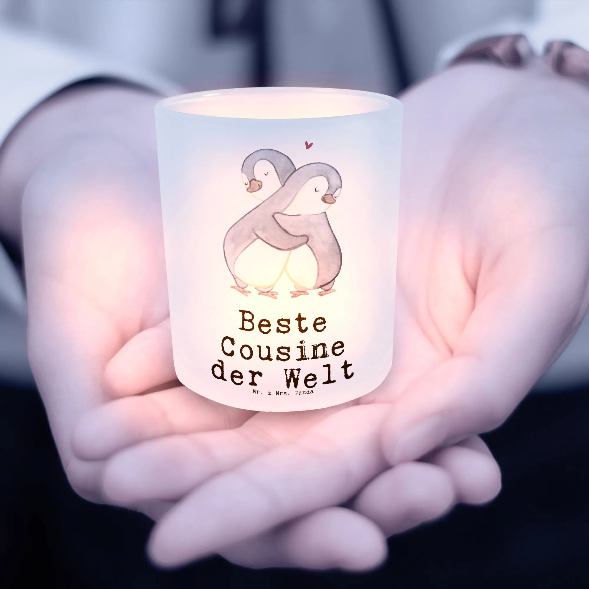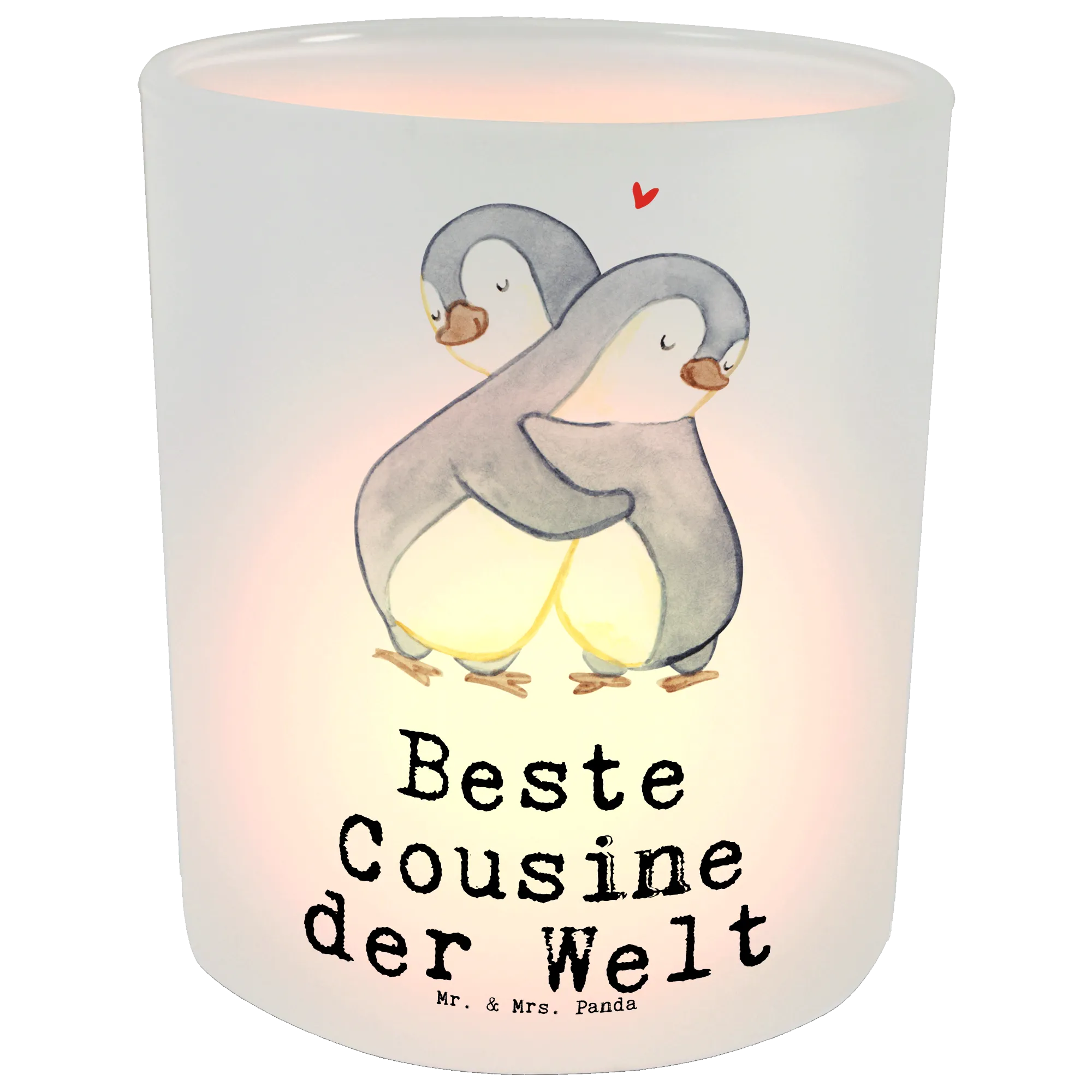 Dieses zauberhafte Glas Windlicht vereint liebevolles Design und praktischen Nutzen. Auf satiniertem Glas siehst Du zwei niedliche Pinguine, die sich eng umarmen, dazu der herzliche Schriftzug „Beste Cousine der Welt“. Ein echtes Geschenk voller Gefühl aus der Kollektion Beziehungen, die viele handgemalte Aquarellmotive von Mr. & Mrs. Panda umfasst.