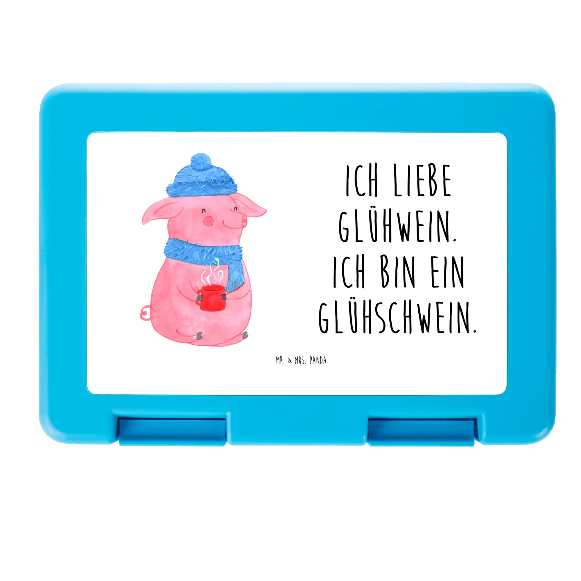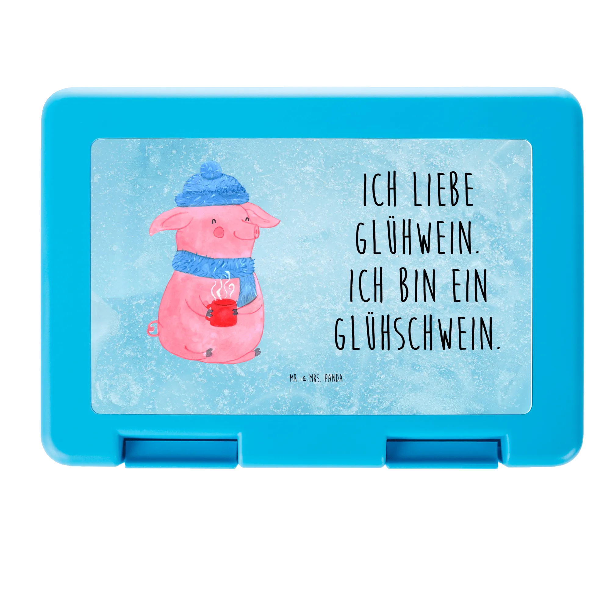 Das farbenfrohe Motiv zeigt ein fröhliches, rosa Glühschwein mit einer blauen Mütze und einem passenden Schal, das eine dampfende Tasse Glühwein in den Händen hält. Der Spruch 'Ich liebe Glühwein. Ich bin ein Glühschwein.' macht die Brotdose zu einem echten Hingucker und bringt winterliche Gemütlichkeit in Deinen Alltag.