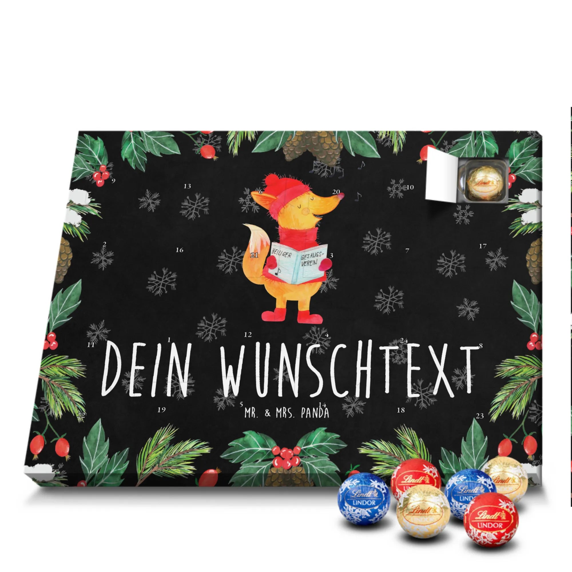 Personalisierter Schokoladen Adventskalender von Mr. & Mrs. Panda – perfekt für alle, die es süß und persönlich mögen. Unser Adventskalender ist mit liebevollen Illustrationen und charmanten Sprüchen von Mr. & Mrs. Panda bedruckt und kann mit deinem Namen oder Wunschtext individualisiert werden. Die brillante Druckqualität und die seidenmatte Oberflächenveredelung sorgen für ein edles Erscheinungsbild, zudem sind die Seitenflächen bedruckt. Maße: 233 mm x 178 mm x 24 mm. Du kannst den Kalender aufstellen oder aufhängen – je nachdem, wie du ihn am schönsten präsentierst. Gefüllt mit Lindt Lindor Schokolade: 24 einzeln verpackte Markenschokoladen Kugeln in drei köstlichen Sorten. Geschmacksrichtungen: Vollmilch, Feinherb und Weiße Schokolade. Zutaten: Zucker, pflanzliches Fett (Kokosnuss, Palmkern), Kakaobutter, Vollmilchpulver, Kakaomasse, Milchzucker, Magermilchpulver, Butterreinfett, Emulgator (Sojalecithin), Gerstenmalzextrakt, Aromen. Besondere Hinweise: Kann Haselnüsse und Mandeln enthalten. Ob als Advents-Überraschung für deine Liebsten oder als kleines Geschenk für Kollegen – dieser Kalender bringt personalisierten Genuss in die Vorweihnachtszeit.