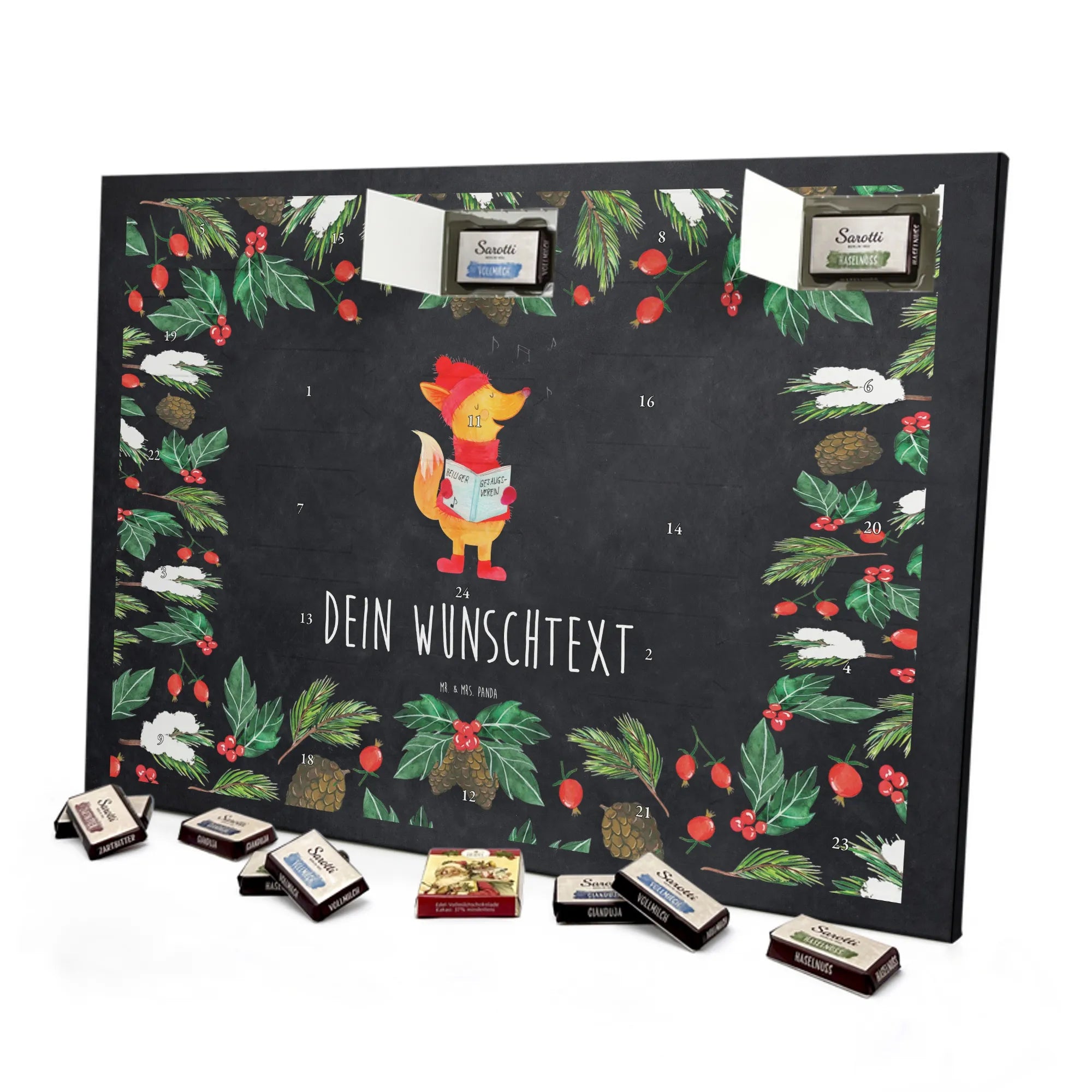 Wunderschöner Personalisierter Schoko Adventskalender von Mr. & Mrs. Panda – dein perfekter Begleiter durch die Vorweihnachtszeit! Dieser Adventskalender ist liebevoll bedruckt mit zauberhaften Motiven und witzigen Sprüchen von Mr. & Mrs. Panda und lässt sich ganz individuell mit deinem Wunschnamen oder Wunschtext personalisieren. Die brillante Druckqualität und die seidenmatte Oberflächenveredelung sorgen dafür, dass die Farben schön leuchten und sich der Kalender edel anfühlt. Auch die Seitenflächen sind bedruckt, sodass er von allen Seiten ein Hingucker ist. Maße: 355 mm x 245 mm x 11 mm. Eine besondere Eigenschaft: Du kannst ihn bequem aufhängen oder aufstellen – je nachdem, wie du ihn präsentieren möchtest. Gefüllt ist der Kalender mit einer hochwertigen Füllung aus 24 einzeln verpackten Schokoladentäfelchen in vier köstlichen Geschmacksrichtungen. Insgesamt enthält er 107 g Markenschokolade von Sarotti® und Confiserie Heidel® in den Sorten Vollmilch, Nougat, Zartbitter und Haselnuss. Bitte beachte: Es handelt sich um einen Kalender gefüllt mit Sarotti® und Confiserie Heidel® Markenschokolade. Verschenke Freude, Individualität und süße Momente – ideal als Geschenk für Freunde, Familie oder dich selbst. Mit diesem persönlichen Adventskalender machst du jeden Tag im Dezember zu einem kleinen Fest.