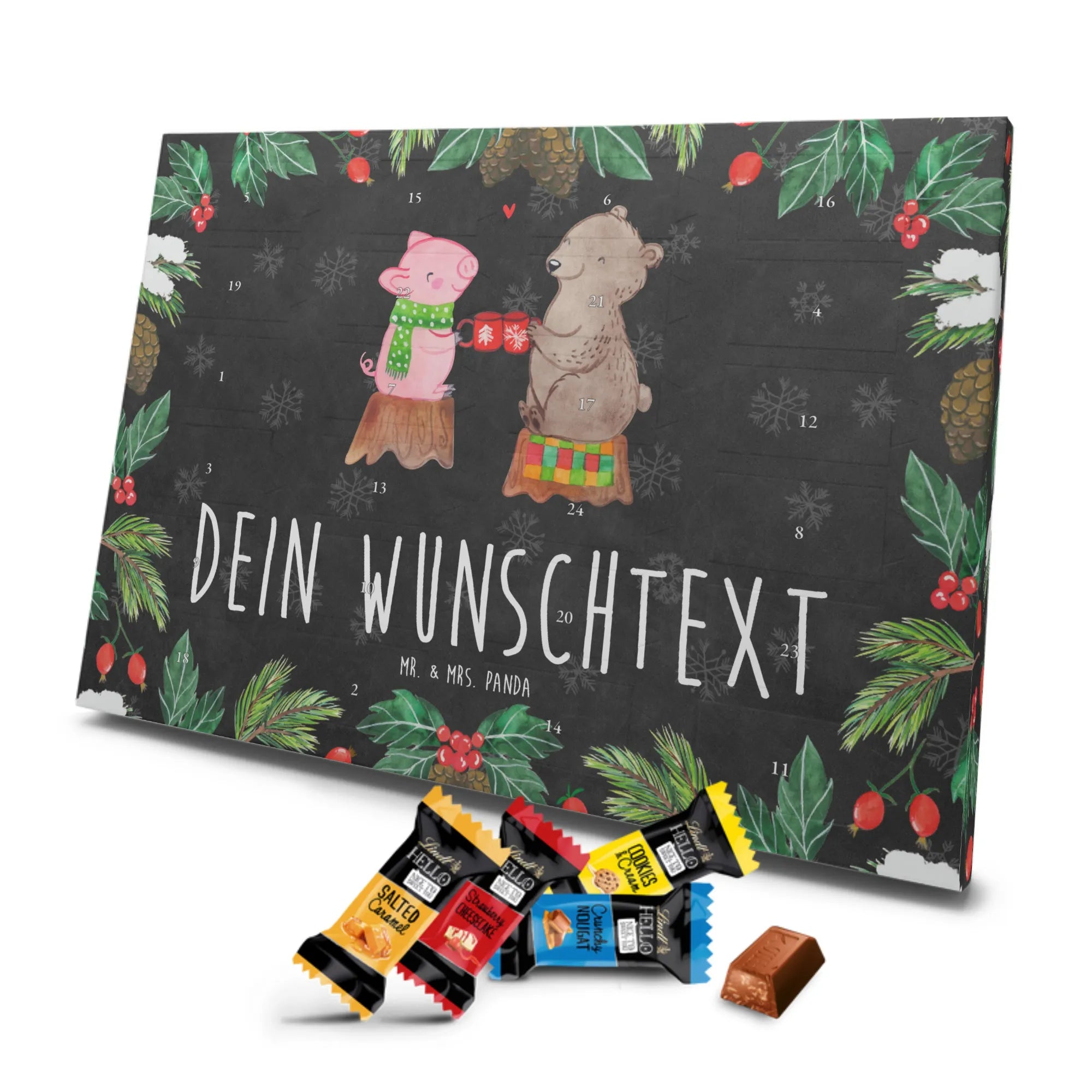 🐼 Personalisierter Schokoladen Adventskalender mit Mr. & Mrs. Panda Motiven, gefüllt mit Lindt Hello.