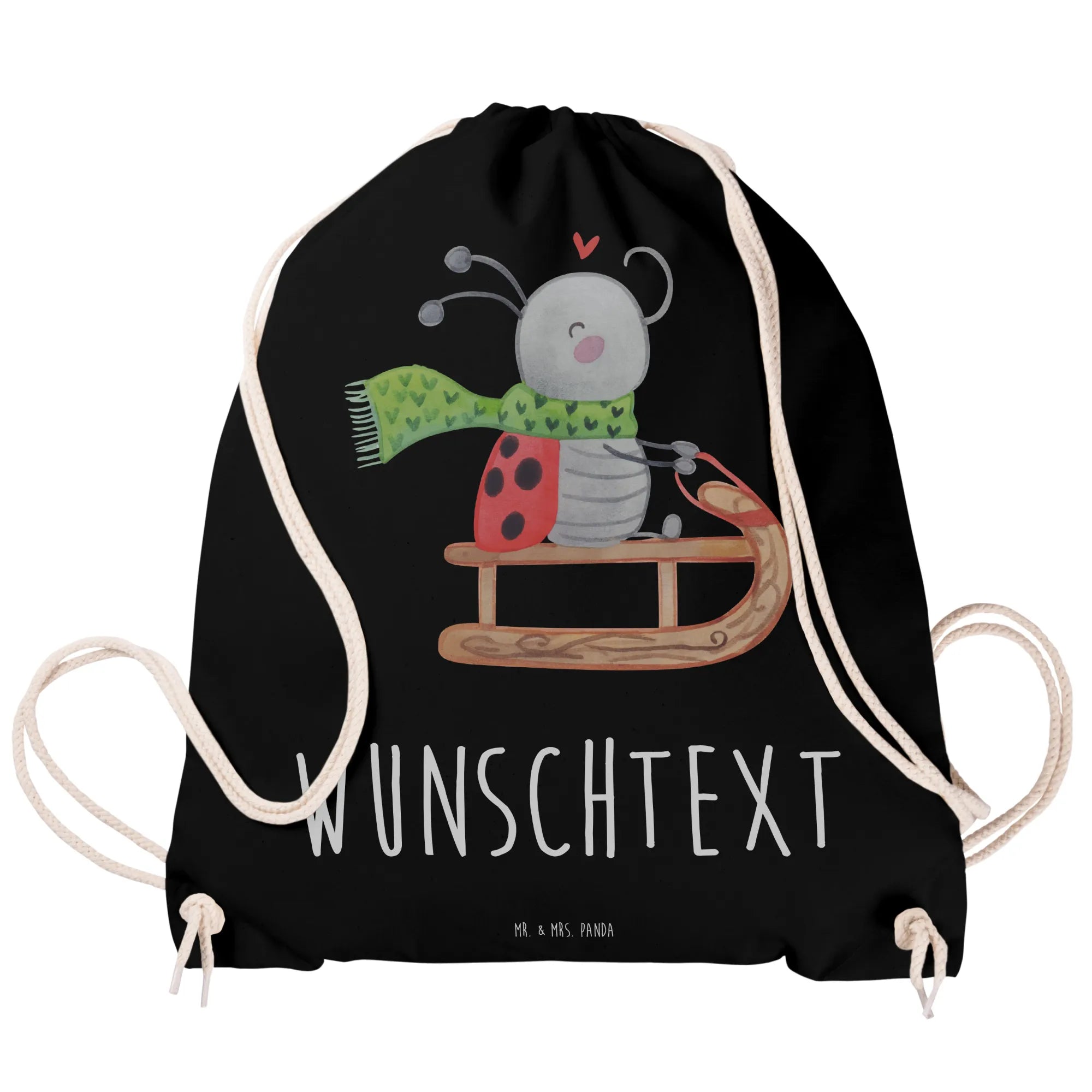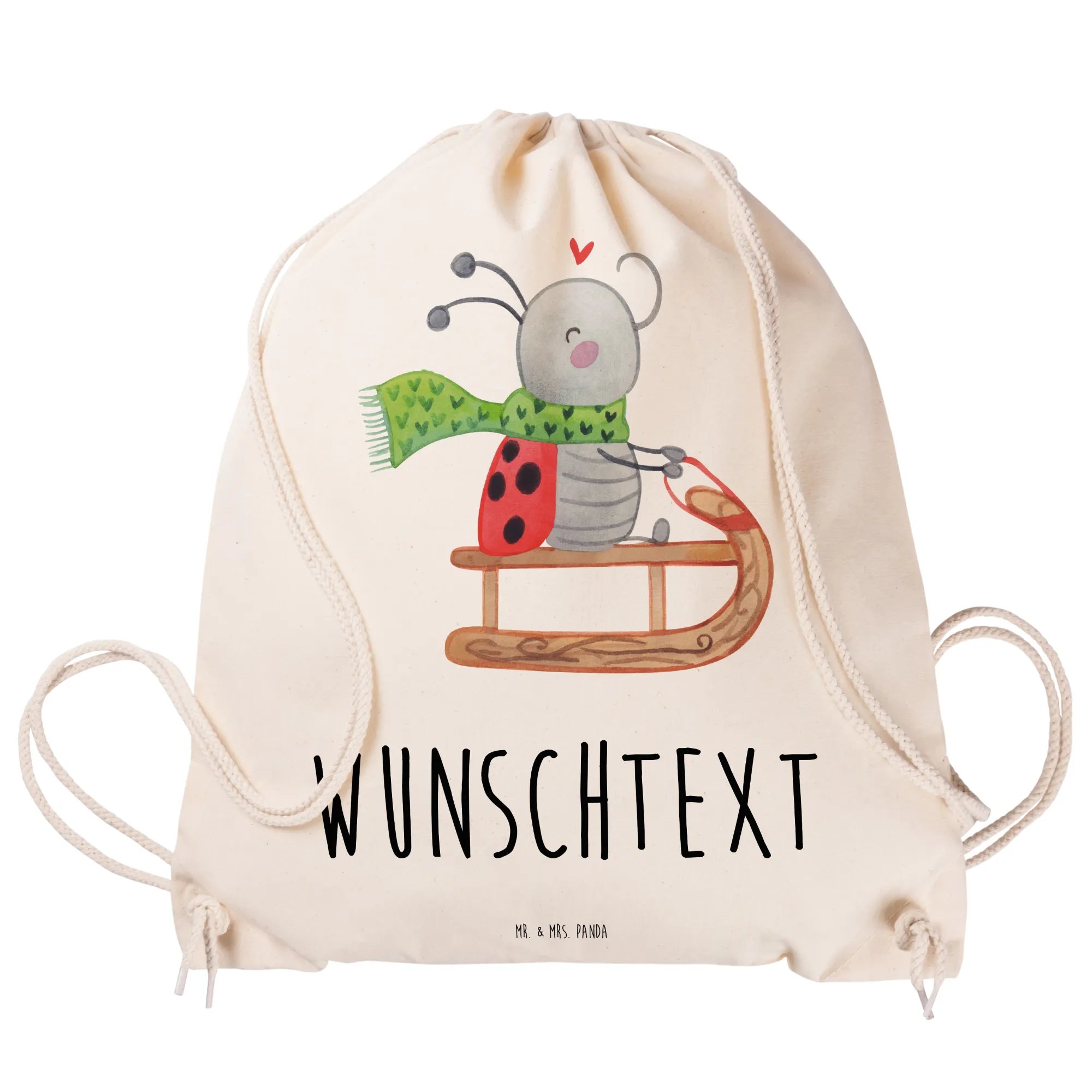 Du kannst deinen Sportbeutel ganz nach deinen Wünschen gestalten. Einfach den Namen oder einen Wunschtext eingeben und schon wird dein ganz persönlicher Sportbeutel hergestellt. Die strahlenden Farben und der freundliche Marienkäfer mit dem grünen Schal sorgen für gute Laune und erinnern an die zauberhaften Schlittenfahrten im Winter.