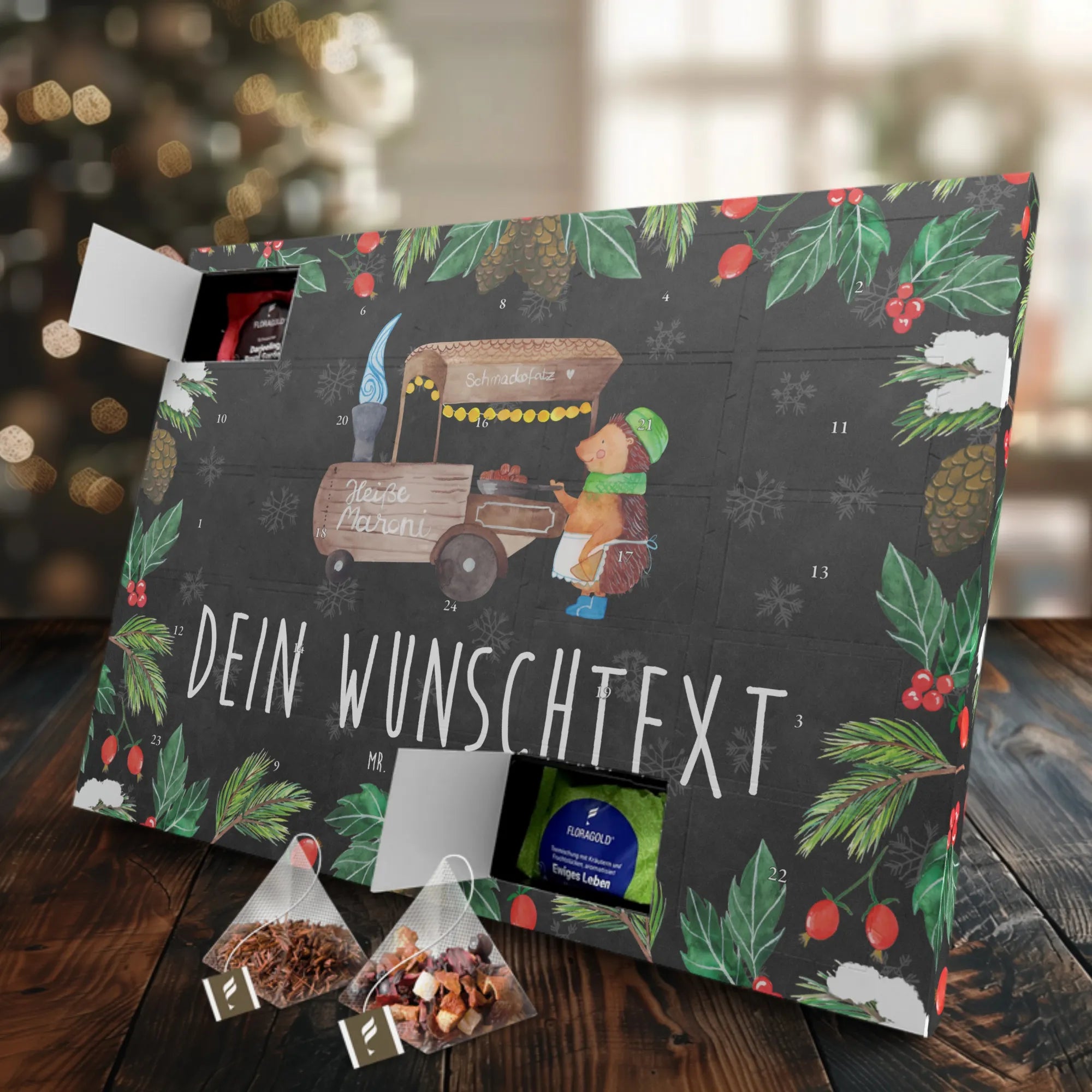 Der Adventskalender ist personaliserbar und lässt sich individuell mit deinem Wunschnamen oder einem ganz besonderen Text gestalten. Mit dem hübschen Igel, der in seinen blauen Stiefeln und dem grünen Schal vor dem Maronenstand steht, hast du nicht nur einen hübschen Blickfang, sondern auch eine liebevolle Erinnerung jeden Tag im Advent.