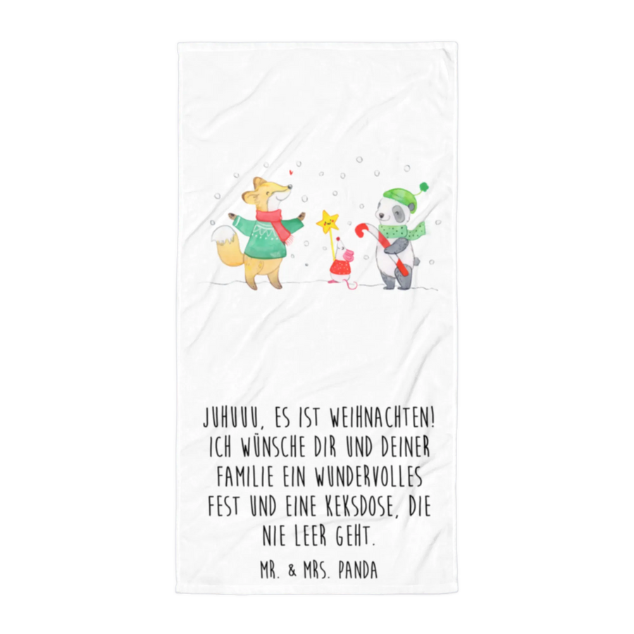 Das XL Badehandtuch "Winter Weihnachtsfreude" von Mr. & Mrs. Panda ist das perfekte Geschenk für die kalte Jahreszeit! Flauschig und einladend, versprüht dieses Handtuch die fröhliche Stimmung der Weihnachtszeit. Mit seiner liebevollen Gestaltung, die einen Fuchs, eine Maus und einen Panda in Schals und Mützen im Schnee zeigt, bringt es jeden zum Lächeln. Der Slogan "Juhuuu, es ist Weihnachten! Ich wünsche dir und deiner Familie ein wundervolles Fest und eine Keksdose, die nie leer geht." sorgt für gute Laune und macht dieses Handtuch zu einem ganz besonderen Geschenk oder einer tollen Dekoration für dein Badezimmer.