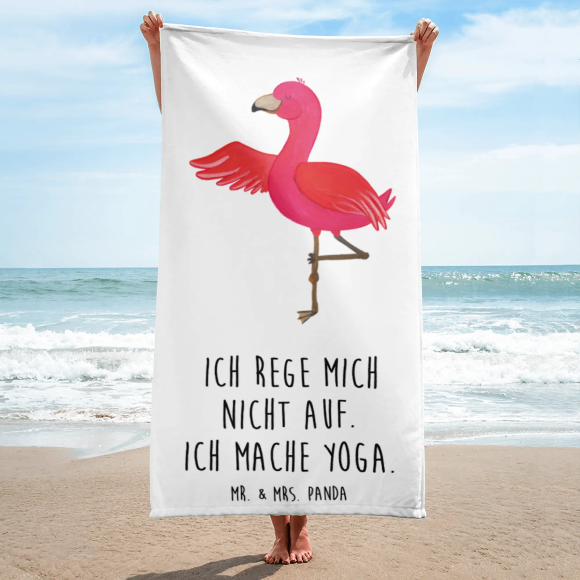 Entdecke das perfekte XL Badehandtuch Flamingo Yoga aus der charmanten Flamingo-Kollektion von Mr. & Mrs. Panda! Dieses extra große und flauschige Handtuch ist nicht nur ein praktischer Begleiter, sondern bringt auch eine fröhliche Sommerstimmung in dein Leben. Mit seinen lebhaft bedruckten Flamingo-Motiven und dem motivierenden Spruch "Ich rege mich nicht auf. Ich mache Yoga." wird dieser Badebegleiter zu deinem Must-Have beim Entspannen am Strand, im Schwimmbad oder in der Sauna.