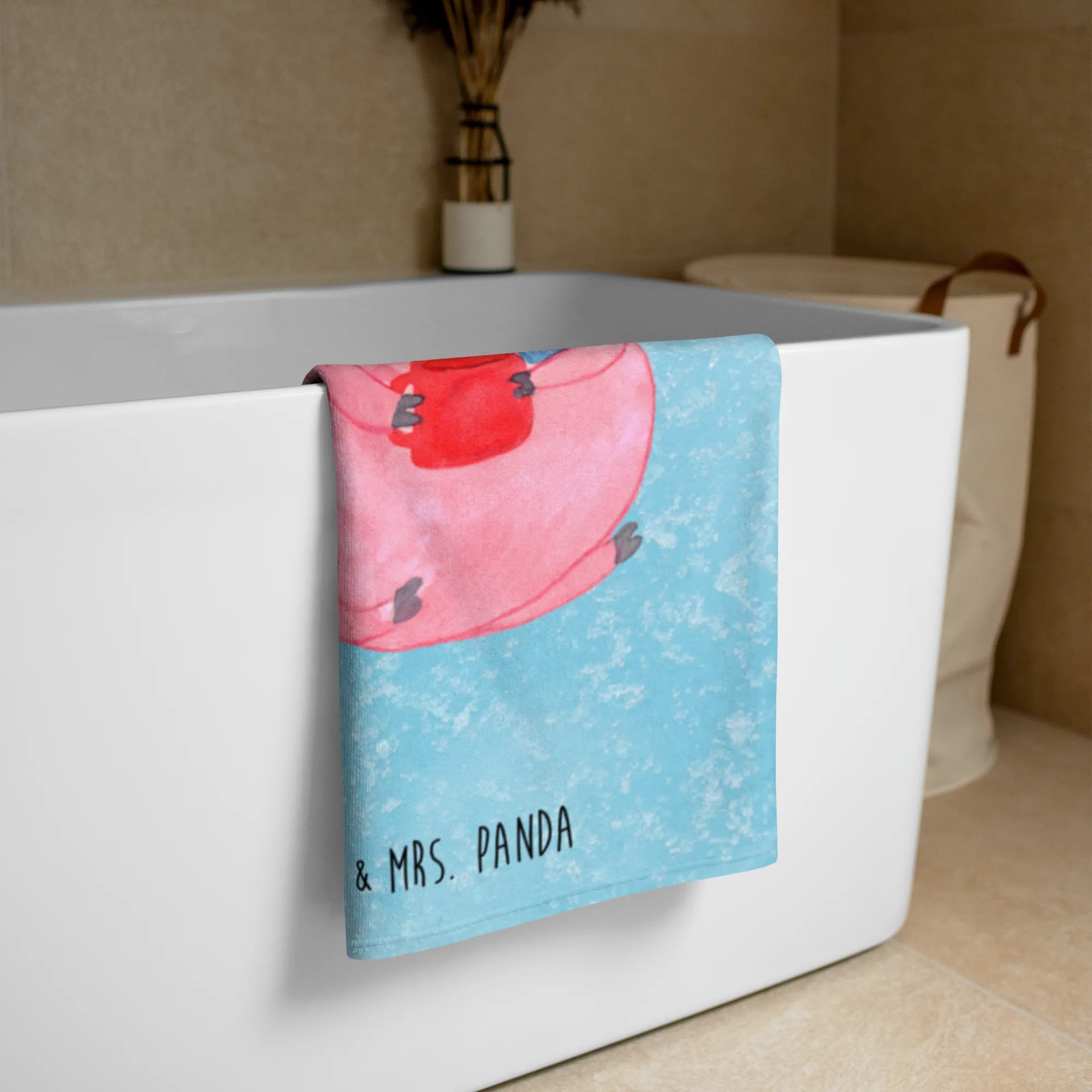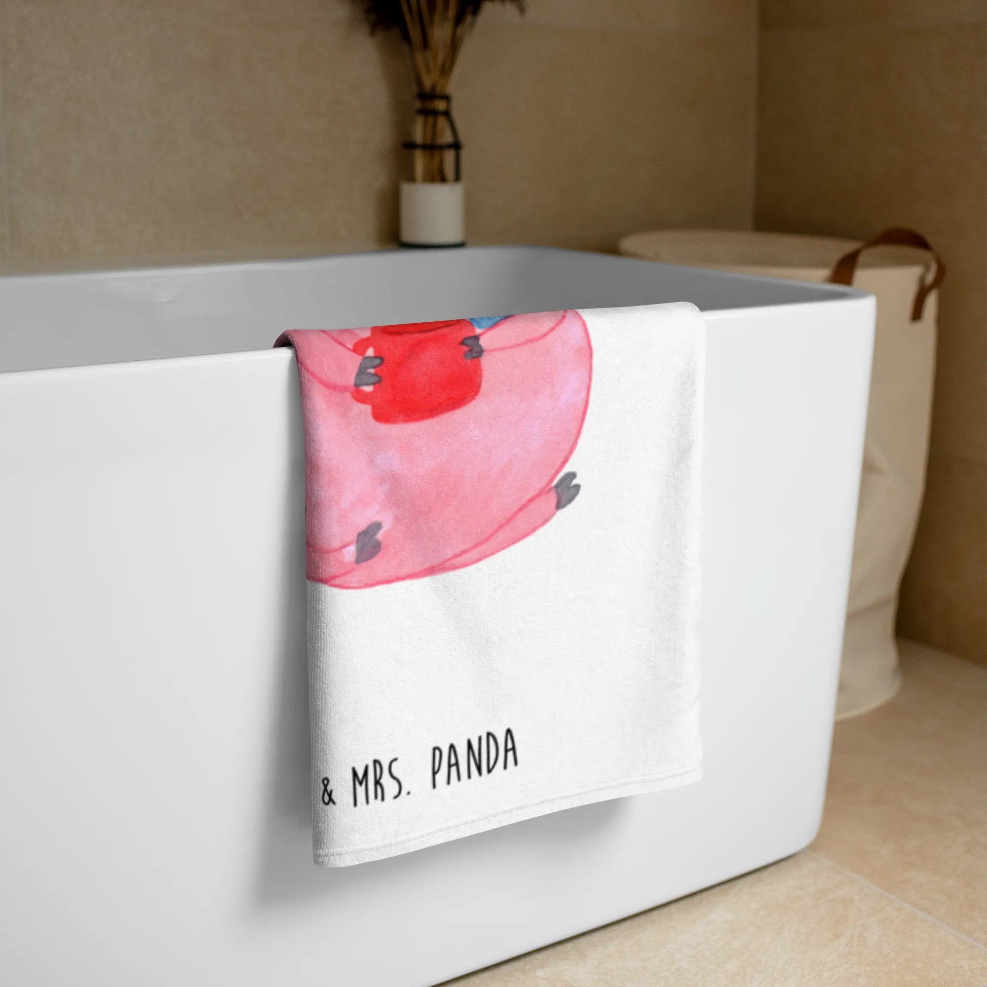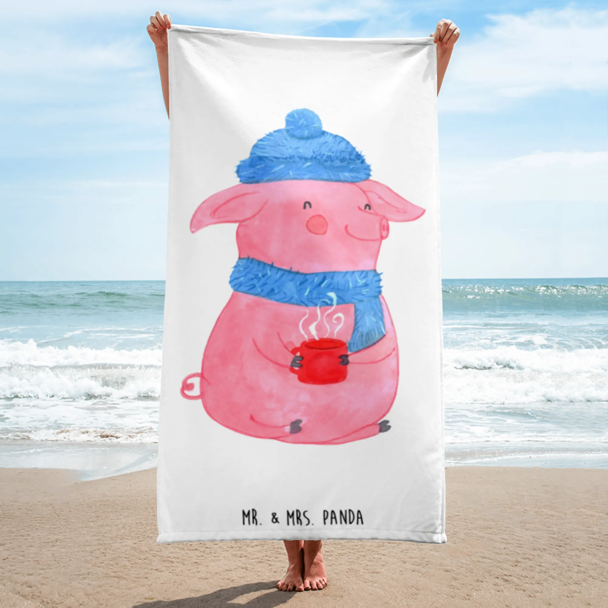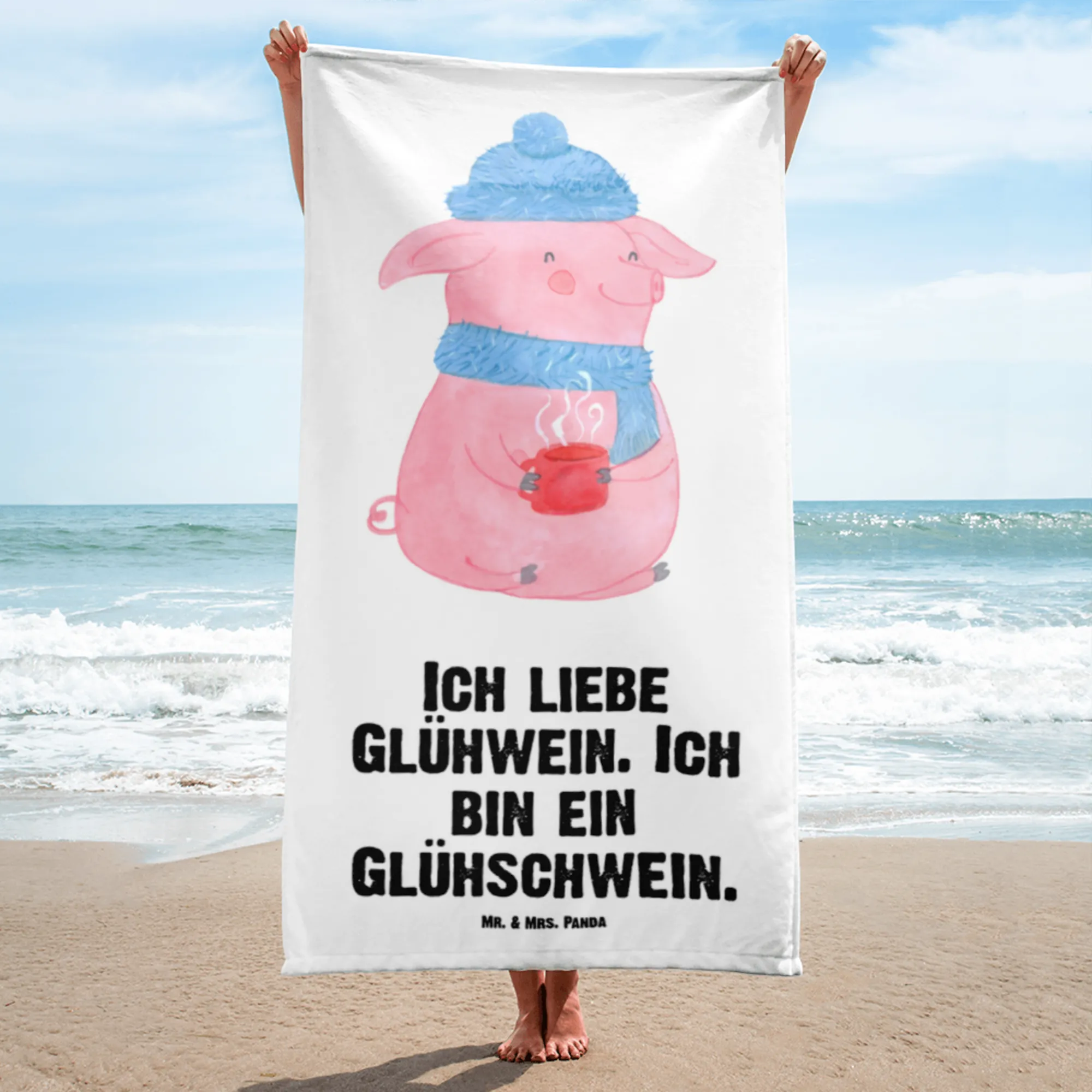 Das XL Badehandtuch Glühschwein aus der Winter Kollektion von Mr. & Mrs. Panda ist das perfekte Geschenk für alle, die die kalte Jahreszeit lieben! Mit seinem liebevollen Design, das ein fröhliches, rosa Schwein zeigt, das mit einem warmen Getränk und winterlicher Kleidung daherkommt, ist es ein echtes Highlight.