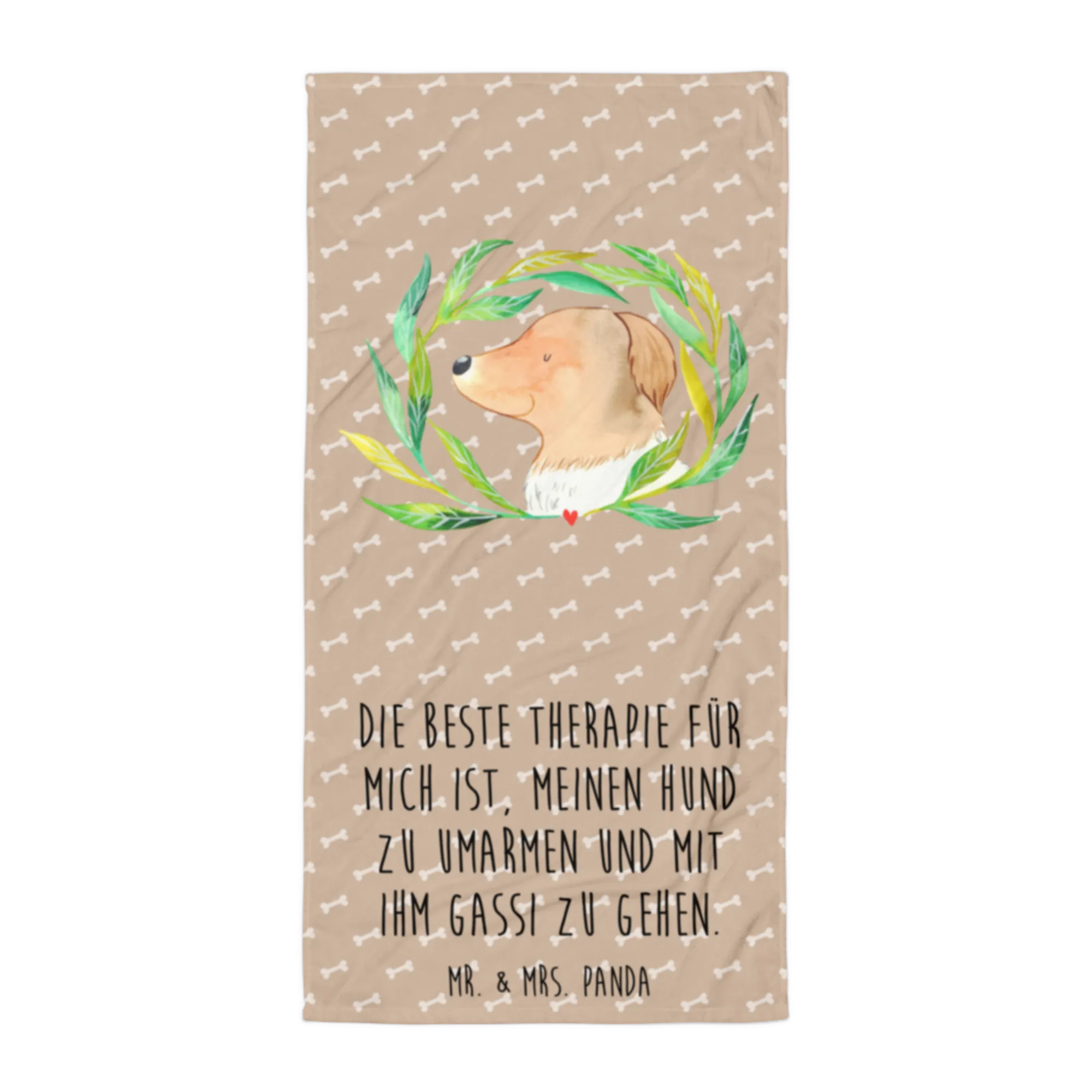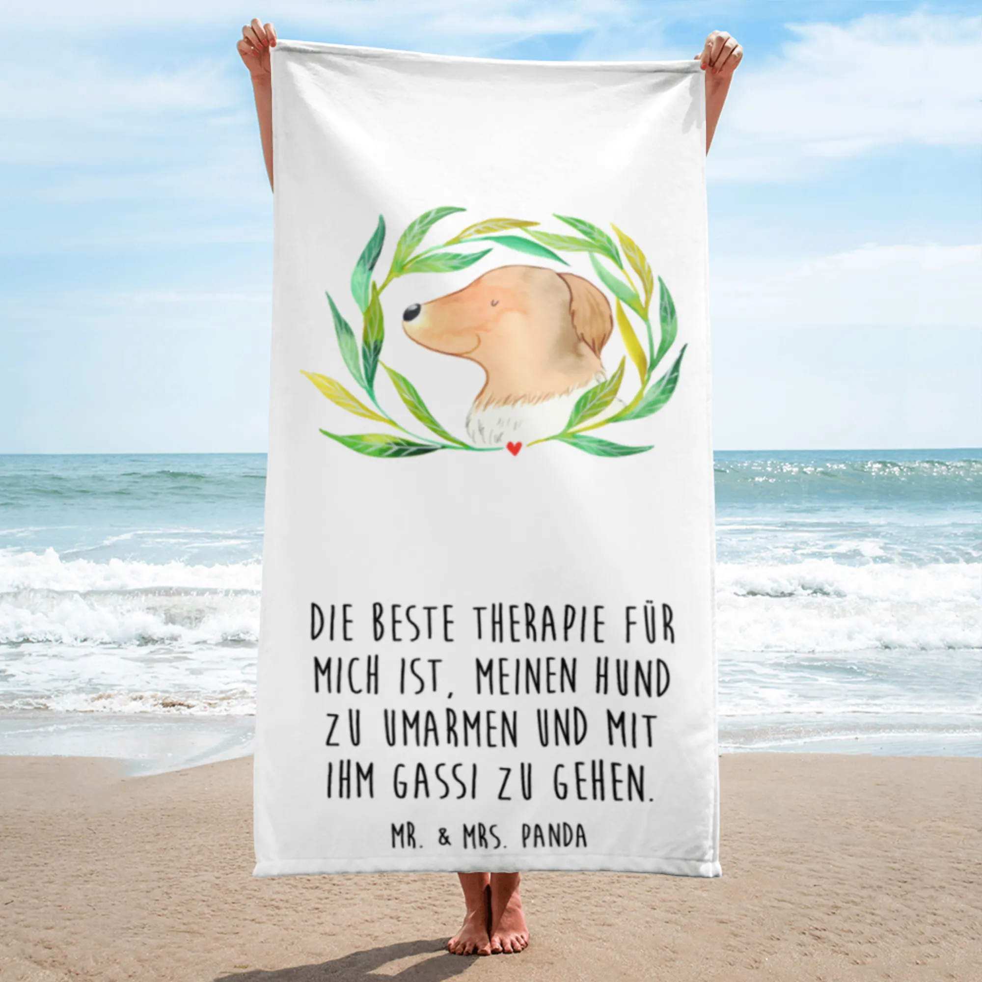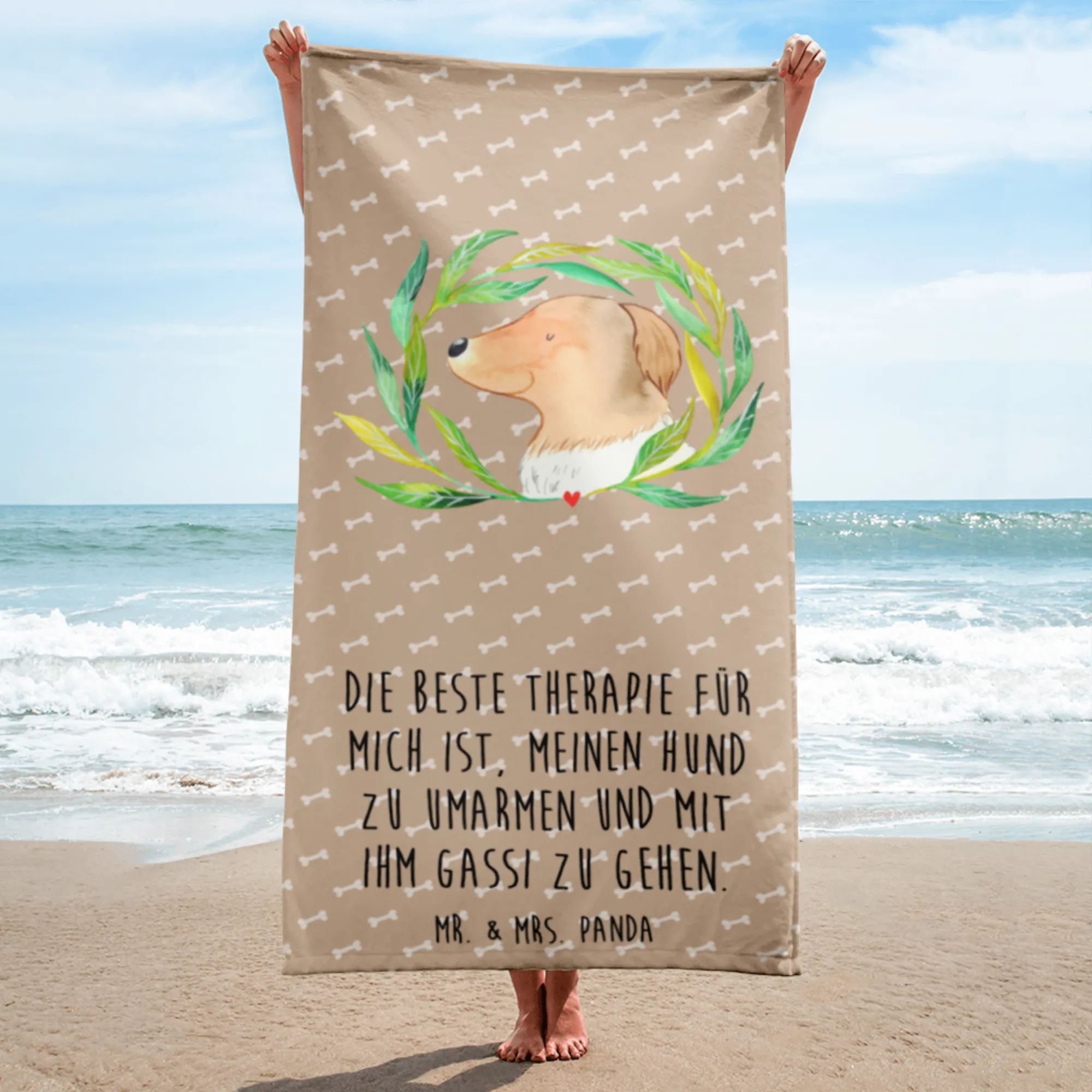 Egal ob im Freizeitbad, am Strand oder in der Sauna - das Handtuch passt zu jedem Anlass. Es erinnert Dich daran, wie wichtig es ist, Zeit mit seinem Hund zu verbringen und die kleinen Momente des Hundeglücks zu genießen. Der Slogan „Die beste Therapie für mich ist, meinen Hund zu umarmen und mit ihm Gassi zu gehen“ bringt es auf den Punkt – und sorgt dafür, dass Du beim Trocknen immer ein Lächeln auf den Lippen hast.