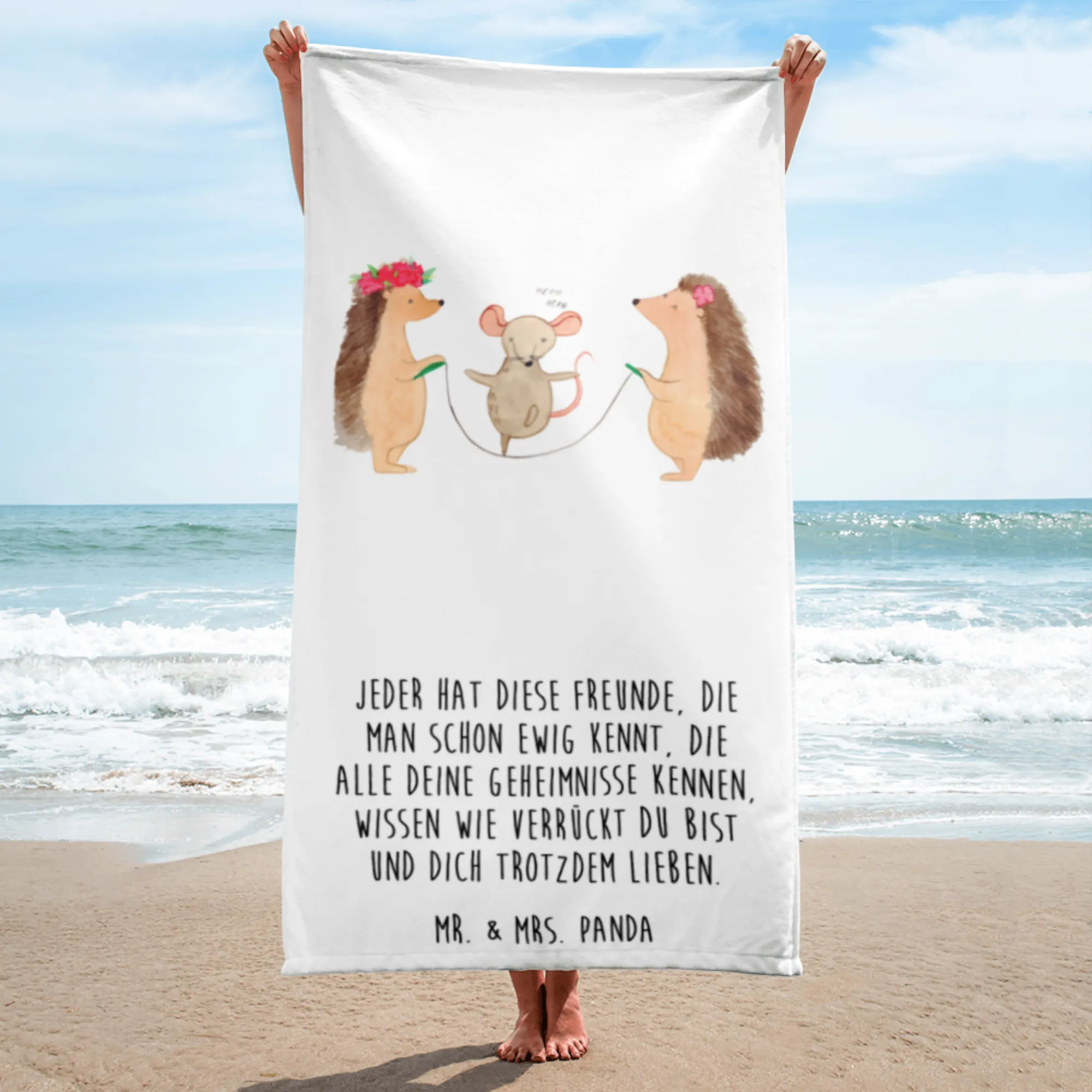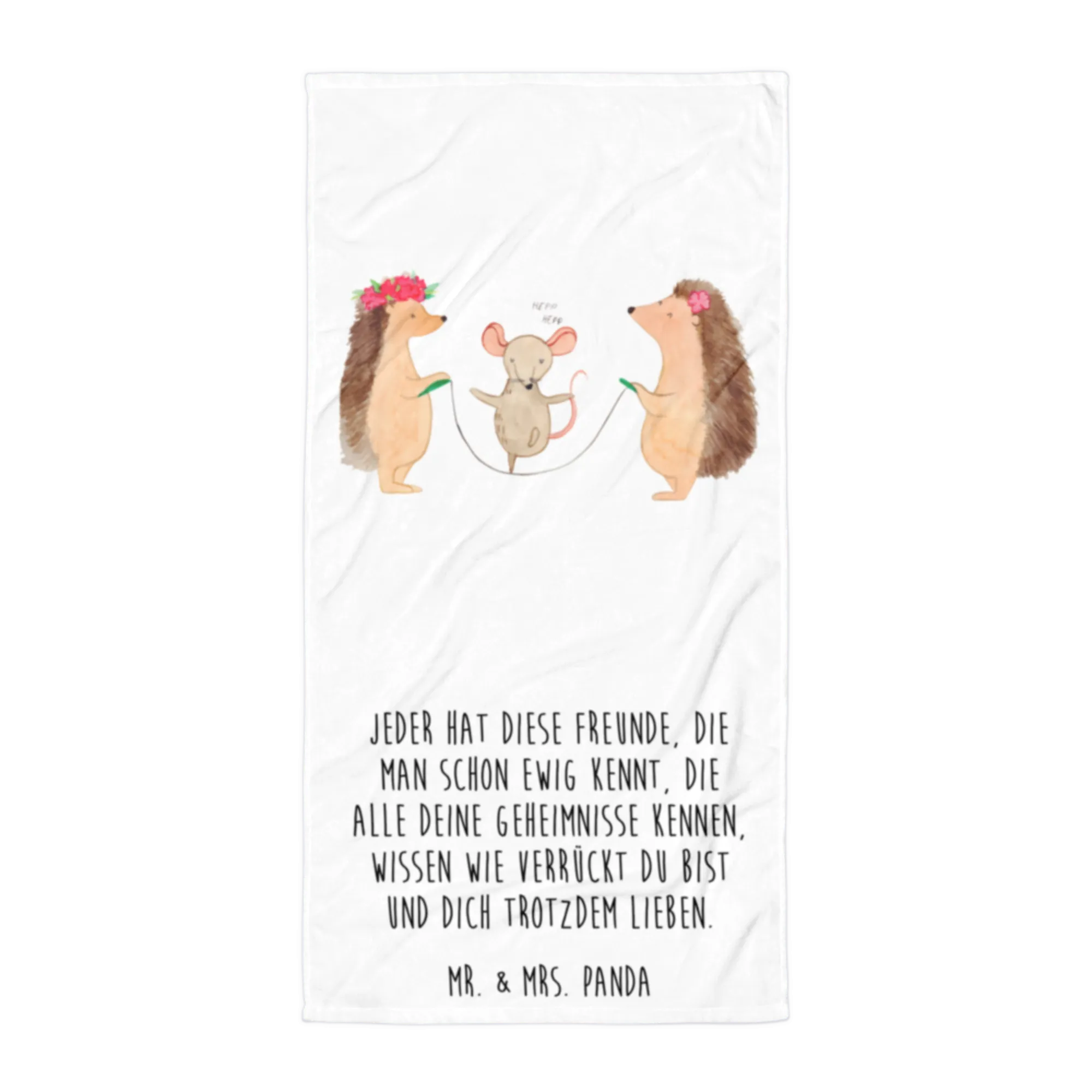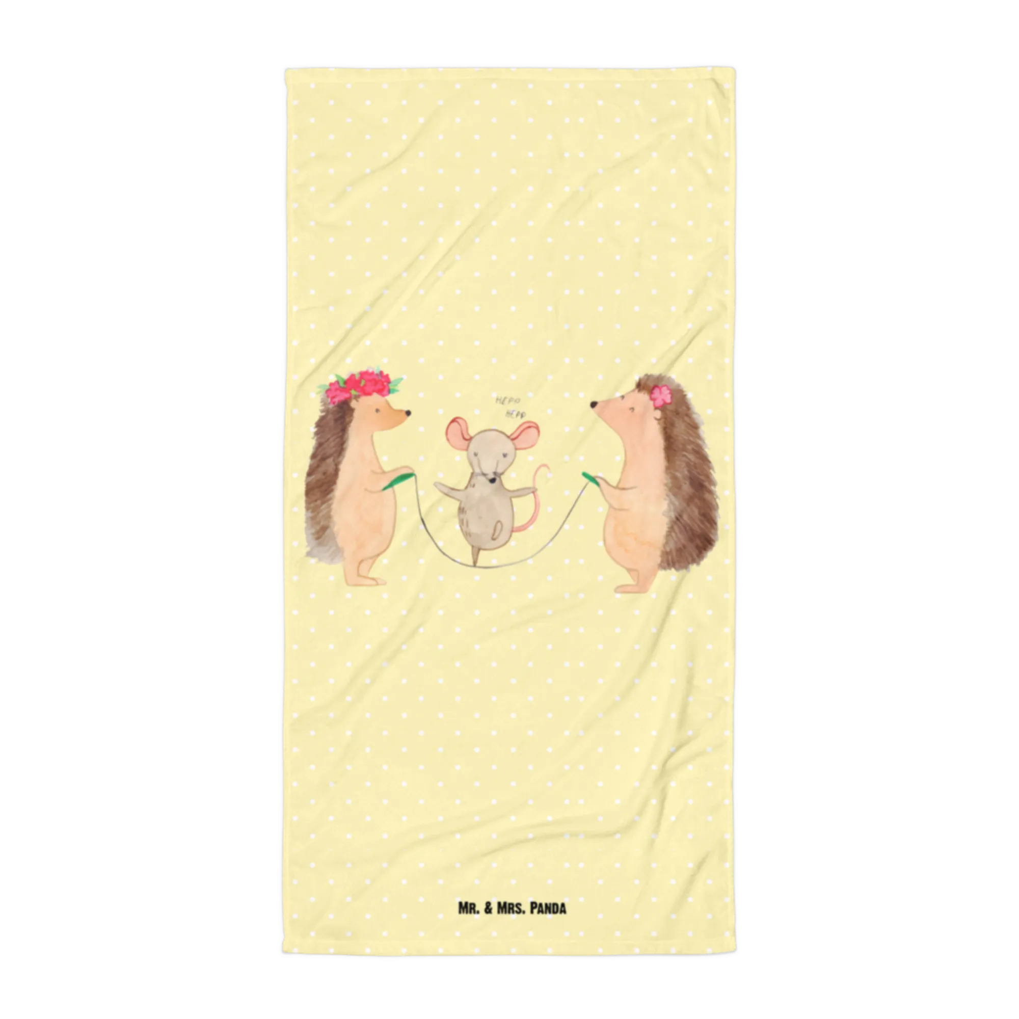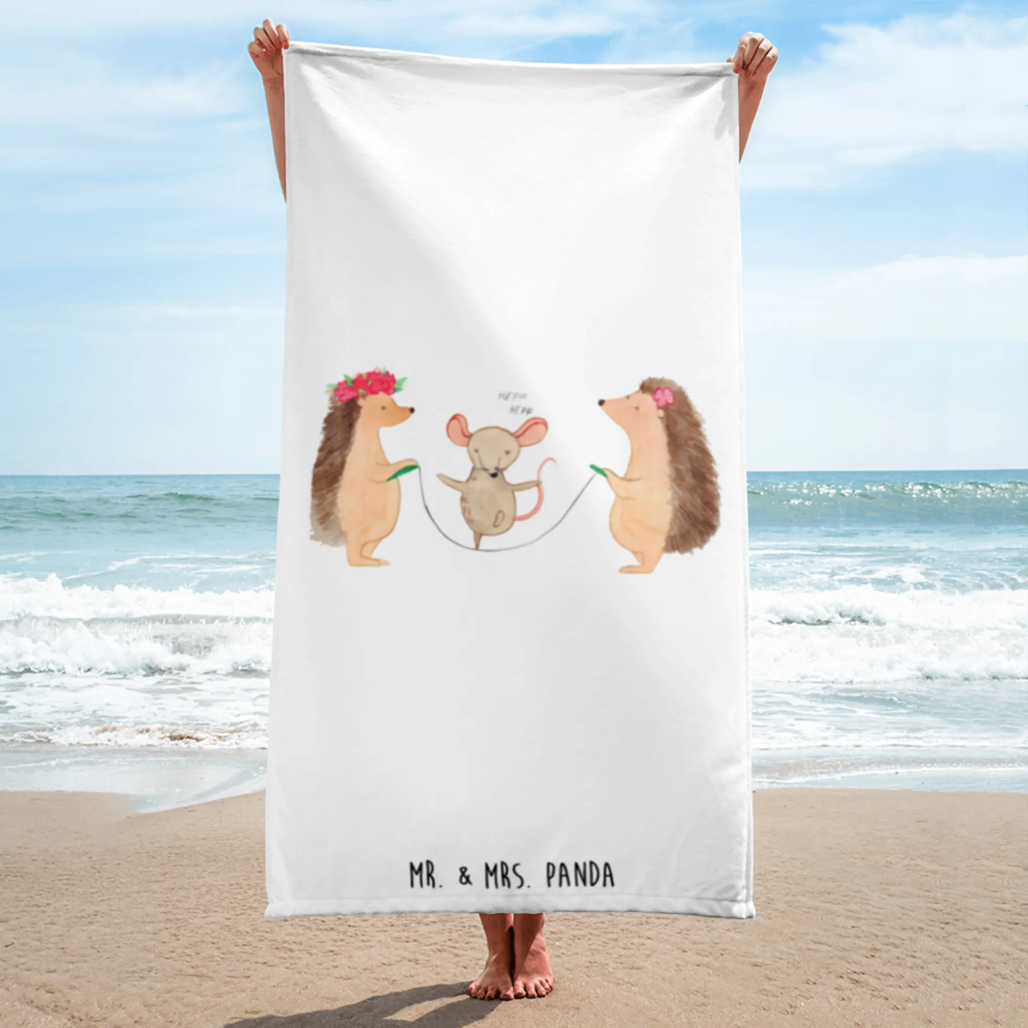 Mit seinen großzügigen Maßen von 1520 mm x 760 mm bietet es genug Platz, um beim Ausflug an den Strand oder im Schwimmbad bequem zu entspannen. Die Vorderseite des Handtuchs ist kunterbunt bedruckt und zeigt ein putziges Igelpaar und eine fröhliche Maus, die gemeinsam Seilspringen. Diese bildschönen Motive drücken Lebensfreude und Zusammenhalt aus und zaubern jedem ein Lächeln ins Gesicht.