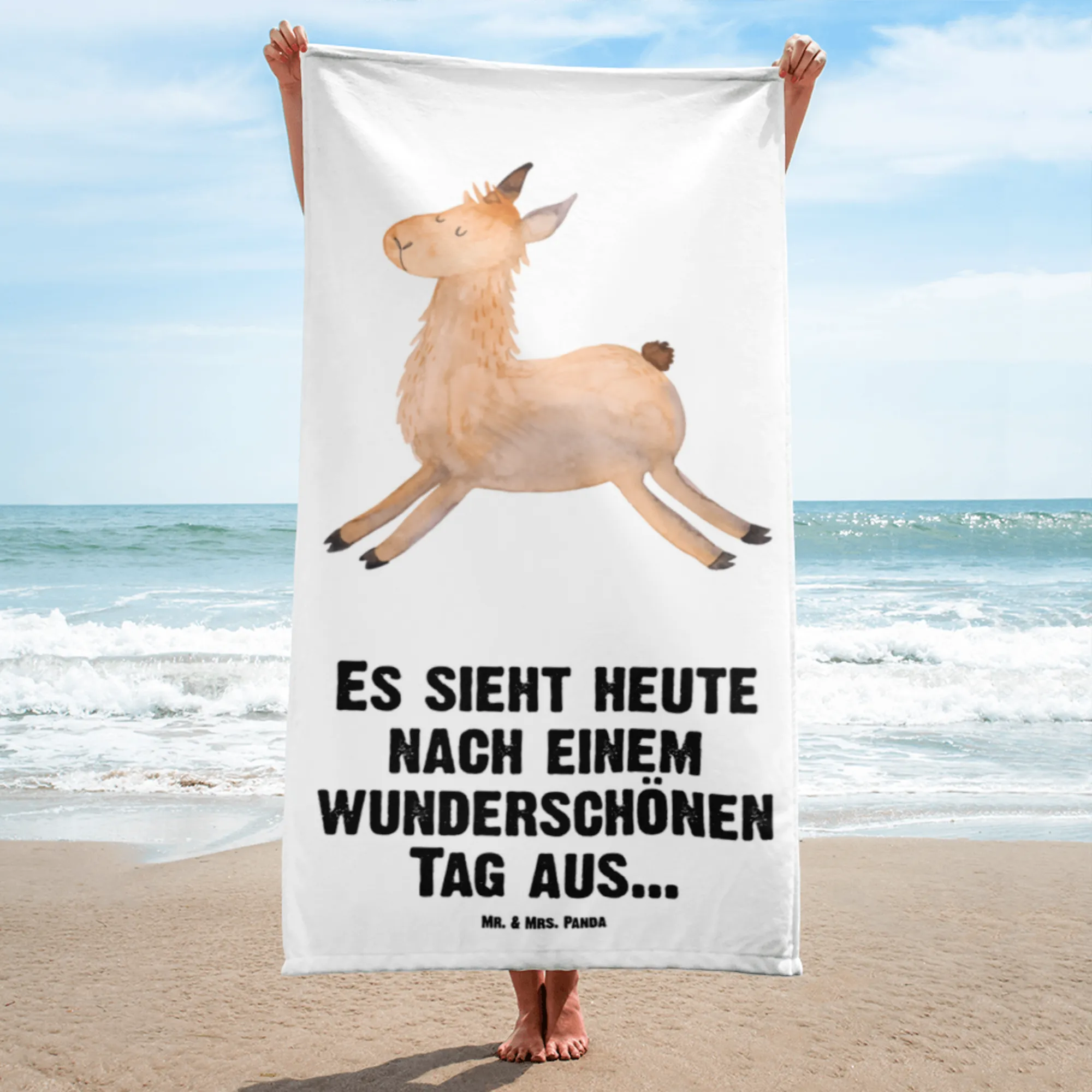 Das perfekte Geschenk für alle Lama-Liebhaber: Unser XL Badehandtuch mit dem fröhlichen Motiv 'Lama springend' aus der exklusiven Lama-Kollektion von Mr. & Mrs. Panda! Mit seinen strahlenden Farben und dem süßen Lama, das begeistert Luftsprünge macht, bringt dieses Handtuch gleich gute Laune und ein Lächeln in jede Badetasche – egal, ob am Strand, im Schwimmbad oder in der Sauna!