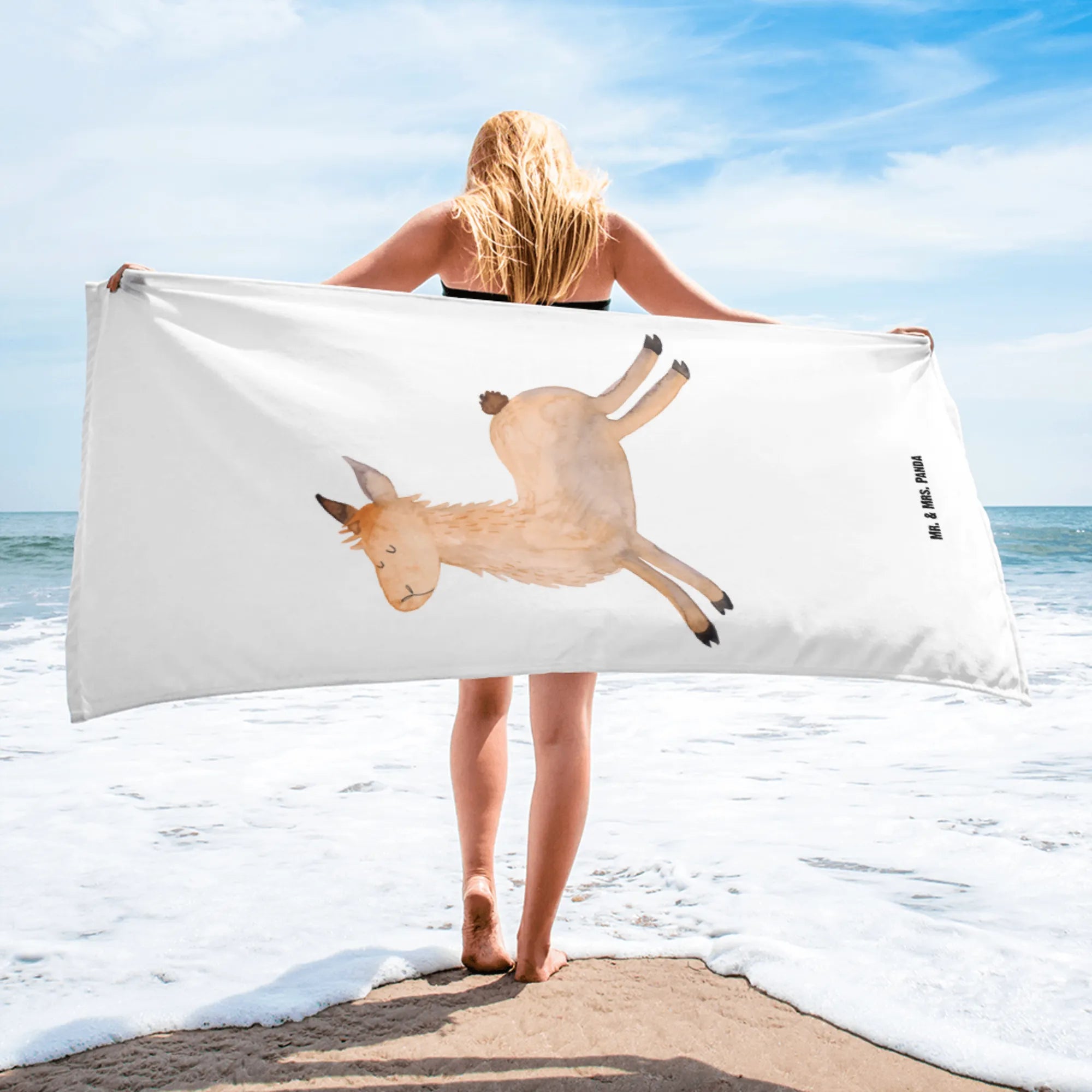 Jedes Design aus unserer Lama-Kollektion wird mit viel Liebe von Mrs. Panda handgezeichnet. Diese Kollektion ist die ideale Zusammenstellung für alle, die Lamas lieben – vom Plüschtier bis hin zur bunten Deko. Egal, ob für den eigenen Gebrauch oder als Geschenk für einen besonderen Menschen – dieses XL Badehandtuch mit dem springenden Lama sorgt für Freude und Glücksmomente!