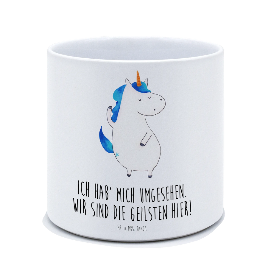 Das Einhorn Mann Motiv hat den frechen Spruch: 'Ich hab' mich umgesehen. Wir sind die Geilsten hier!' Und obendrein ist dieser Blumentopf nicht nur für drinnen, sondern auch für draußen geeignet! Dank des praktischen Entwässerungslochs kommt kein Wasser ins Stocken und deine Pflanzen bleiben gesund und munter. Pflegeleicht und spülmaschinenfest – so macht Gärtnern Spaß!