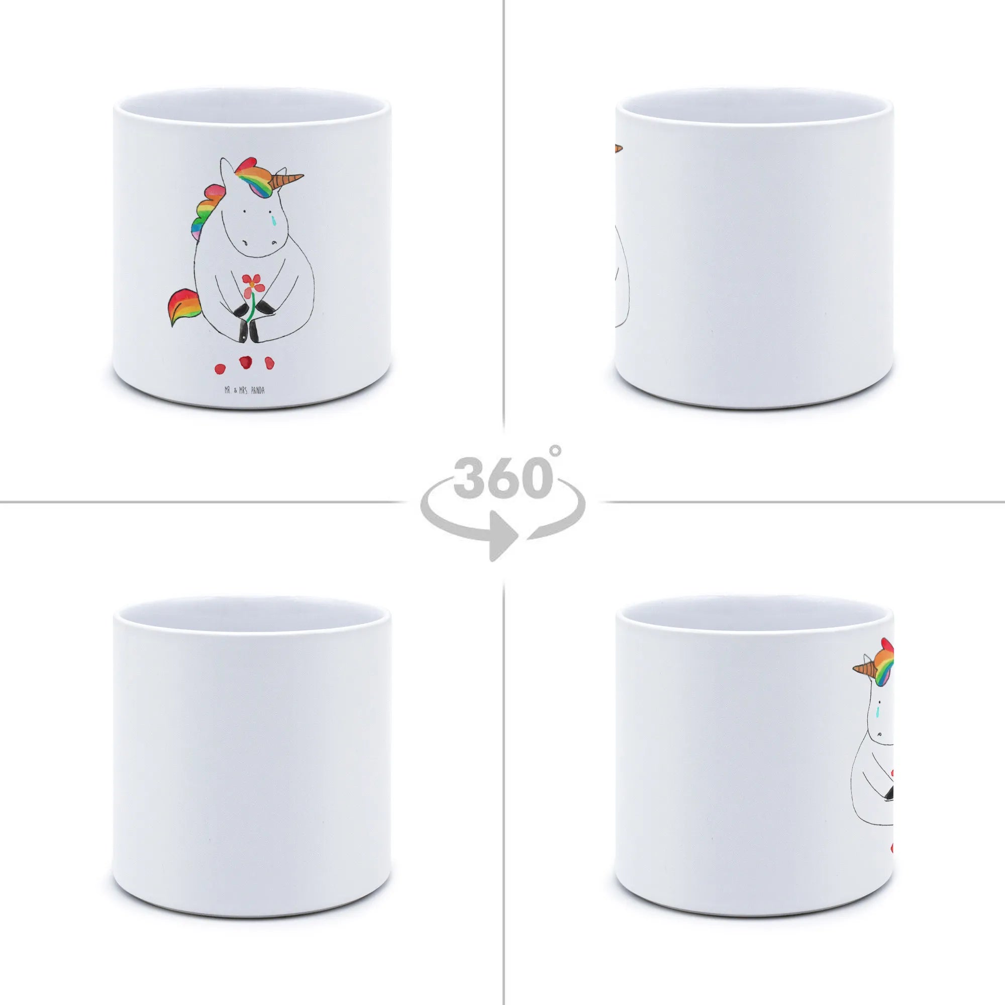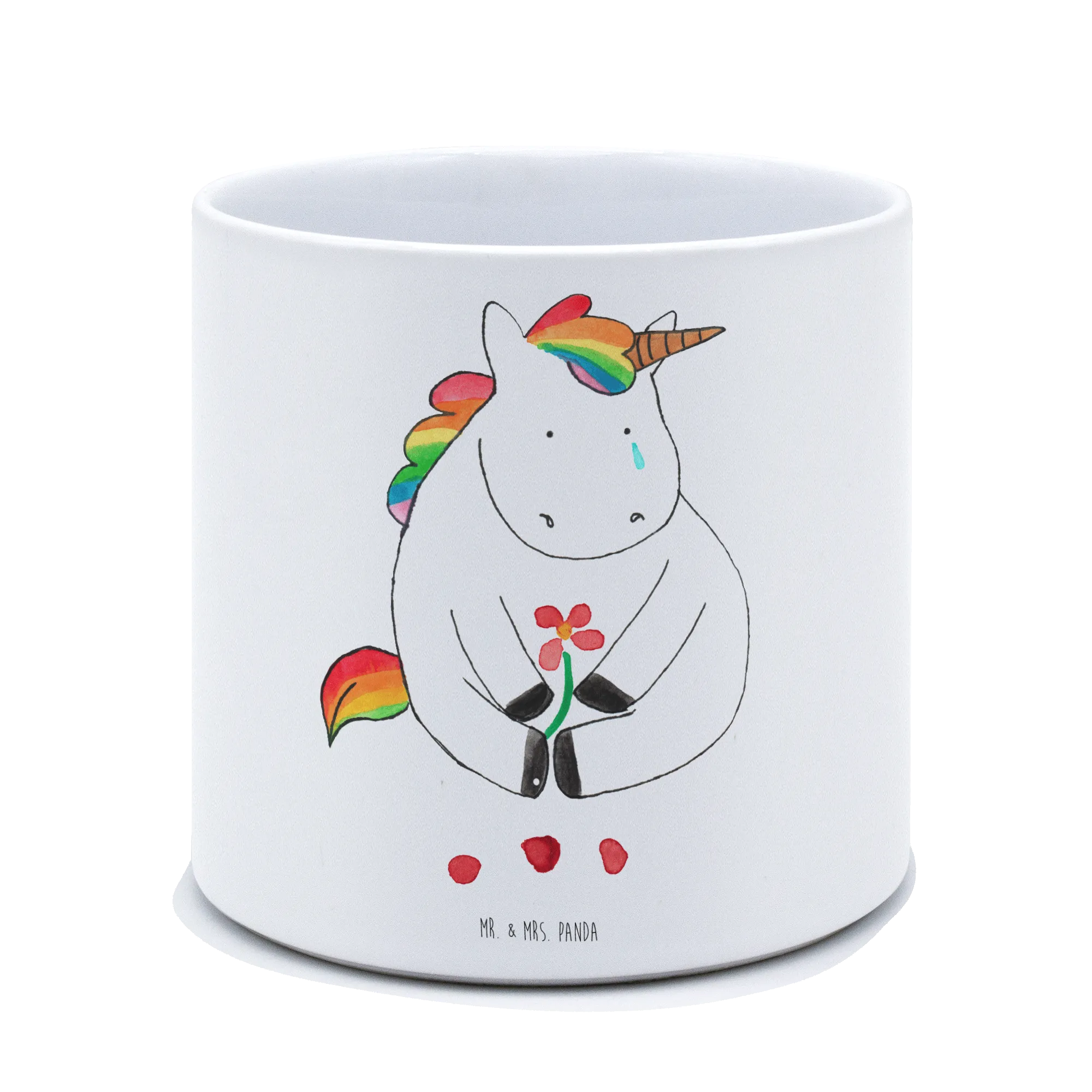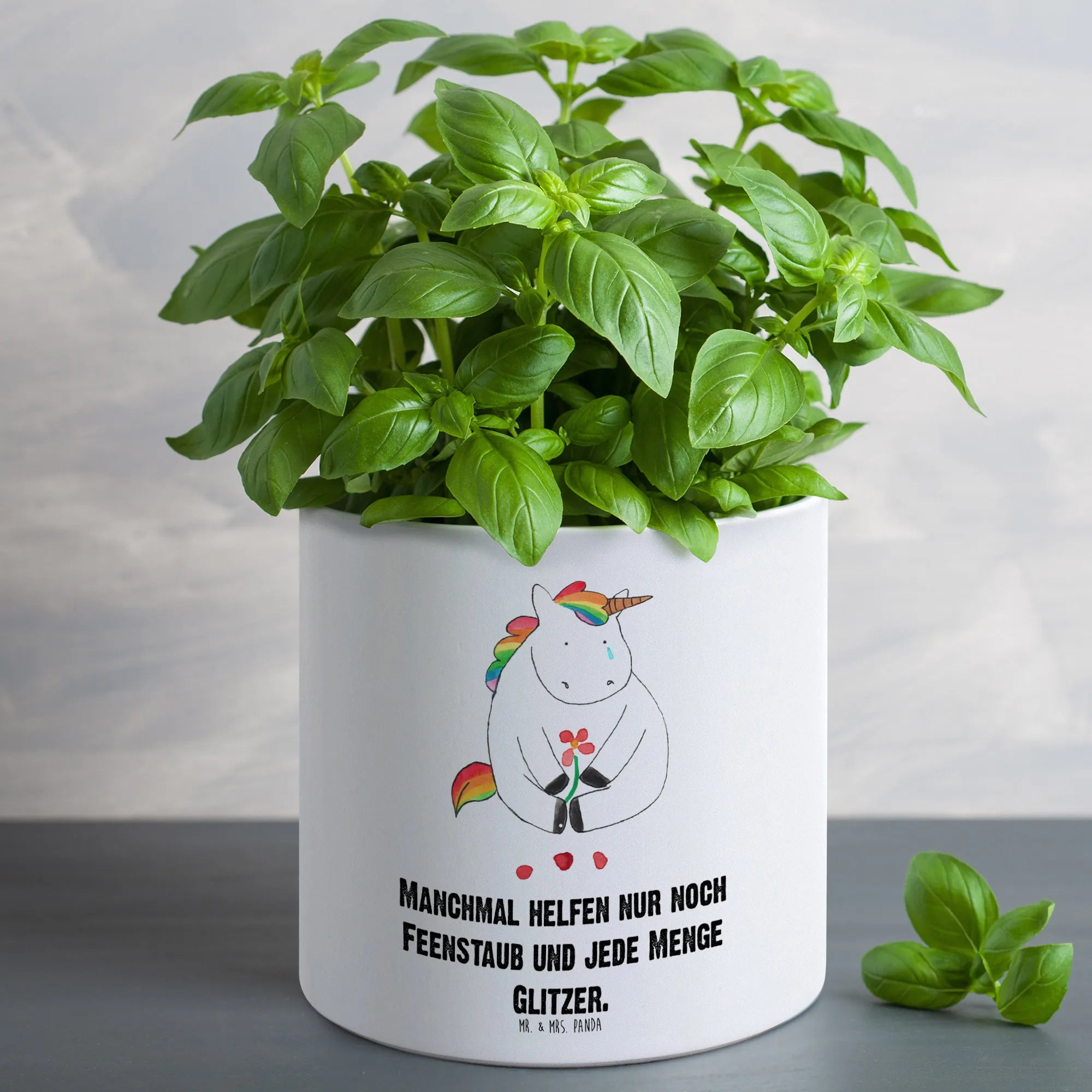 Wenn du auf der Suche nach einem zauberhaften Geschenk bist, dann ist dieser XL Blumentopf mit dem traurigen Einhorn-Design von Mr. & Mrs. Panda genau das Richtige! Dieser einzigartige Keramiktopf hat die Maße von 135 mm in der Höhe und 142 mm im Durchmesser und ist perfekt für all deine Lieblingspflanzen geeignet. Egal, ob du Kräuter, Blumen oder sogar kleine Bäume darin einpflanzen möchtest – der Blumentopf ist sowohl für drinnen als auch für draußen geeignet und sorgt dafür, dass deine Pflanzen immer bestens zur Geltung kommen.