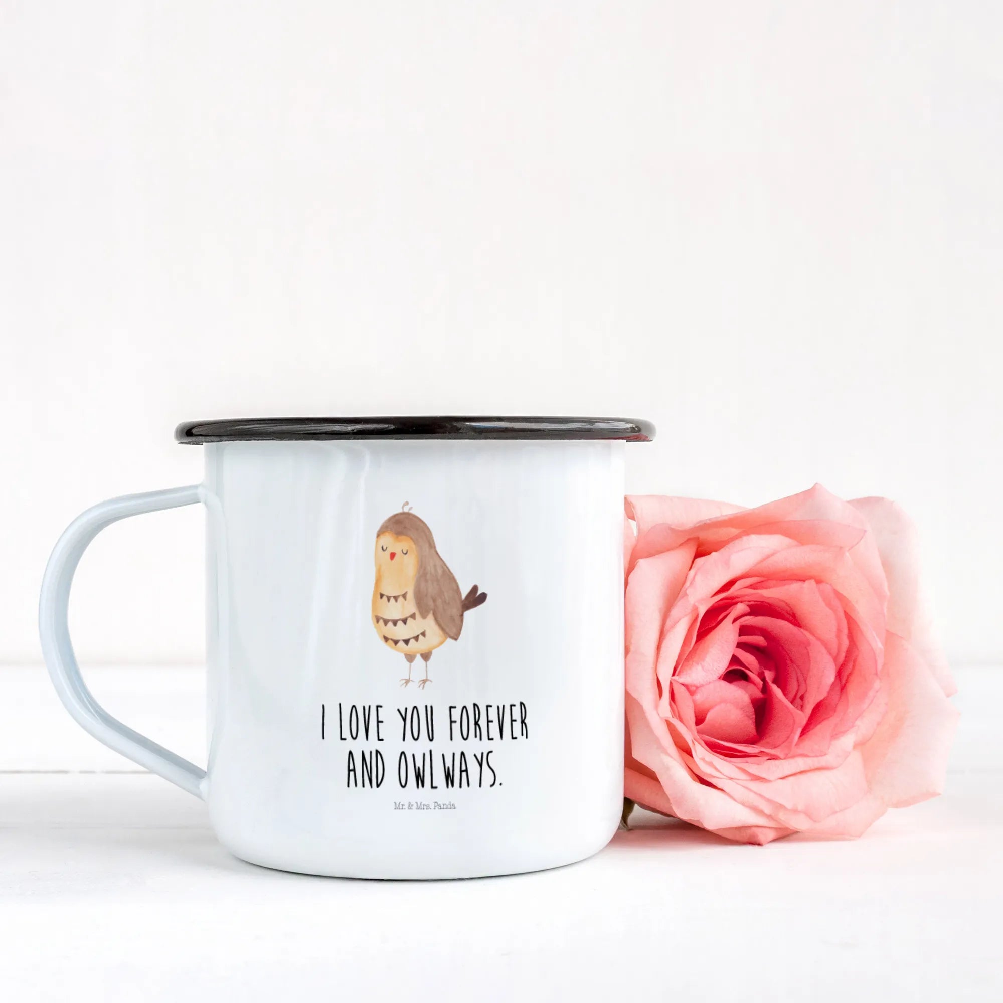 Die XL Emaille Tasse "Eule Zufrieden" von Mr. & Mrs. Panda ist der perfekte Begleiter für jeden Eulenliebhaber. Egal, ob du die Tasse für einen gemütlichen Abend zu Hause oder für dein nächstes Campingabenteuer verwenden möchtest, diese Tasse ist immer eine gute Wahl. Mit einem großzügigen Füllvolumen von 450 ml passt genug Kaffee, Tee oder heiße Schokolade hinein, um dich warm und zufrieden zu halten. Besonders leicht und bruchsicher ist sie ideal für Outdoor-Aktivitäten.
