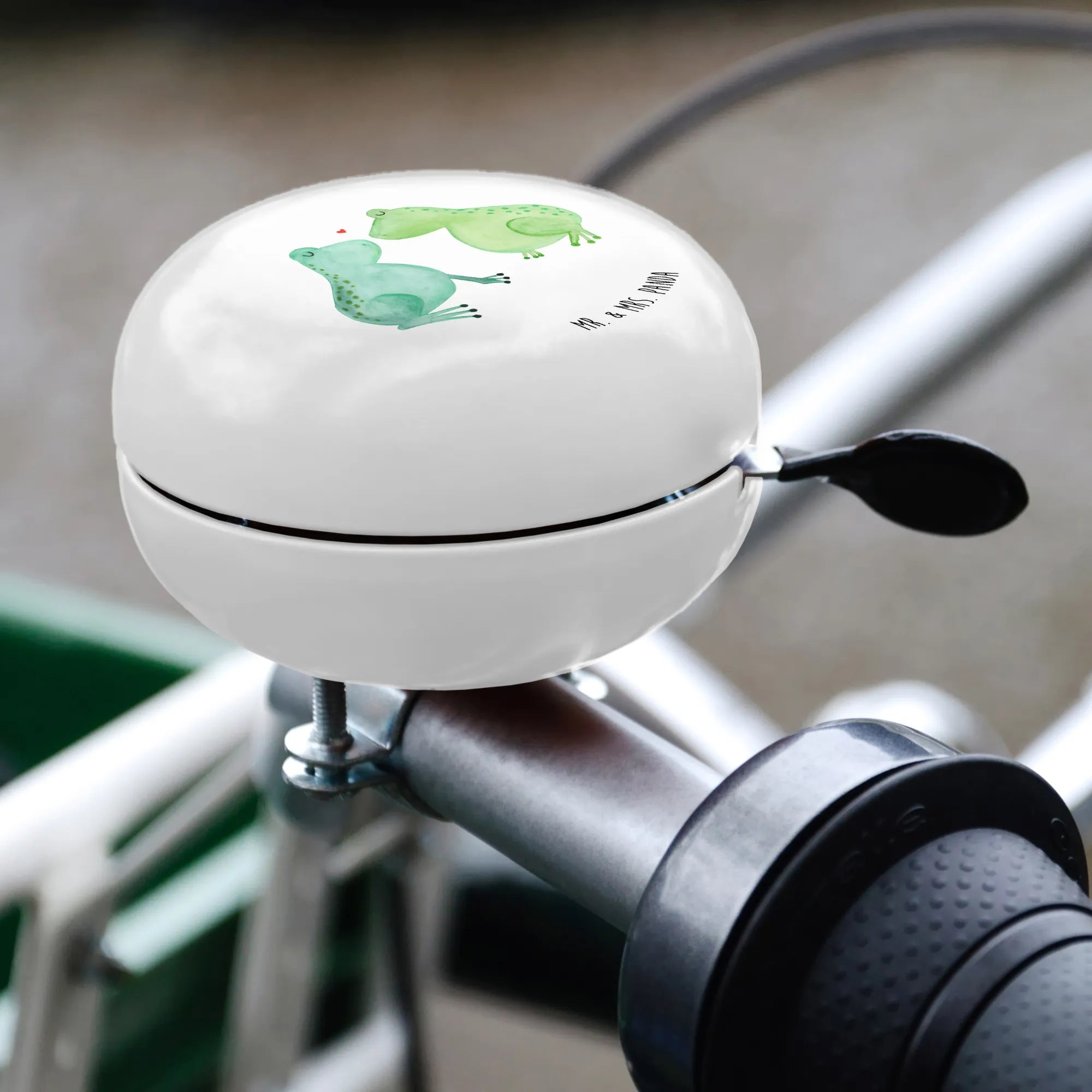 Die XL Fahrradklingel Frosch Liebe von Mr. & Mrs. Panda ist das perfekte Geschenk für alle, die die Liebe in ihrem Leben feiern wollen. Stell dir vor, du bist auf deinem Fahrrad unterwegs, und mit einem fröhlichen Klingeln zeigst du der Welt, wie glücklich du bist! Diese einzigartige Klingel begeistert mit einem niedlichen Design, das zwei verliebte Frösche zeigt, die sich gegenüberstehen, mit einem kleinen roten Herz zwischen ihren Köpfen. Die sanften Grüntöne und die freundlichen Gesichtsausdrücke der Frösche verbreiten sofort gute Laune und das Gefühl, dass Liebe überall zu finden ist.